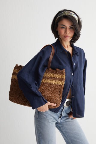 Bir lacivert elbise ve hasır çanta.