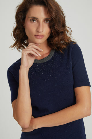 Lacivert Kaşmir Yün Merril Yuvarlak Yaka Taş Süs Detaylı Kısa Kollu Triko