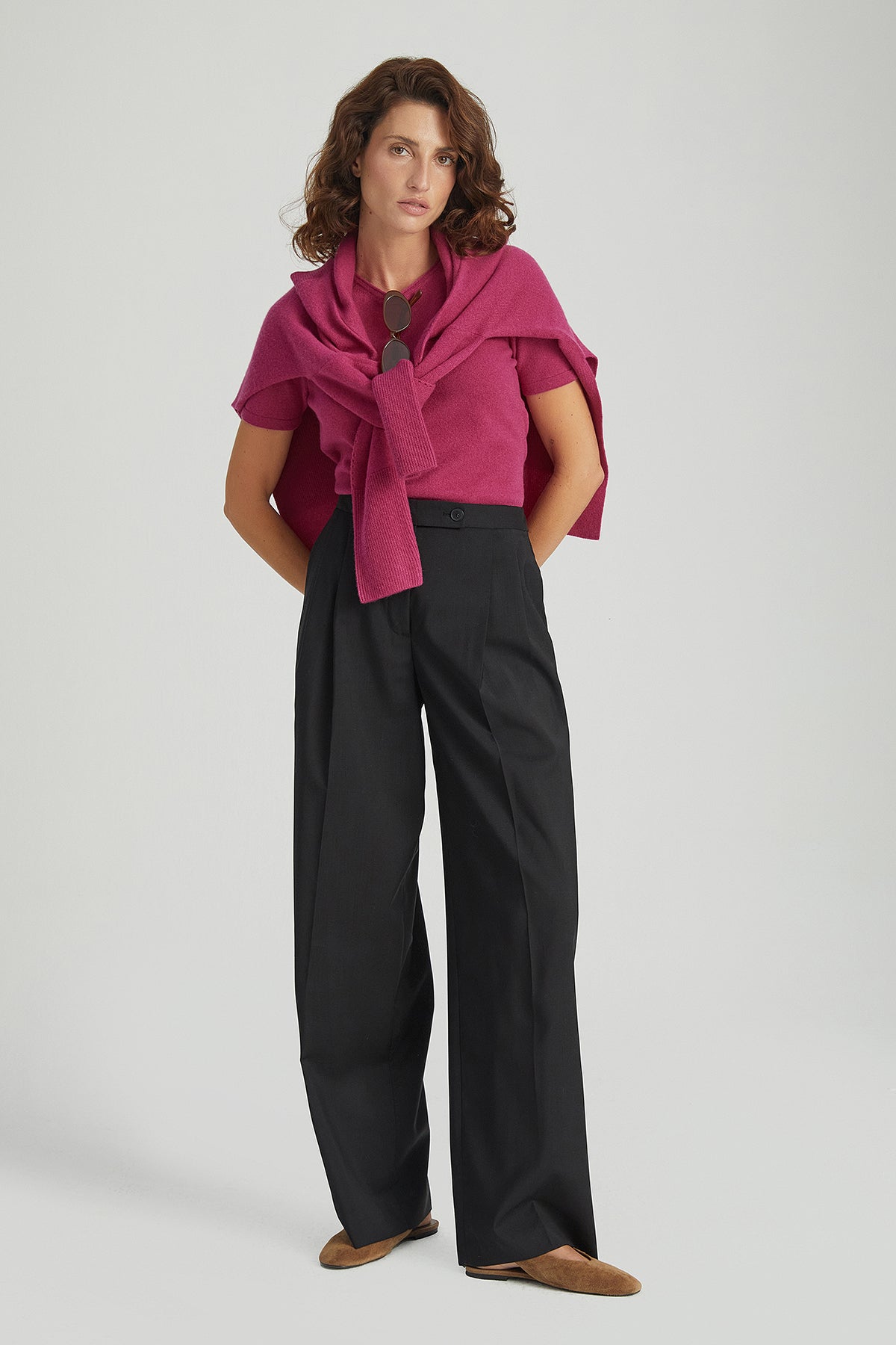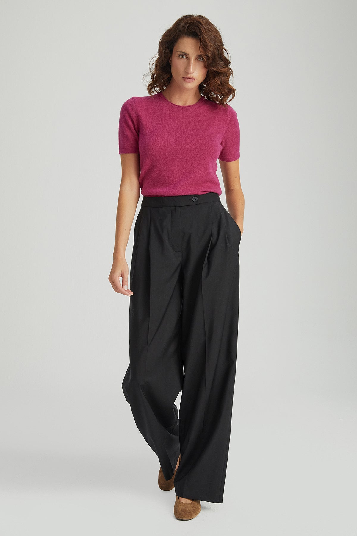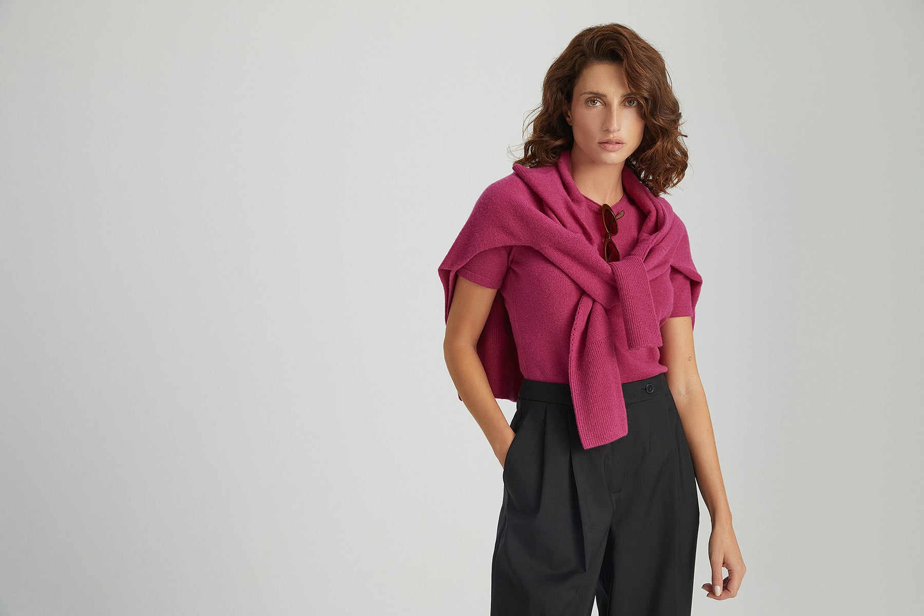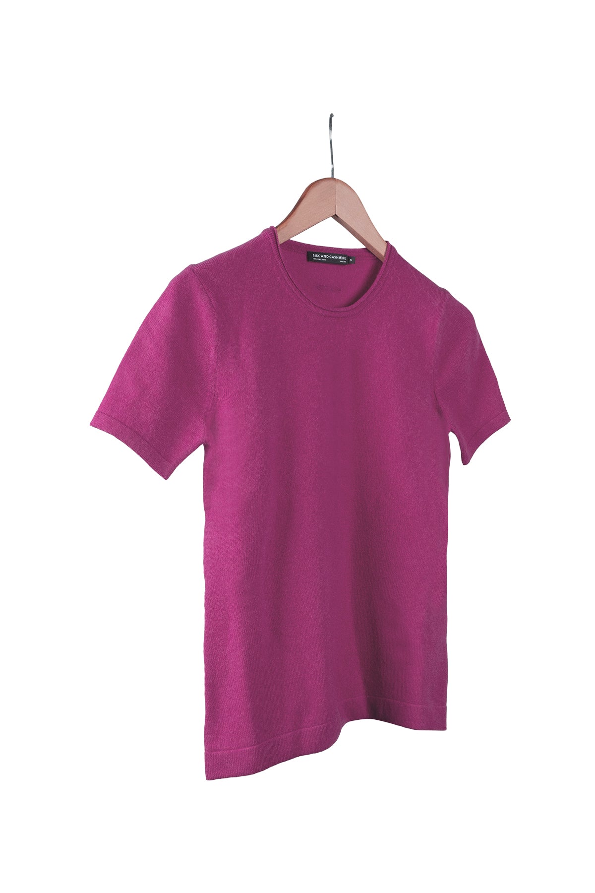 Koyu pembe tonlarındaki bu saf kaşmir tişört, sıcak ve canlı rengiyle dikkat çekerken %100 kaşmir dokusuyla cildinizde yumuşak bir his bırakır. Bisiklet yaka ve kısa kol tasarımıyla, hem günlük kullanıma hem de serin havalarda farklı kombinlerle ideal bir parça olarak öne çıkar. Hafif yapısı ve konforlu kesimi, dört mevsim boyunca keyifle kullanılabilecek rahatlıkta bir tişört sunar.