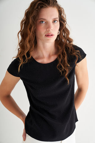 Siyah Nature Saf İpek Taş Süslemeli Yuvarlak Yaka Kısa Kollu Bluz