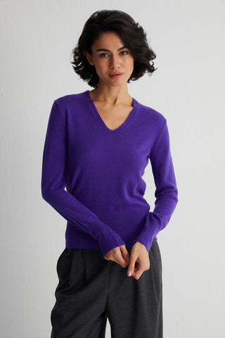Koyu Mor Franca Saf Kaşmir Derin V Yaka Kazak