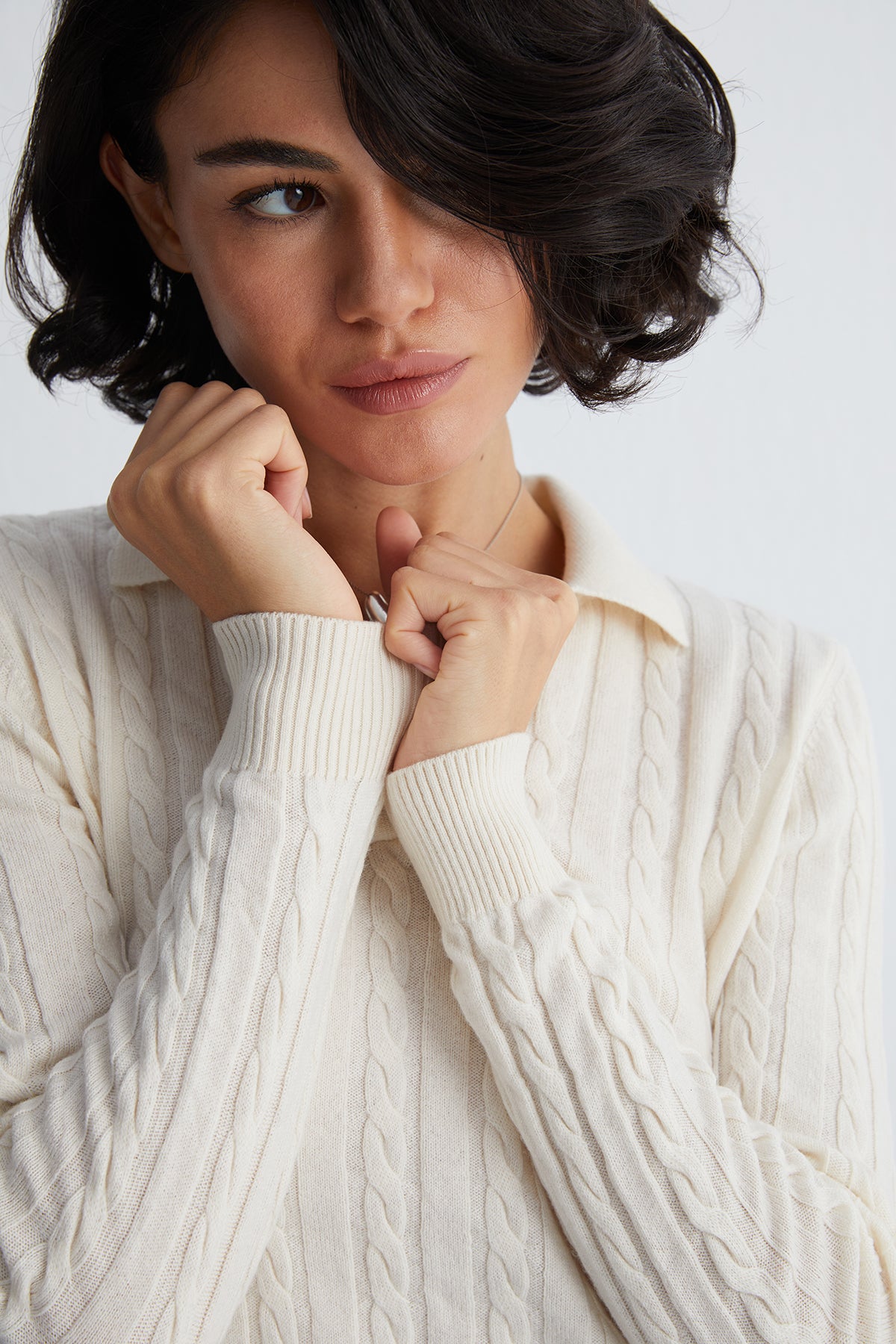 Zarif çizgilere sahip Amelia polo yaka crop kazak, doğal yün ve kaşmir karışımından doğan yumuşaklığıyla bedeninize incelikle uyum sağlar. Zamansız burgu örgü dokusu ve dikkatle şekillendirilmiş crop kesimiyle, klasik ve çağdaş detayları bir araya getirerek dolabınıza yeni bir karakter kazandırır.