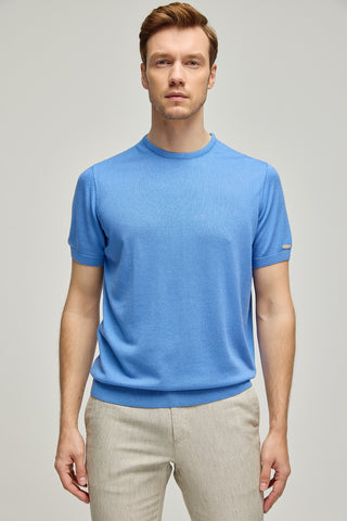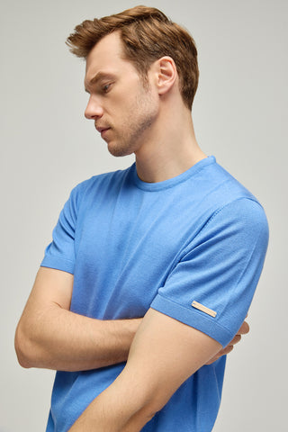 Mavi İpek Kaşmir Utku Yuvarlak Yaka Kısa Kollu Erkek Triko Tişört