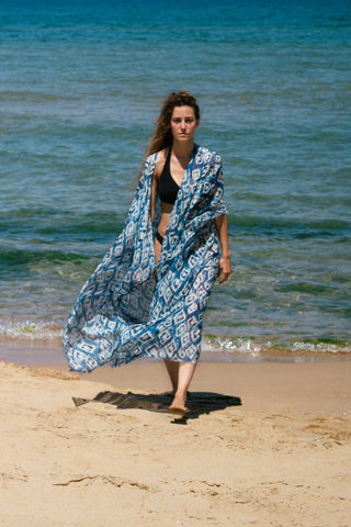 Mavi Jas İpekli Desenli Kısa Kollu Uzun Kimono Hırka