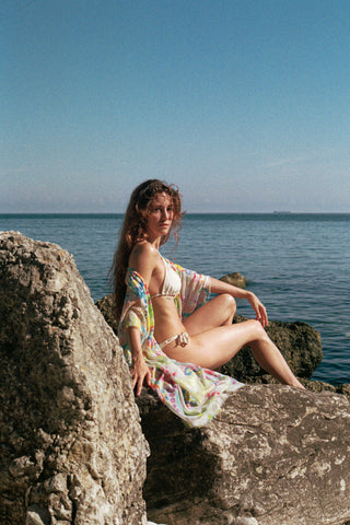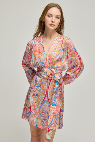 Mercan Jas İpekli Desenli Kısa Kollu Kimono Hırka