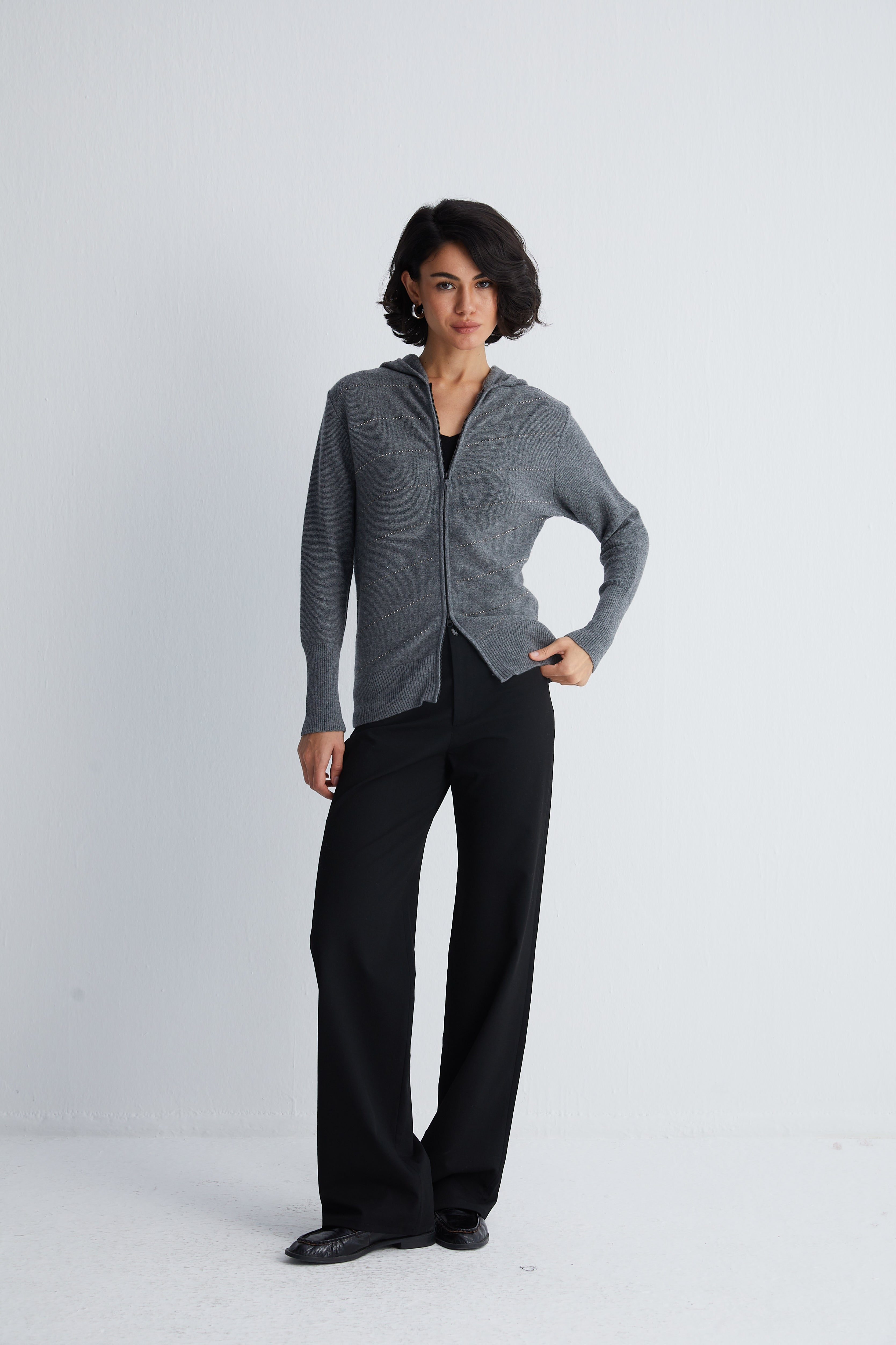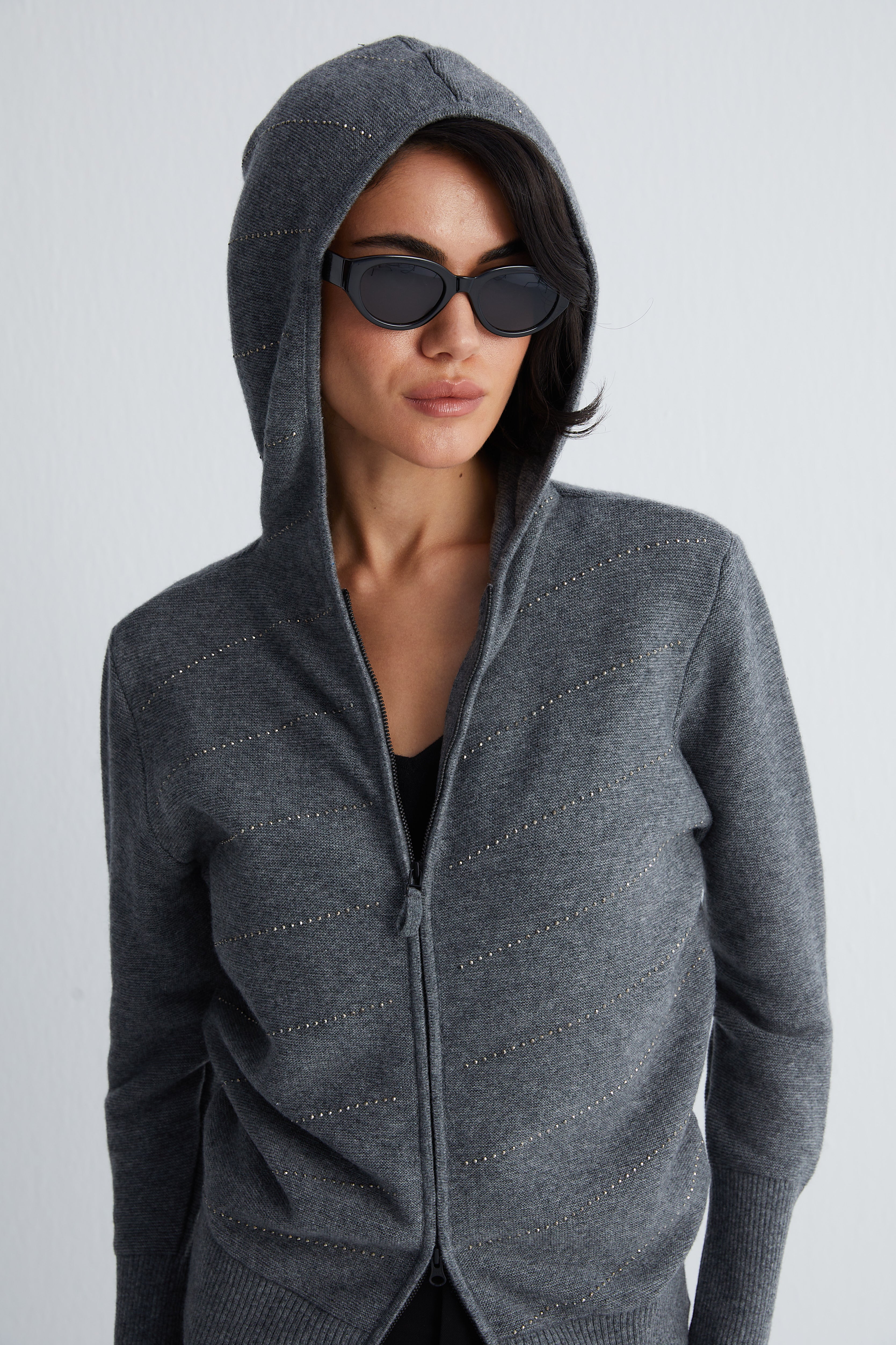 Gri Sky Kaşmirli Taşlı Kapüşonlu Hırka