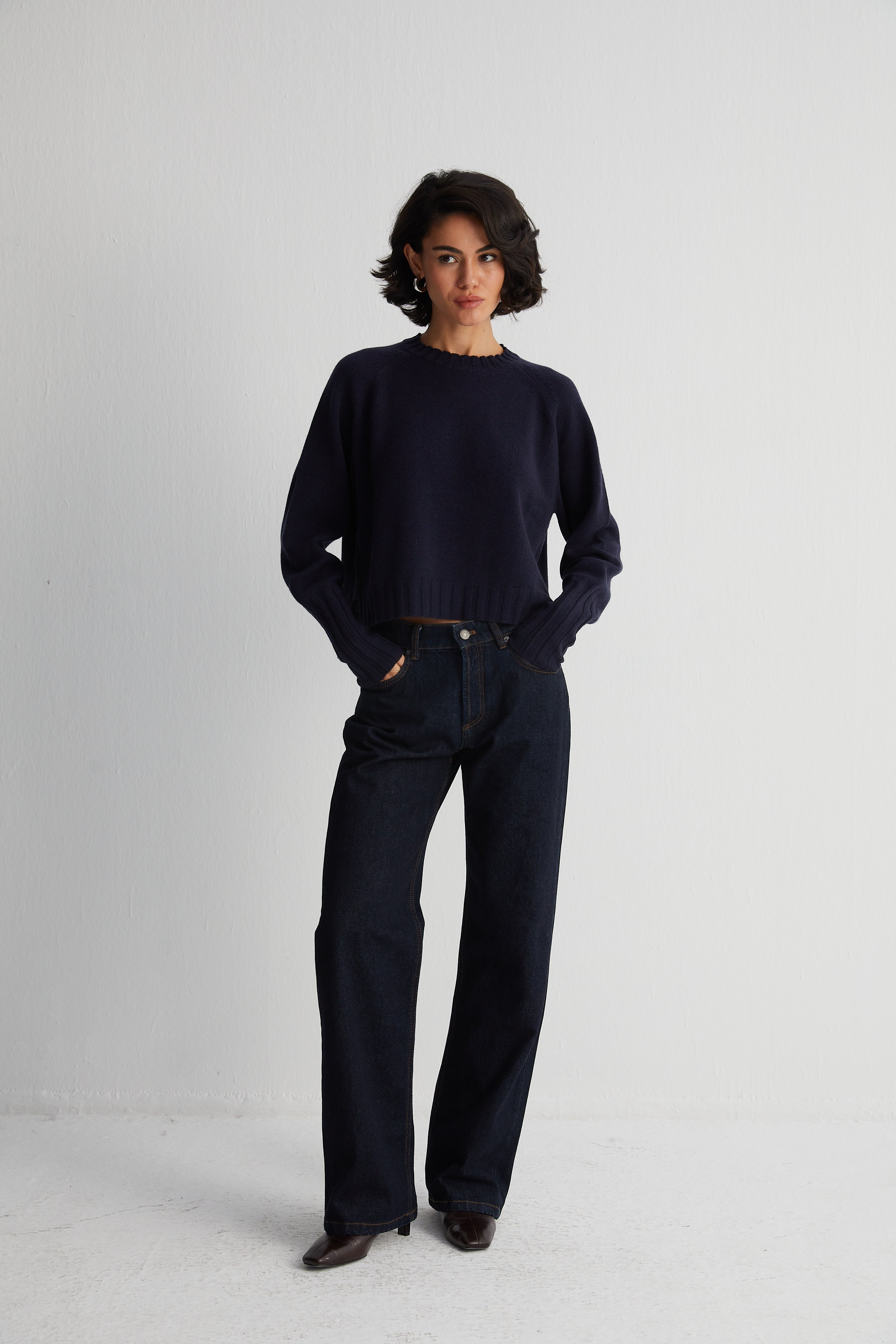 Vanessa Crop Kazak, saf kaşmirin yoğun sıcaklığını ve narin dokusunu modern bir siluette buluşturuyor. Lacivertin derin tonuyla öne çıkan bu parça, kısa kesimiyle dinamizm katarken, güçlü bir yalınlık hissi sunuyor. Gardırobunuza zamana karşı dirençli bir karakter kazandırır.
