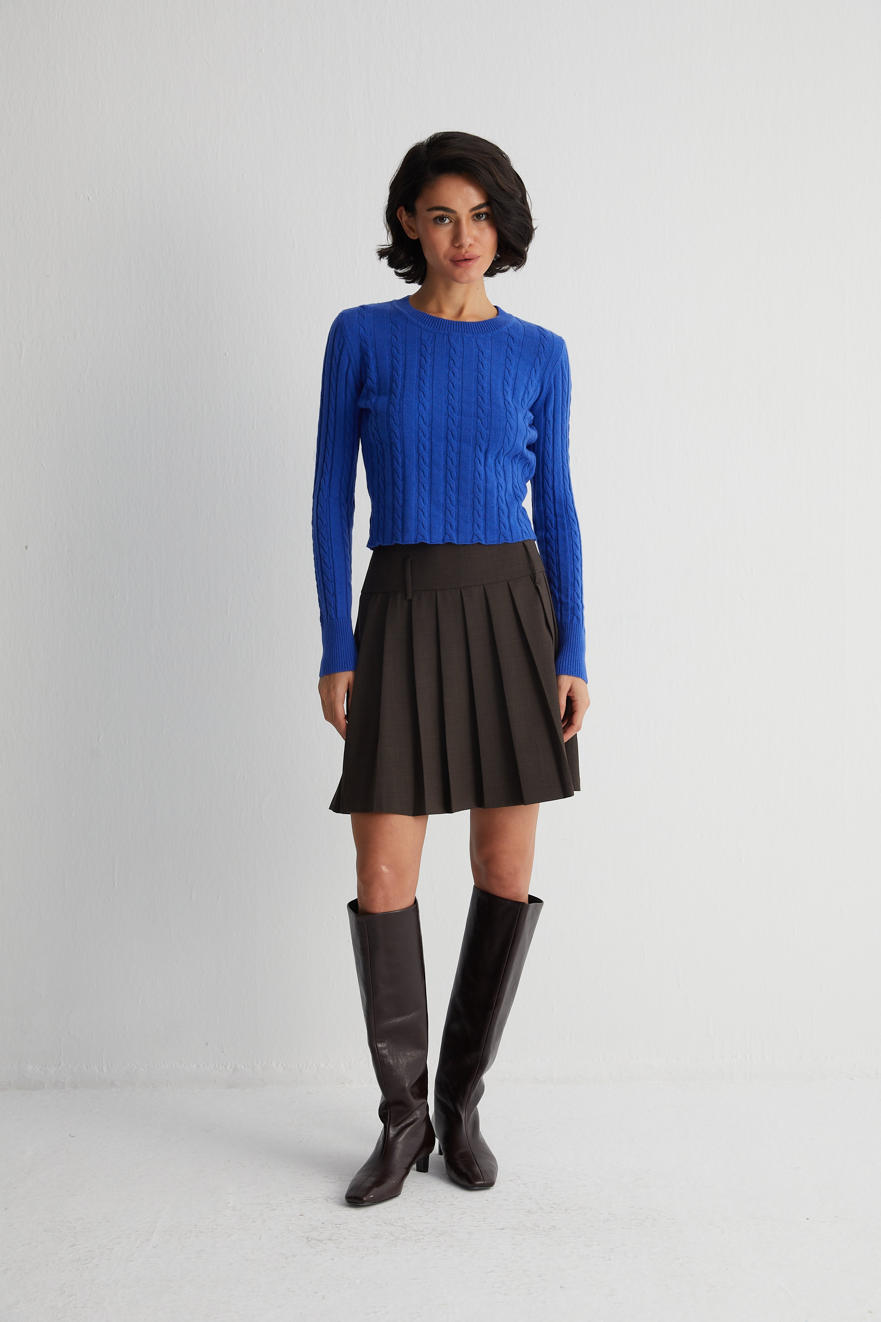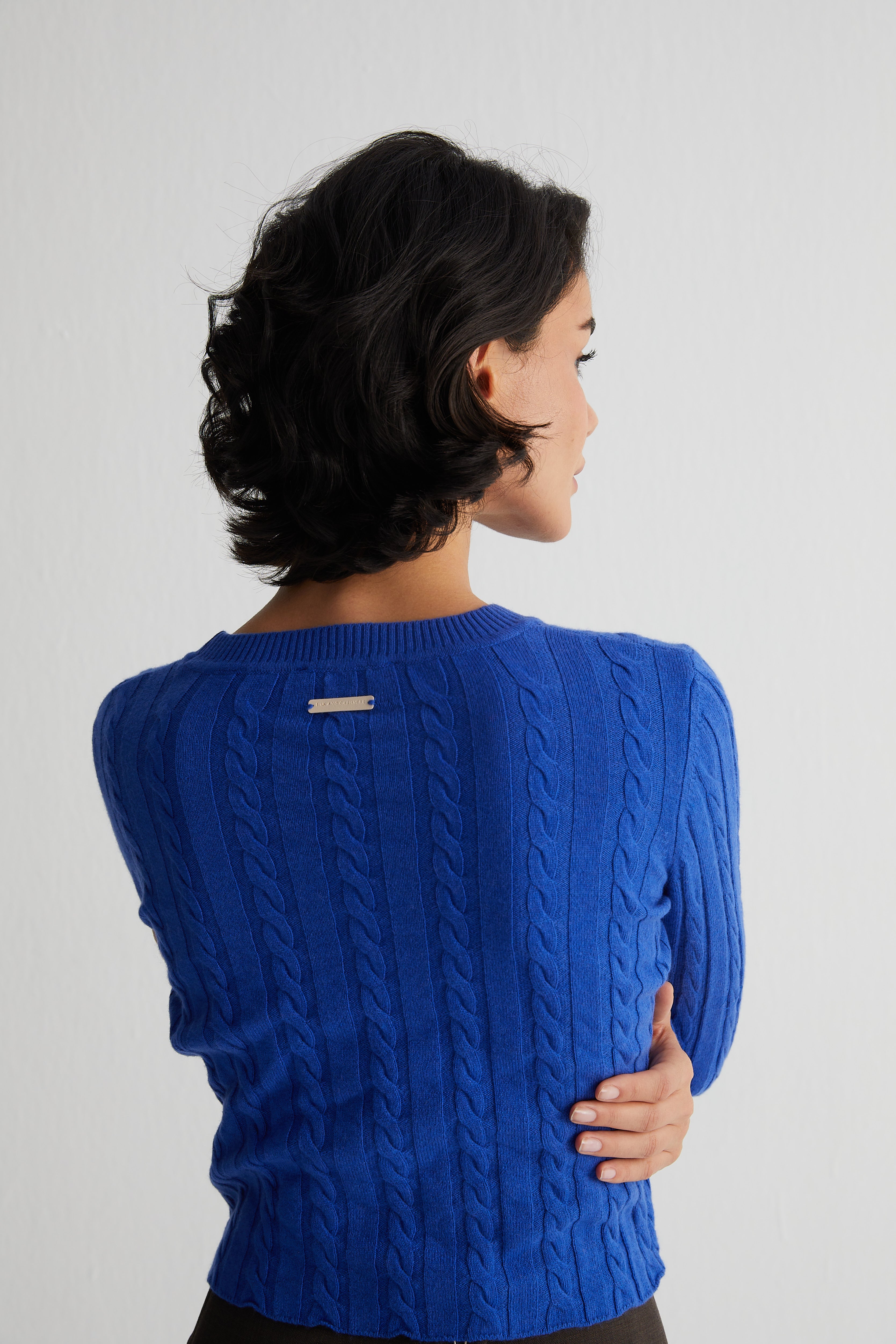 Amelia crop kazak, yünün sıcaklığını ve kaşmirin yumuşaklığını zarif bir oranda birleştiriyor. Canlı mavi rengi ve örgü dokusu sayesinde hem modern hem de karakter sahibi bir duruş sergiler. Katmanlı giyimin merkezine yerleşebilecek kadar çok yönlü bir parça olarak öne çıkar.