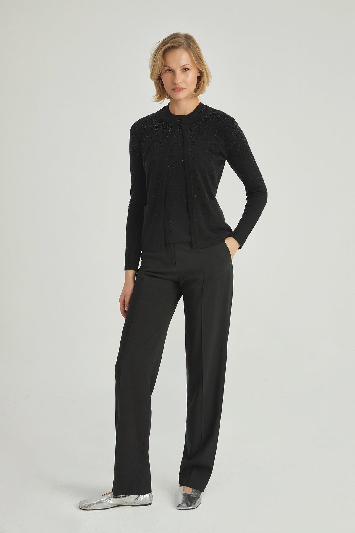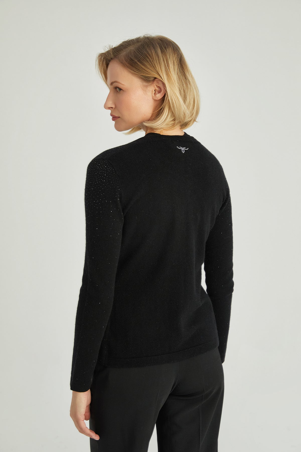 Siyah Merill Yün Kaşmir Yuvarlak Yaka Taşlı Hırka