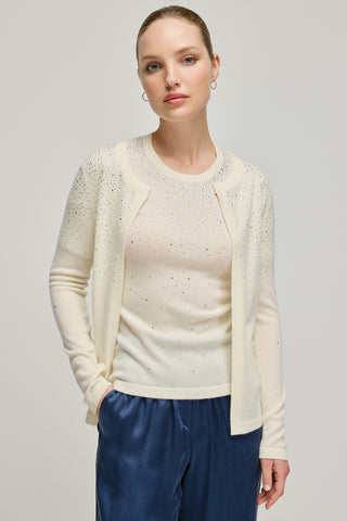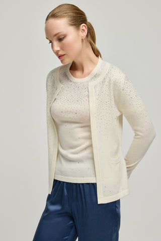 Ekru Kaşmir Yün Merril Yuvarlak Yaka Taş Süs Detaylı Hırka