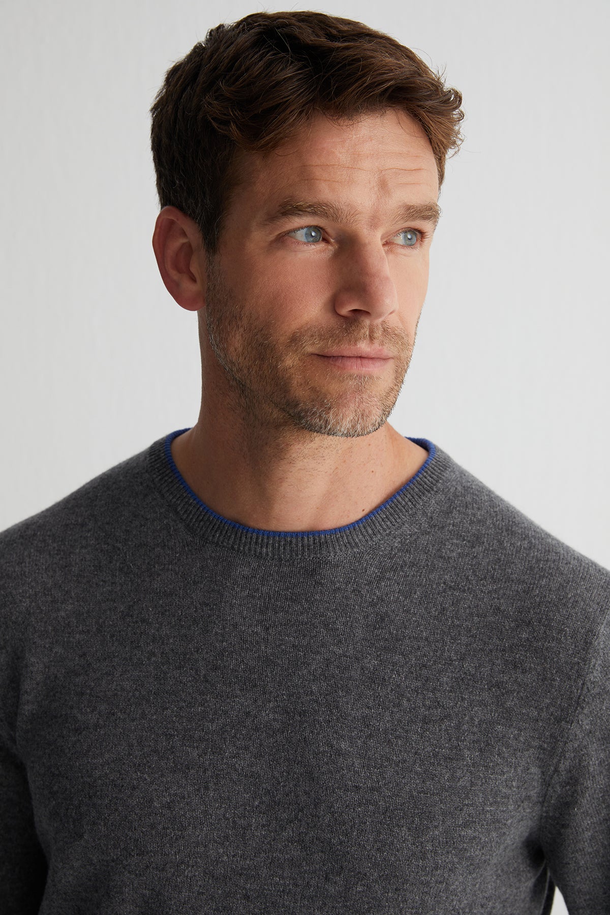 Günlük kullanıma uygun, dengeli ve rahat bir duruş sunan koyu gri Franco kazak, %100 saf kaşmir yapısıyla yumuşaklığı güçlü bir formda birleştirir. Kol ve etek uçlarındaki ribana örgü detayları, formun korunmasına katkı sağlarken, kazaktan beklenen yapısal bütünlüğü destekler. Yaka iç kısmında yer alan kontrast mavi şerit detayı ise sade tasarıma karakteristik bir dokunuş katar; kazak böylece hem zamansız hem özgün bir çizgi kazanır.