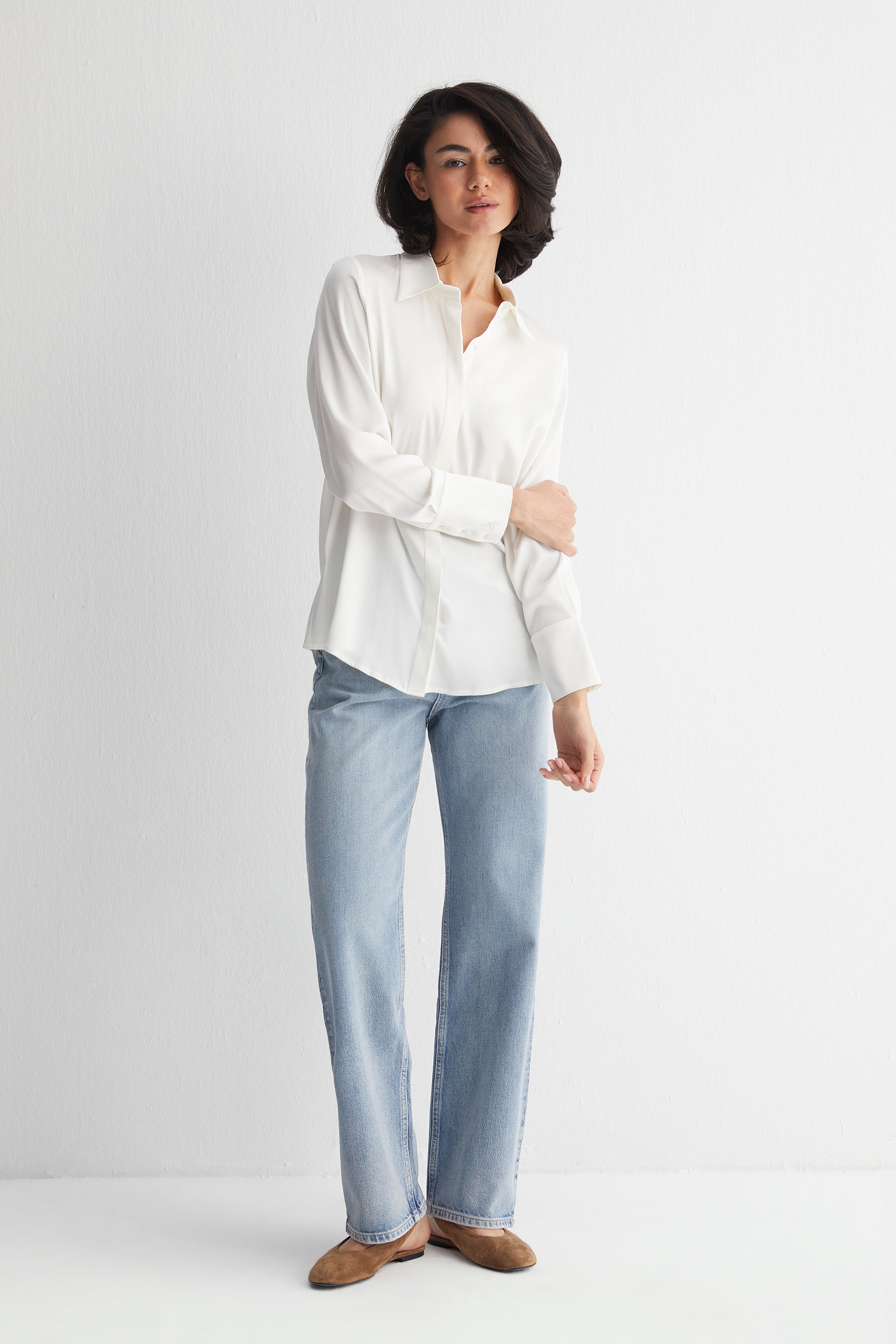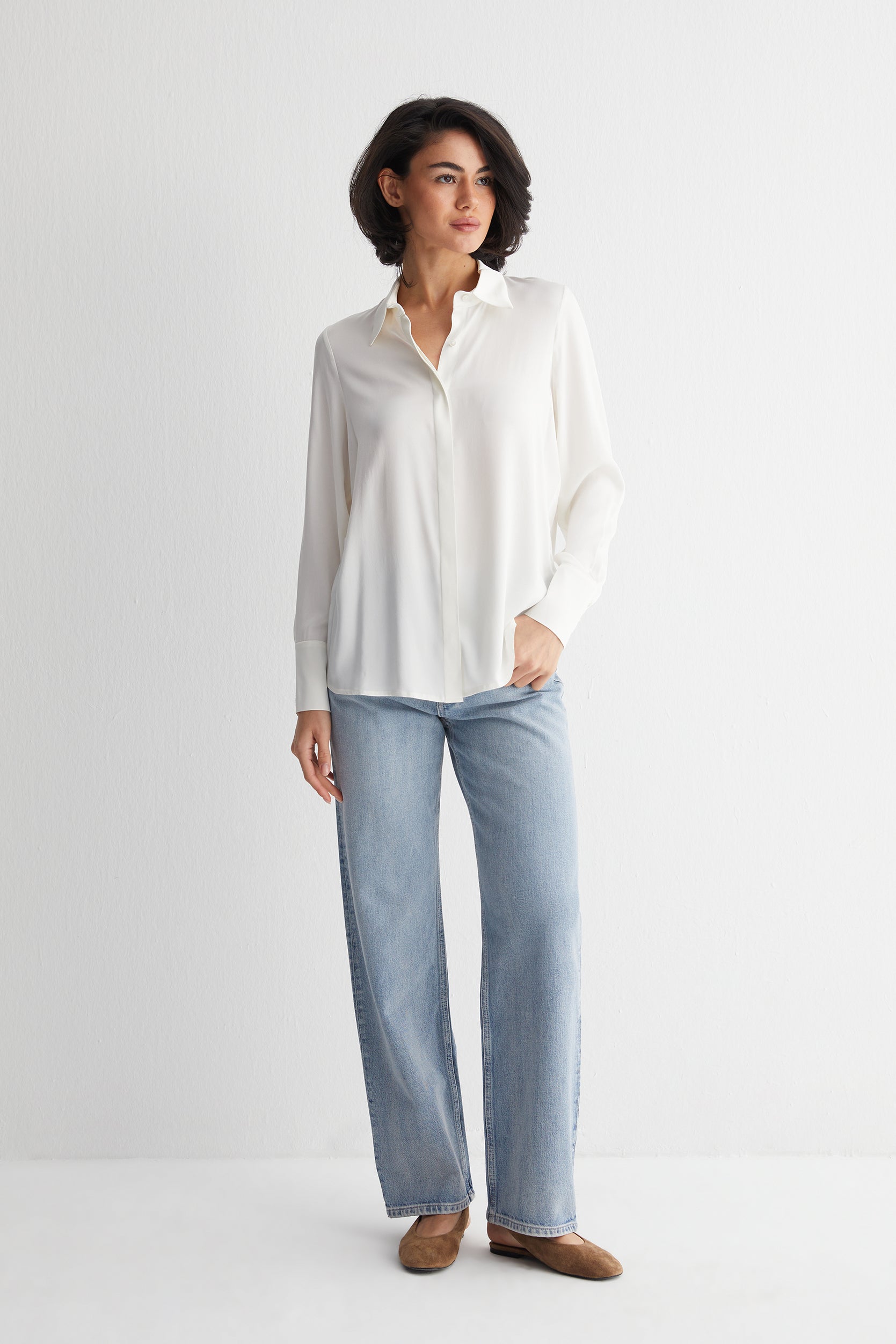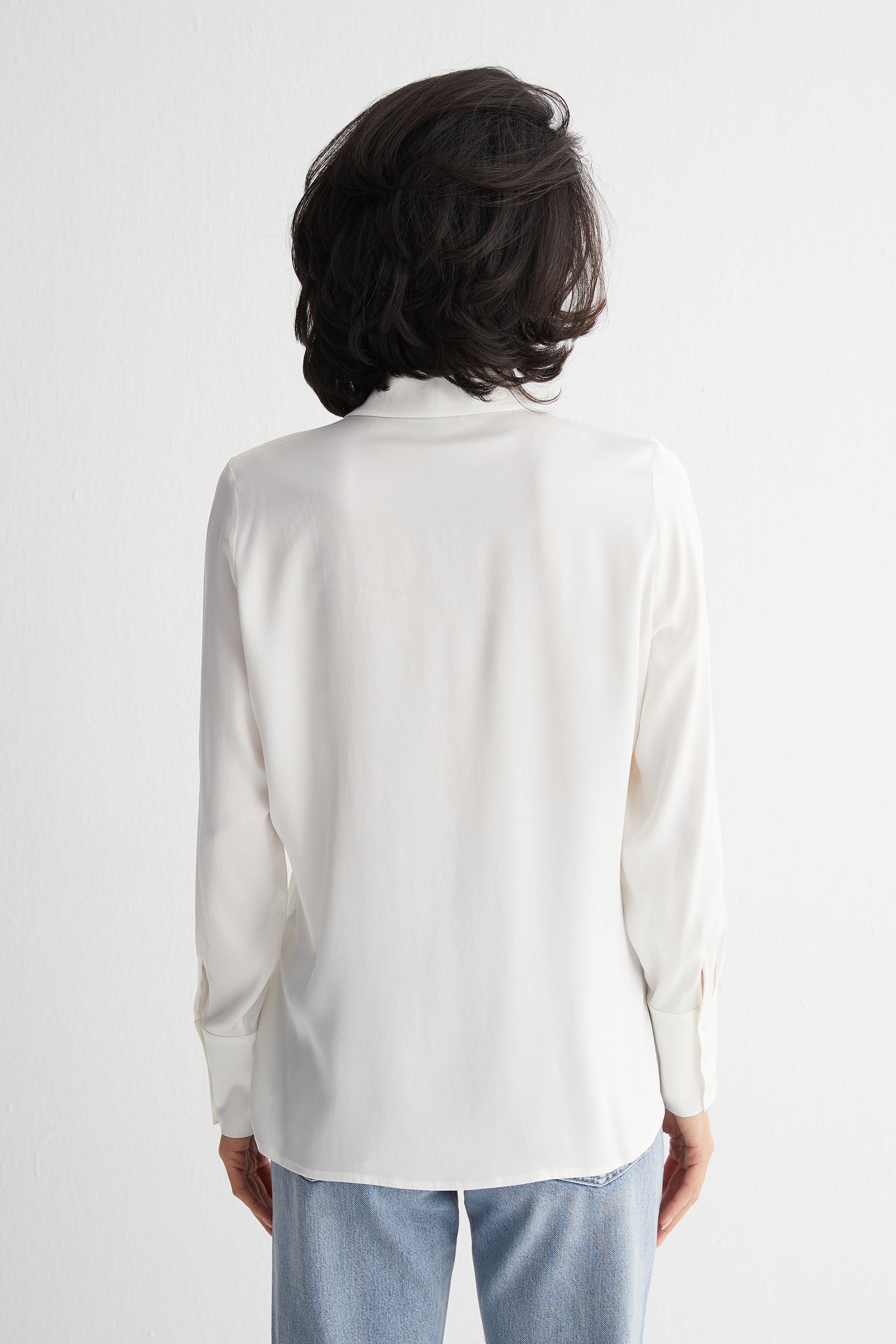 Beyaz Saf İpek Audrey Uzun Kollu Gömlek