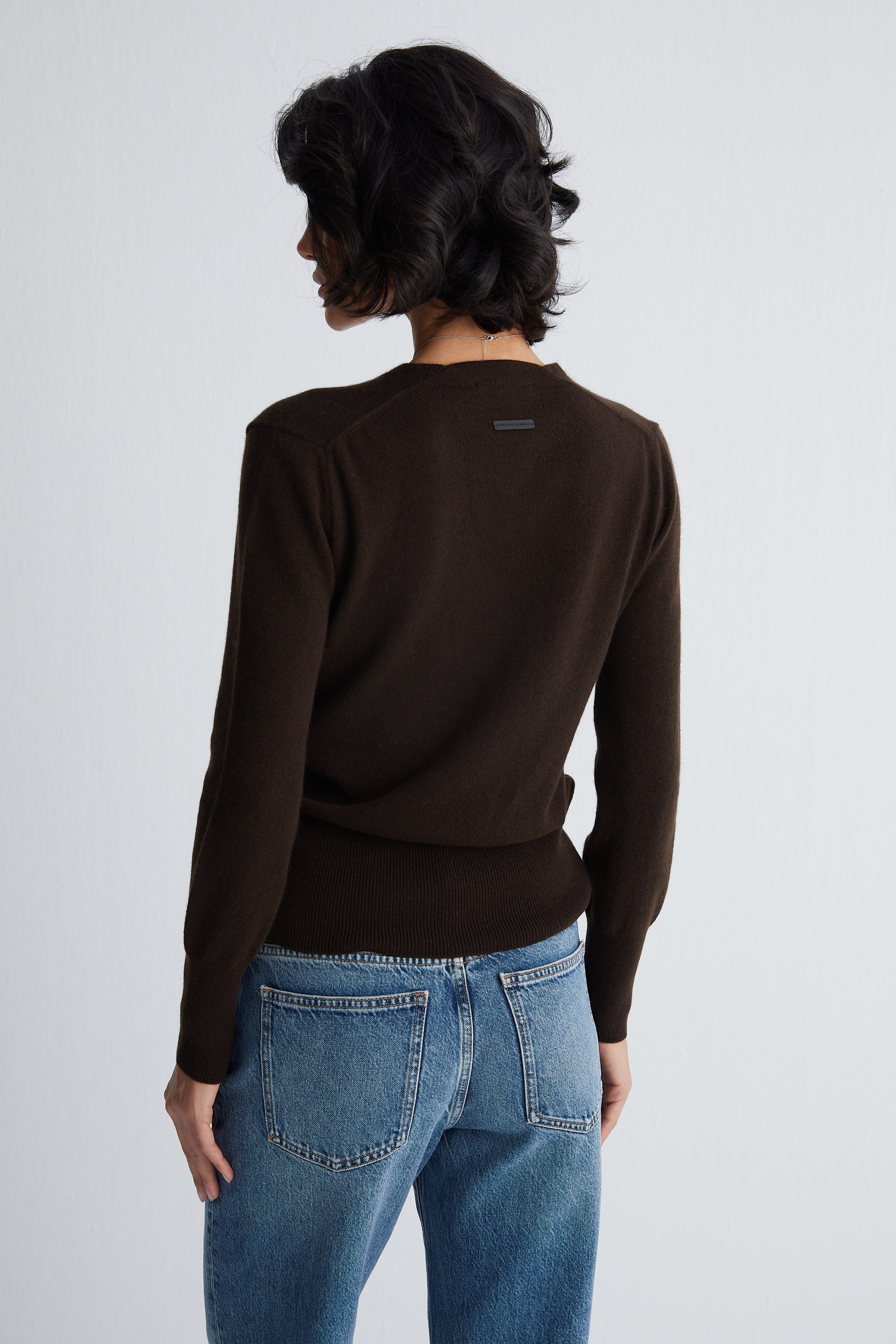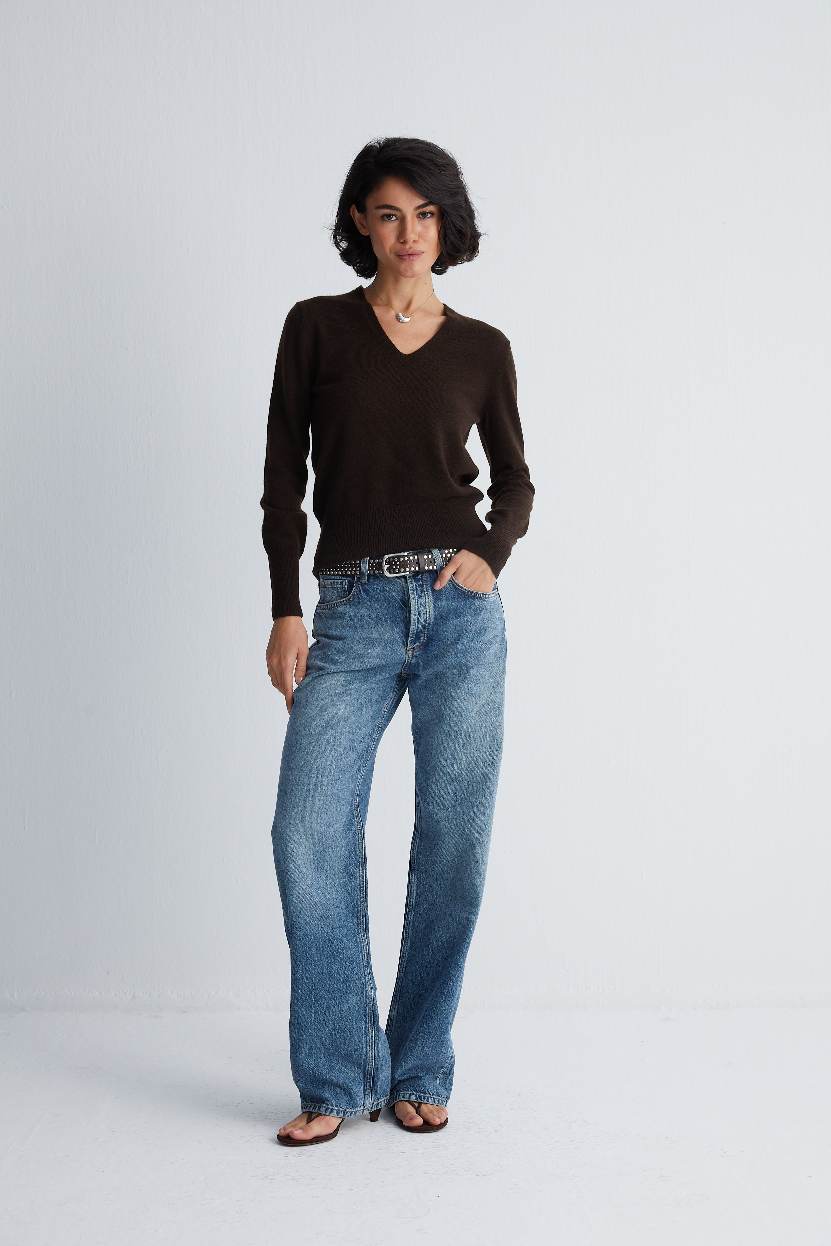 Kahverengi Franca Saf Kaşmir Derin V Yaka Kazak