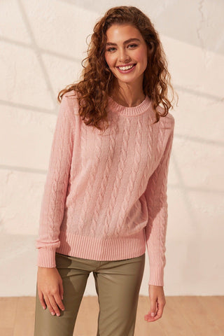 Pembe Amelia Avustralya Yünü Kaşmir Saç Örgülü Yuvarlak Yaka Uzun Kollu Kadın Kazak