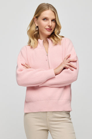 Pembe Aurora Avustralya Yünü Kaşmir Ribana Örgülü Fermuarlı Uzun Kollu Kadın Kazak