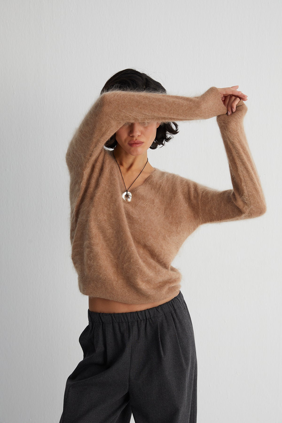 İncelikle taranmış saf kaşmir ipliklerle hazırlanan bu V yaka kazak, cildinize dokunan her an huzur vadeder. Hafif yapısı ve doğal yumuşaklığıyla sıcaklığı zarafetle buluştururken, sade görünümüyle kombinlerinize özgürlük sunar.