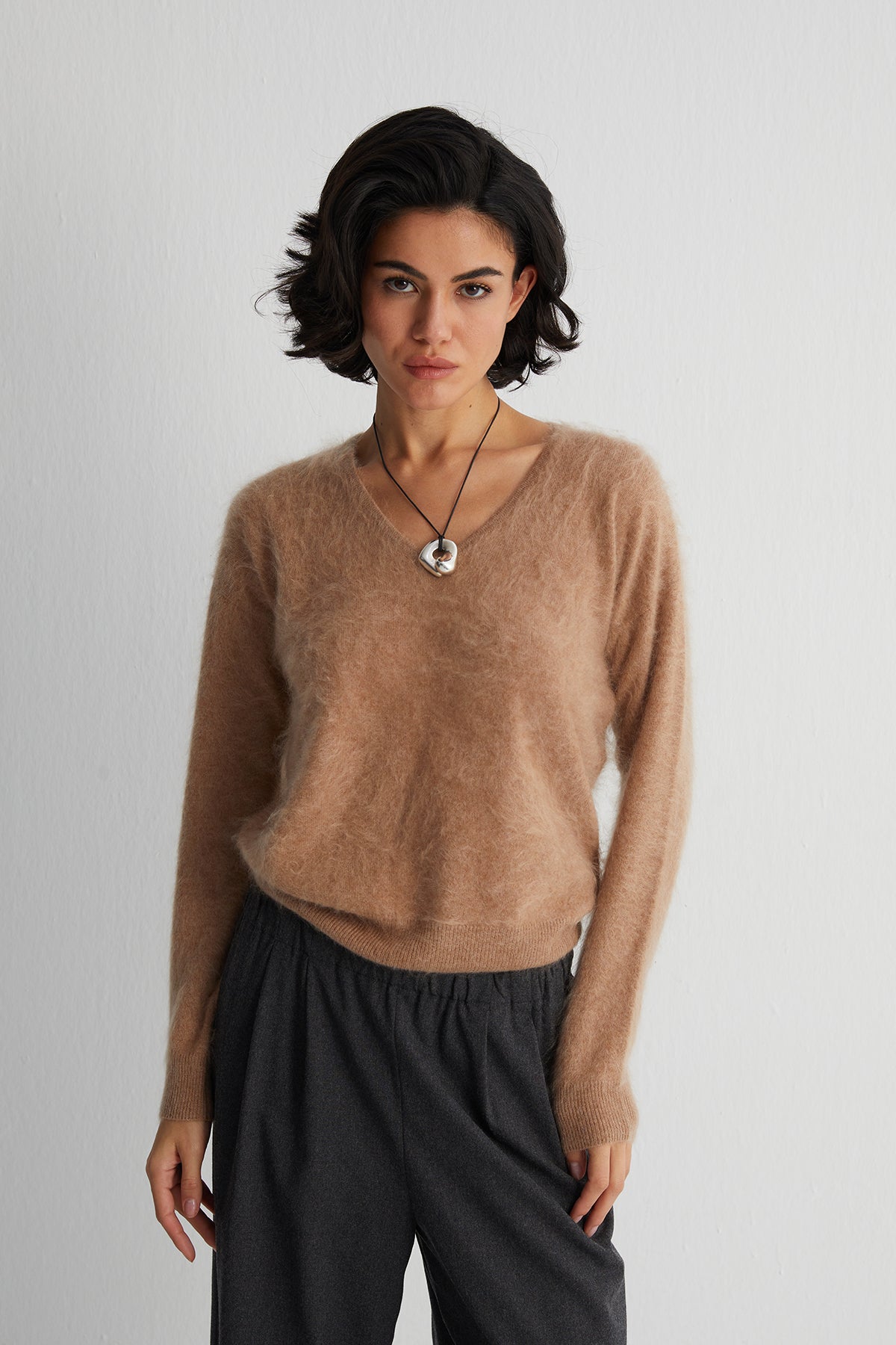 Açık Camel Brushed Saf Kaşmir V Yaka Kazak