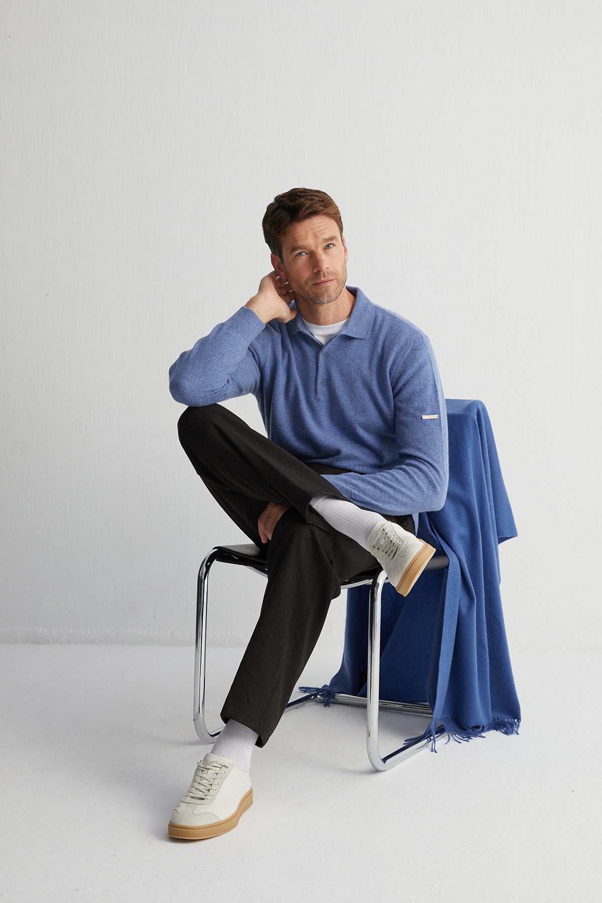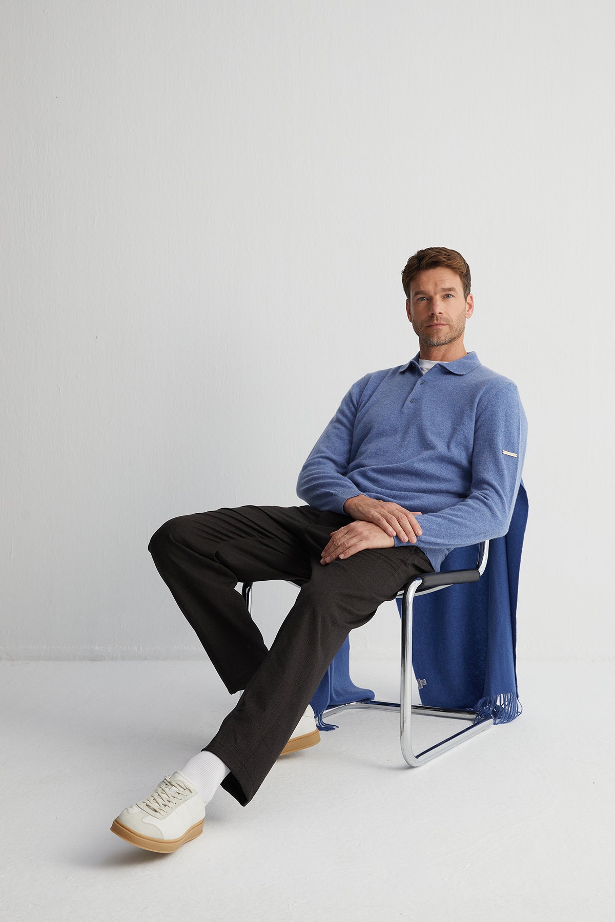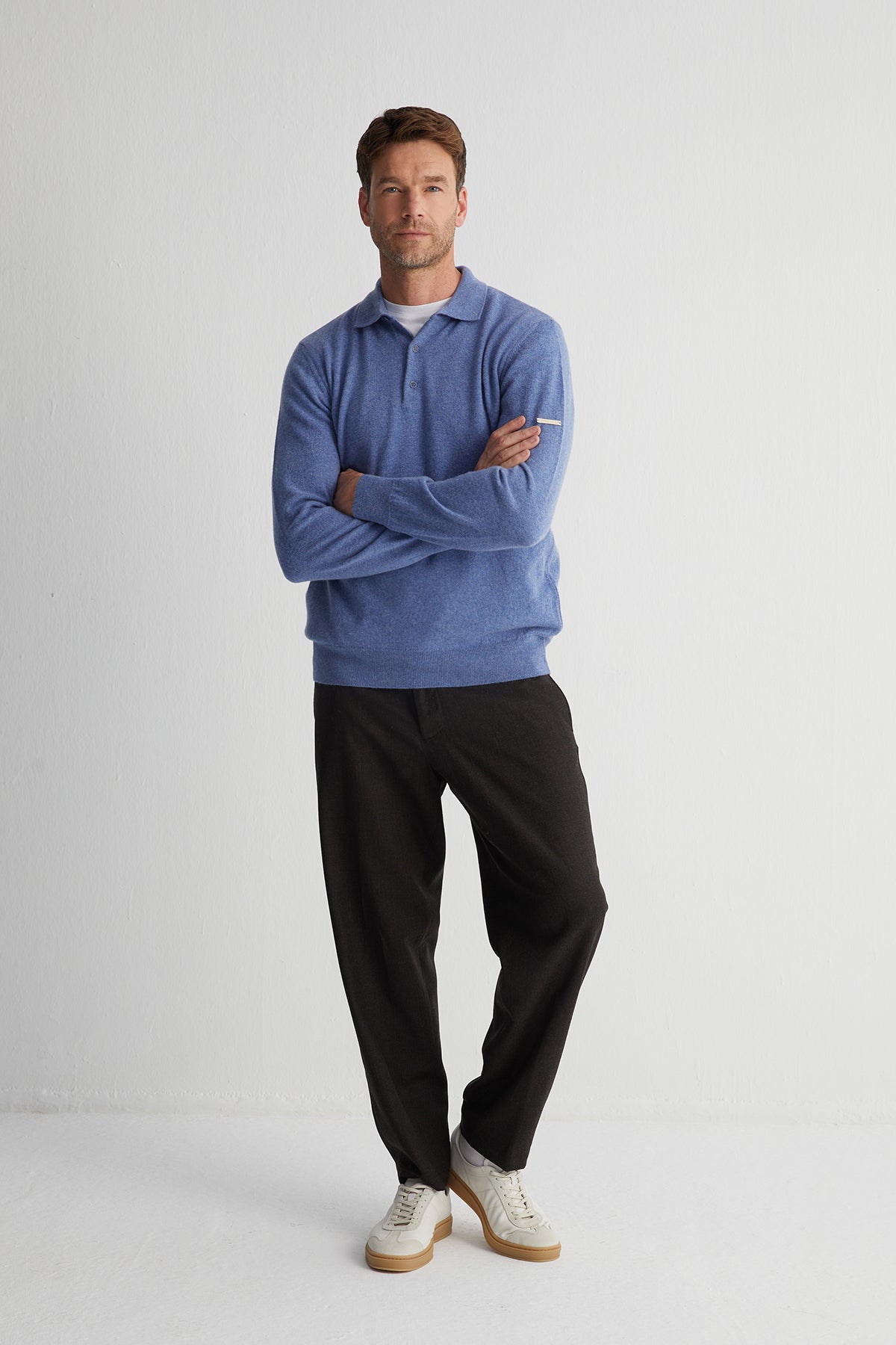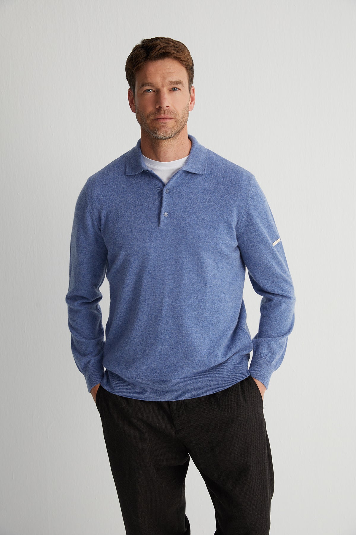 %100 saf kaşmirden üretilen polo kazak modern tonlara sahip açık denim rengiyle sade ama dikkat çekici bir görünüm sunar. Saf kaşmirin eşsiz yumuşaklığı, bu kazakta hem konforu hem de zamansız stili bir araya getiriyor. Tek başına ya da ceket altına kombinleyerek kullanabilirsiniz.