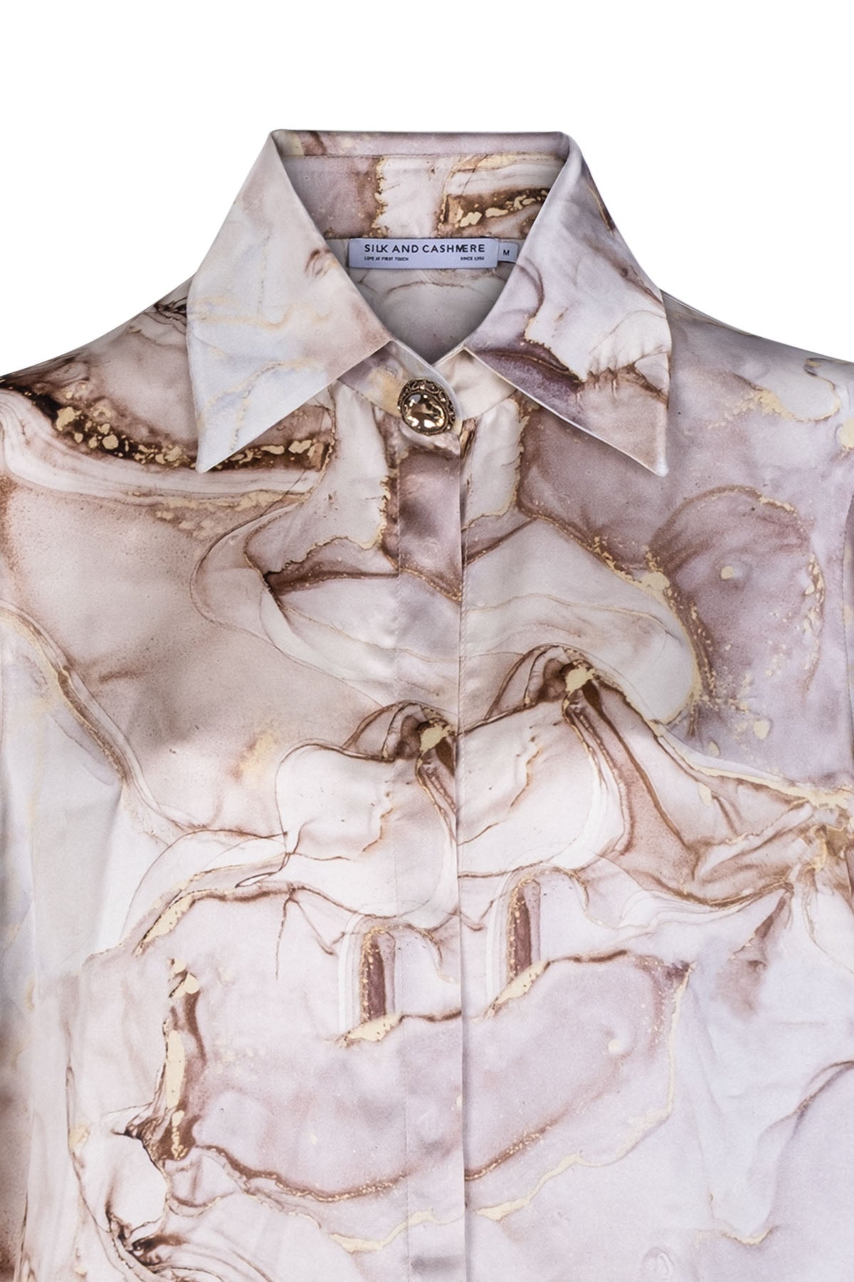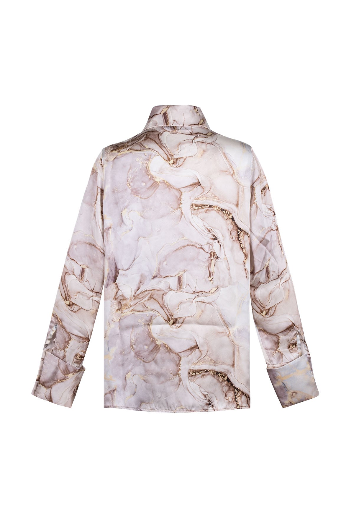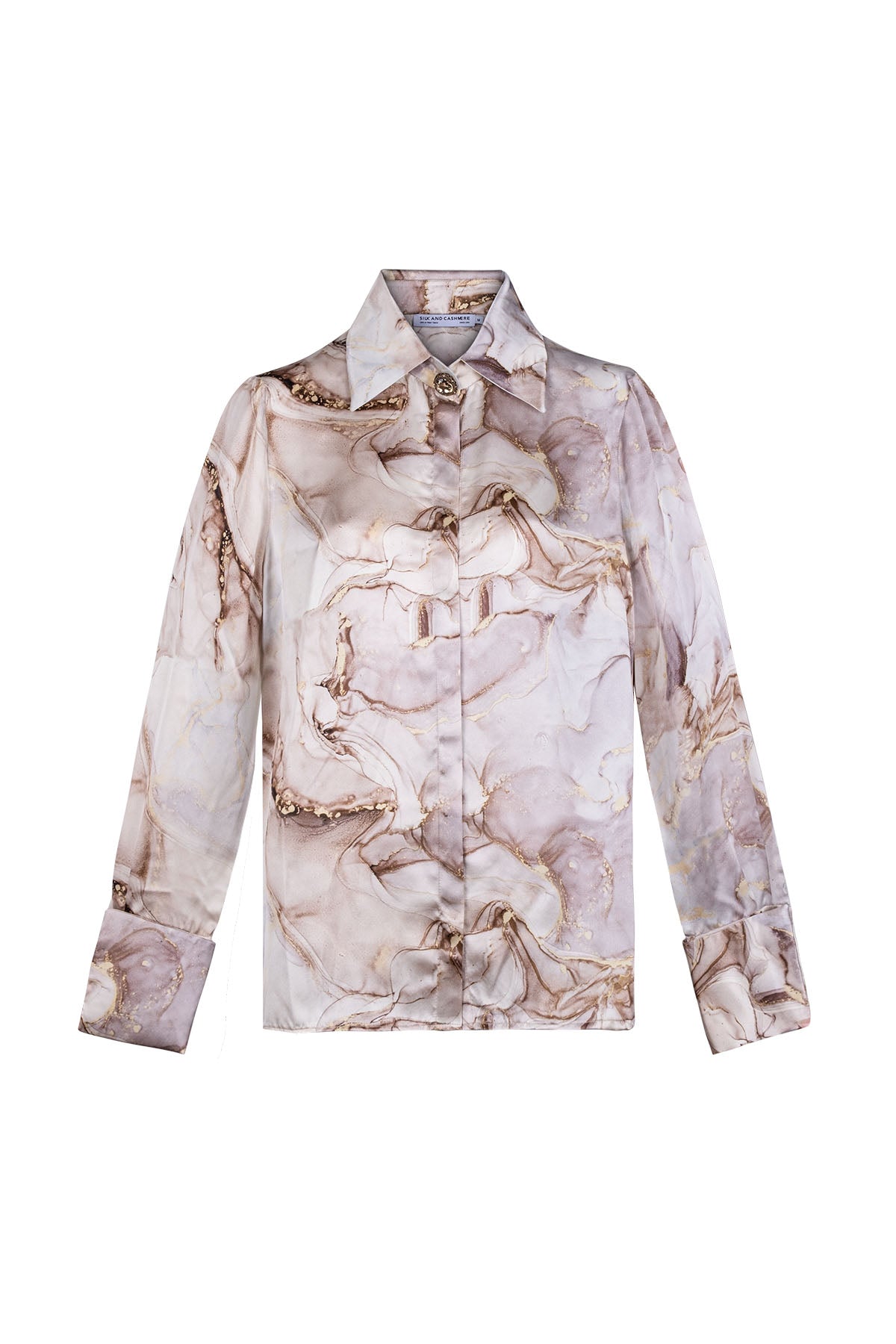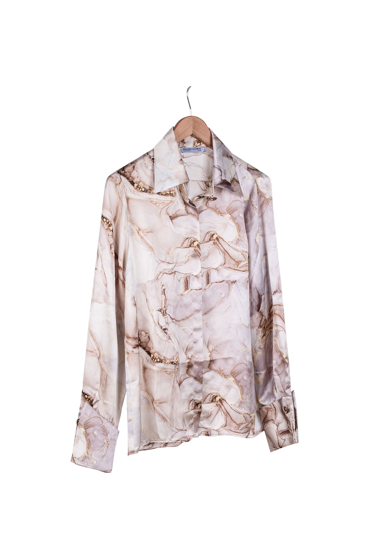 Doğanın taş ve mermer dokularından esinlenen bu saf ipek gömlek, narin renk geçişleri ve soyut desenleriyle göz alıcı bir zarafete sahiptir. Kendinizi özgün hissettiğiniz anlara eşlik edecek seçkin bir tamamlayıcıdır.
