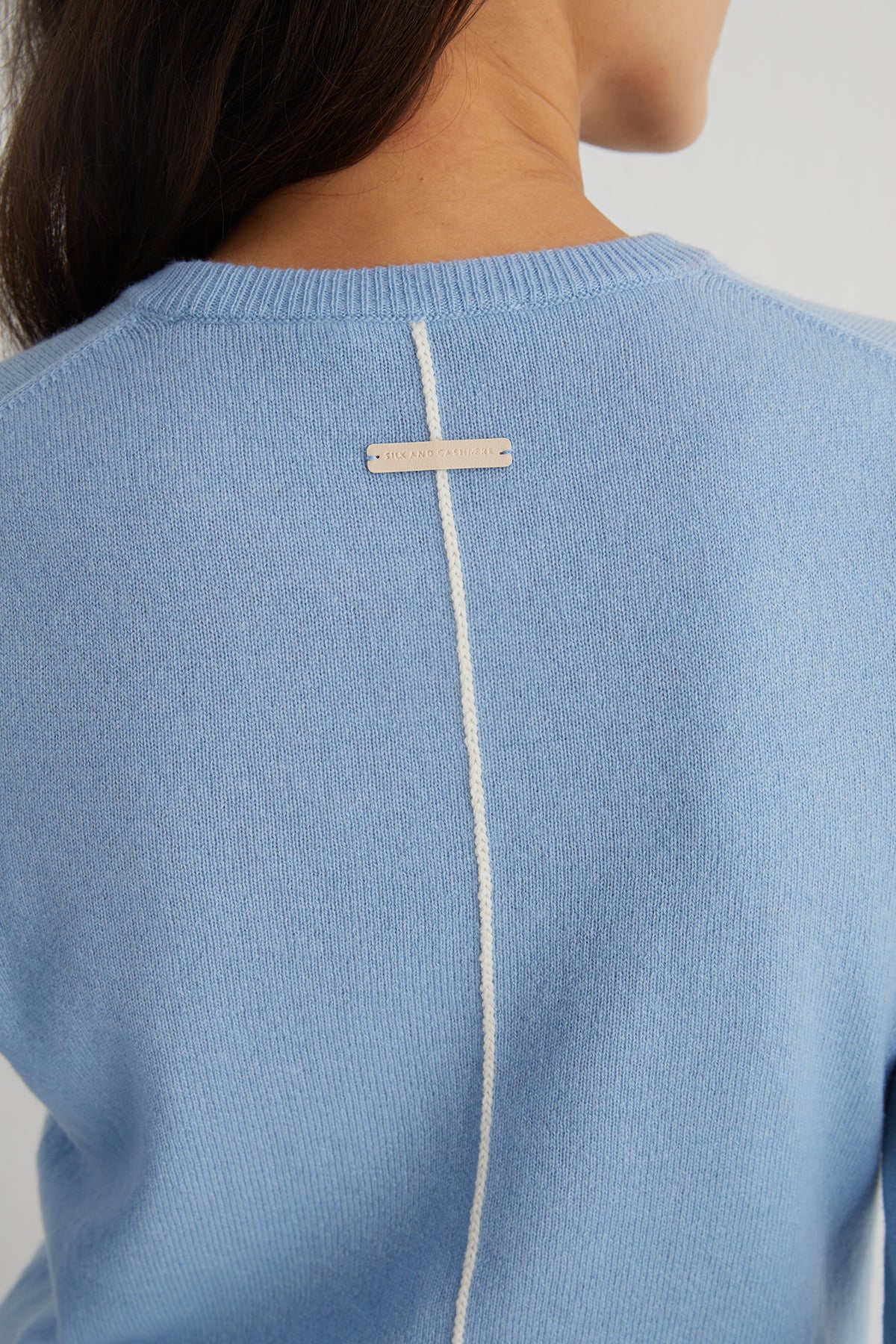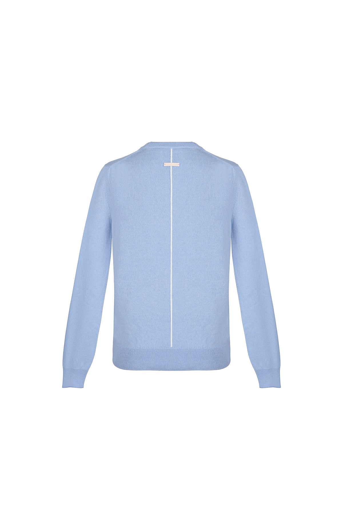Franca kazağın huzur veren açık mavi tonu, doğanın dinginliğinden ilhamla tasarlandı. İtalyan kaşmirin narin dokusu ile bedeninize yumuşakça sarılırken, sade görünümünü arka ortadaki beyaz çizgiyle tamamlayarak farkını zarifçe ortaya koyar.