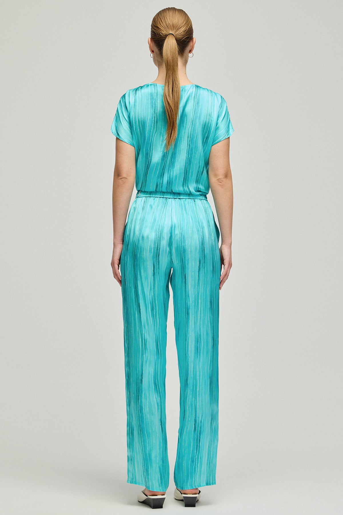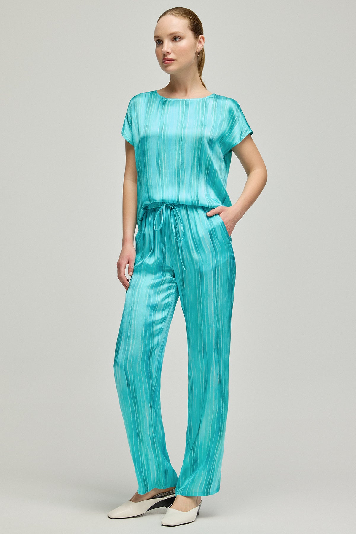 Aqua Nature koleksiyonunun ferahlığı ve rahatlığı bir araya getiren bu ipek pantolon, zahmetsiz bir şıklık sunuyor. Denizden esinlenen mavi tonları, %100 ipek kumaşın akıcı dokusuyla birleşerek günün her saati konforlu ve stil sahibi bir deneyim sağlıyor. Bu pantolon, ipek dokunun zarafetiyle, yaz mevsiminin neşe dolu enerjisini adımlarınıza taşırken, sizi gün boyu serin tutacak.