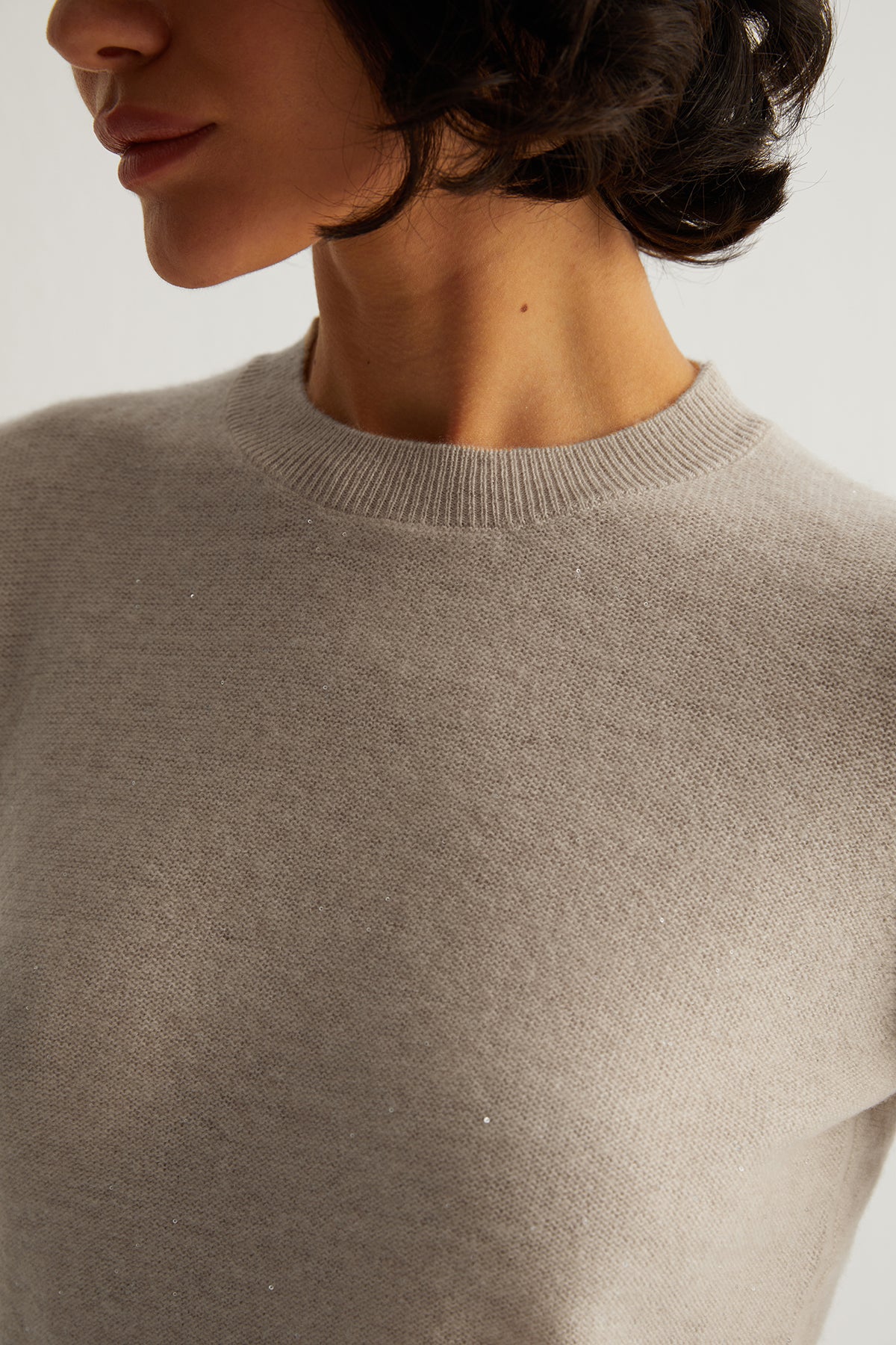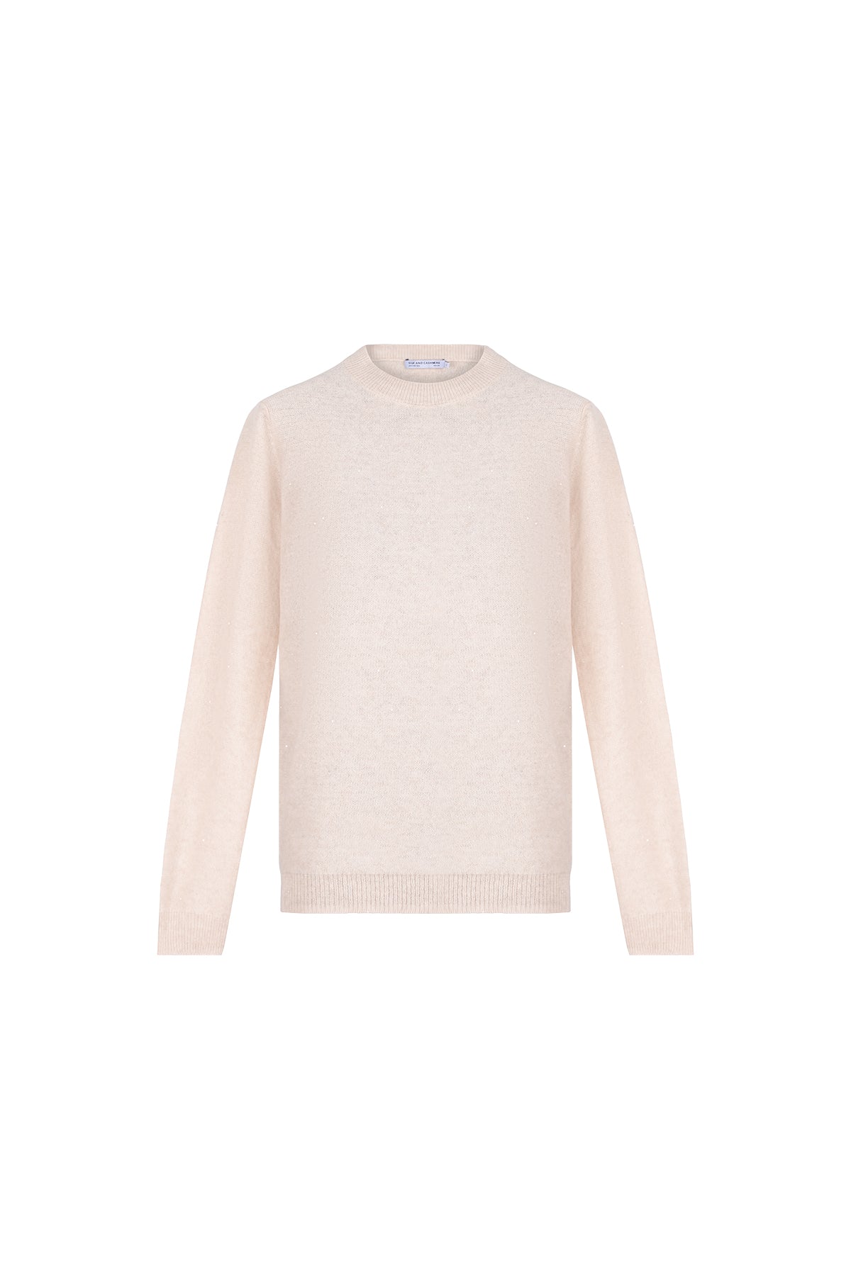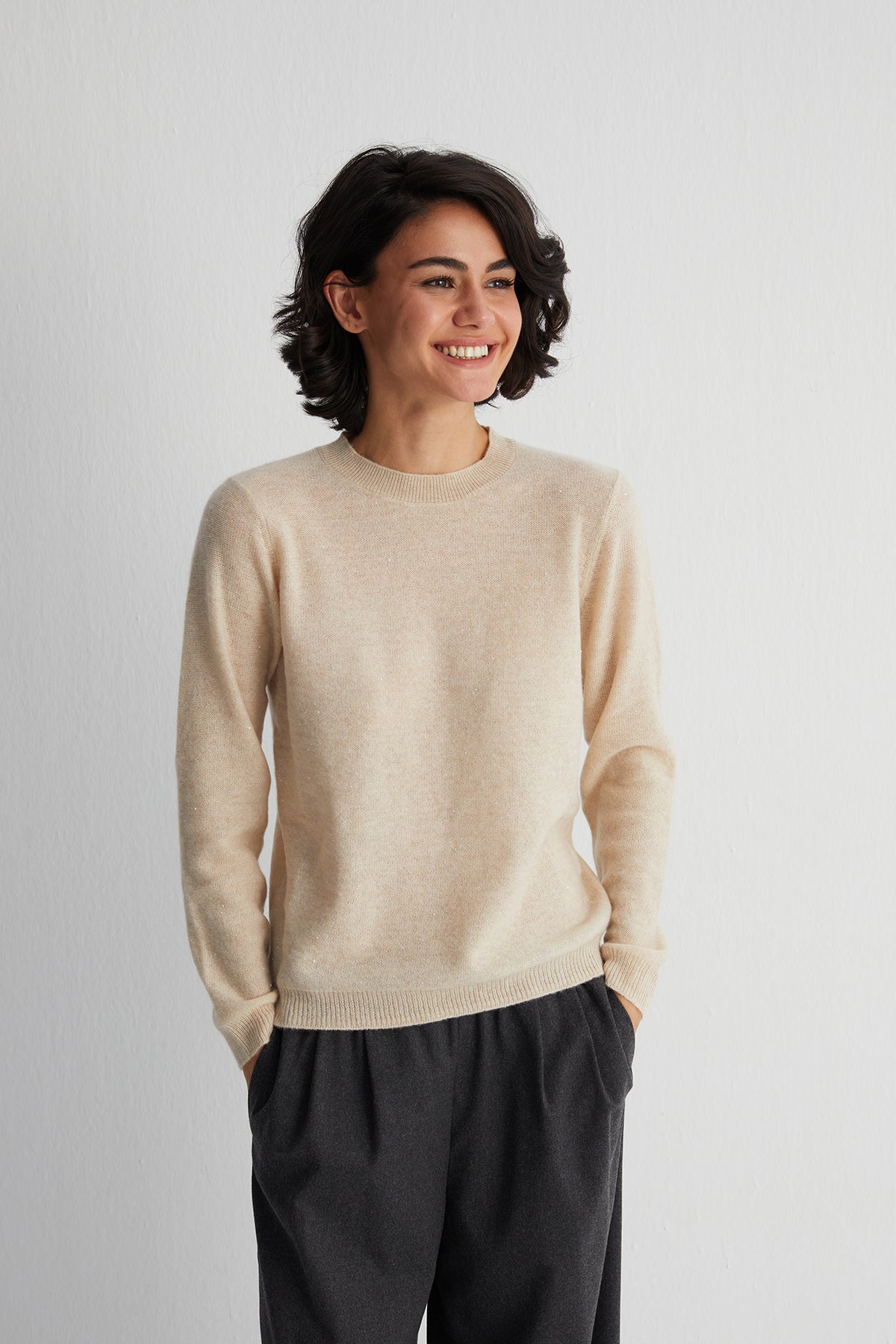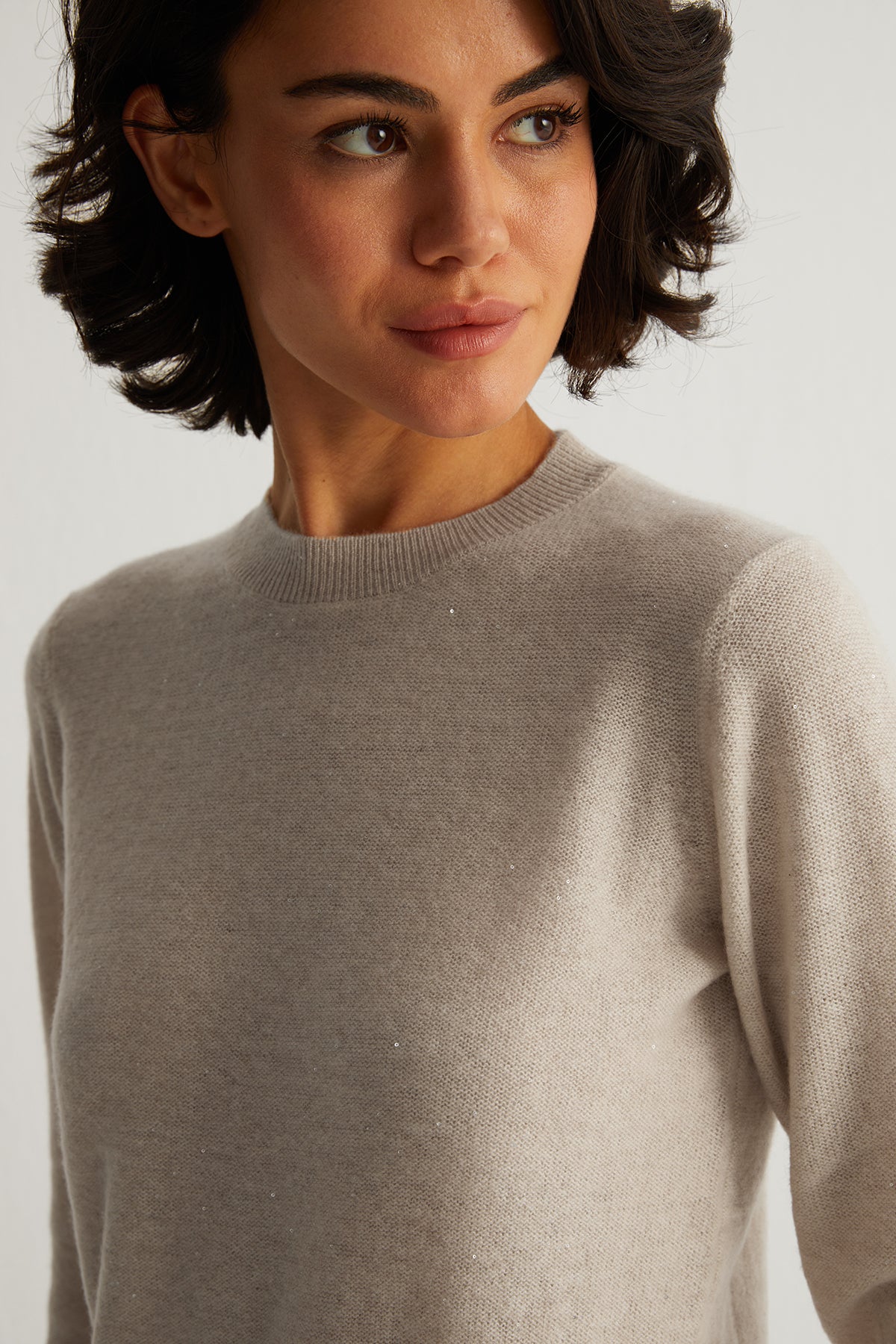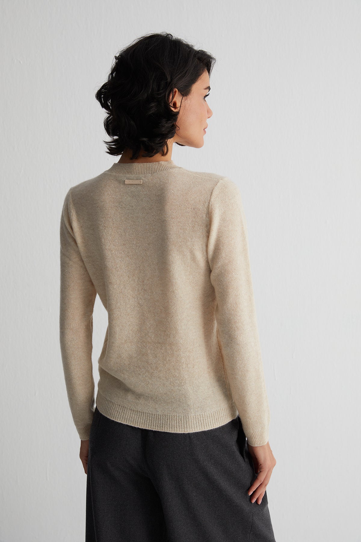 Bej Alexia Kaşmirli İşlemeli Yuvarlak Yaka Kazak