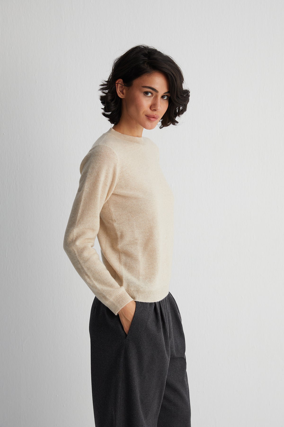 Alexia kazak, yumuşak dokusu ve zarif işlemeleriyle günlük stile sade bir hareket katar. Rahat kalıbı ve yuvarlak yaka kesimi sayesinde her ortamda konforlu bir kullanım sunar. Bej tonu ve hafif ışıltılı yüzeyiyle öne çıkan bu model, dolabınızda özel bir yere sahip olur.