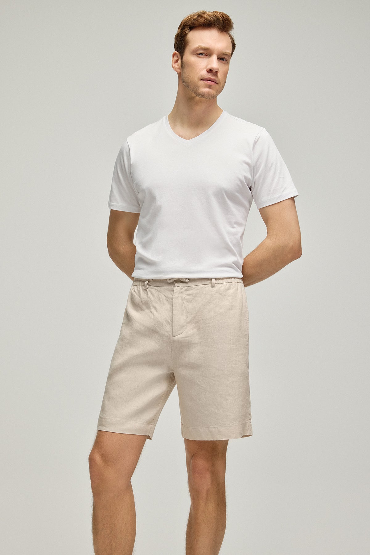 Bej Leon Ketenli Rahat Kesim Erkek Şort