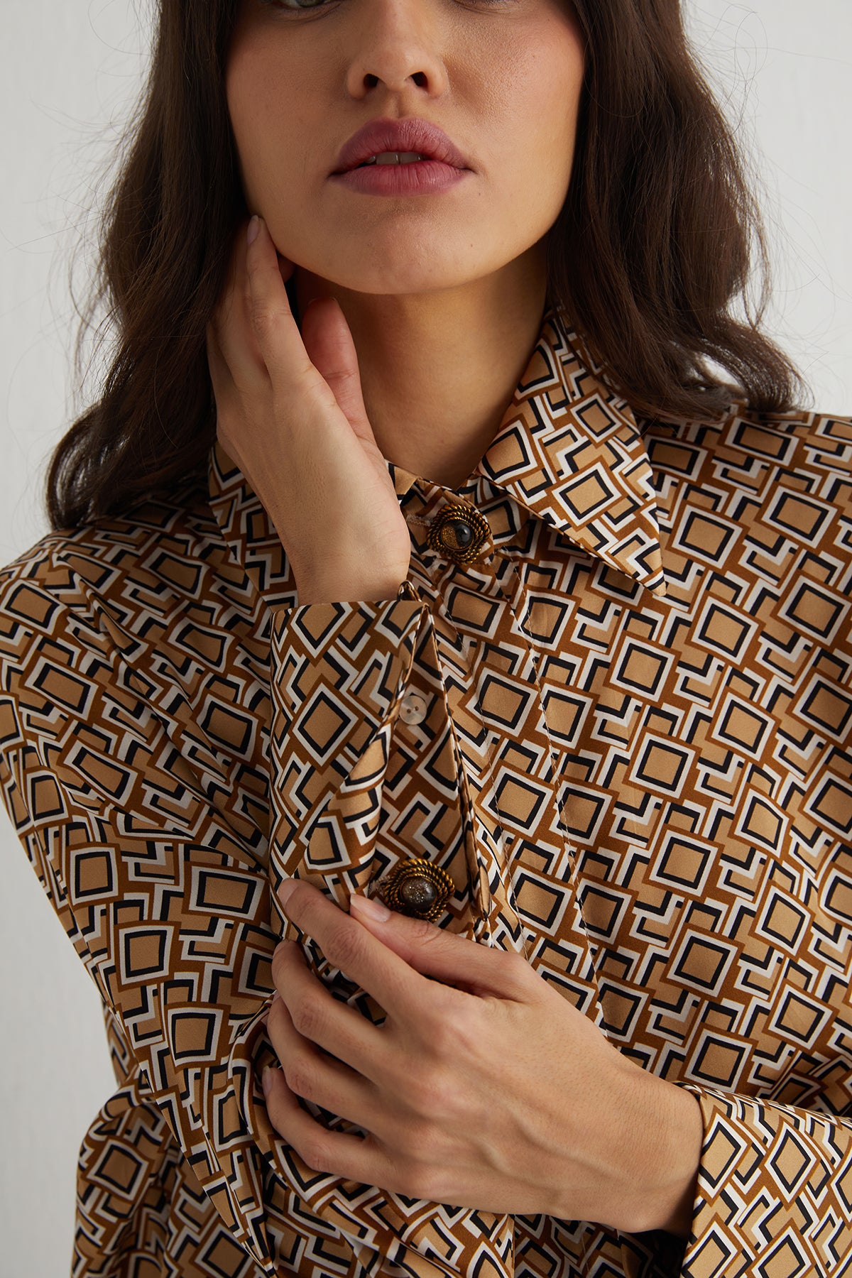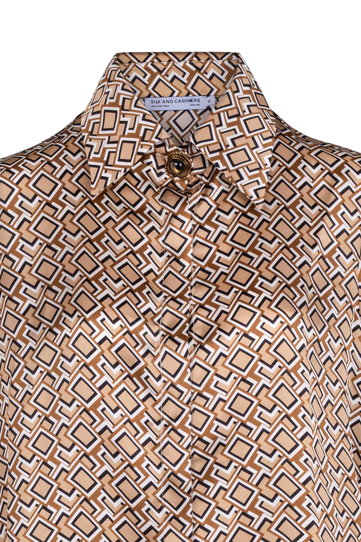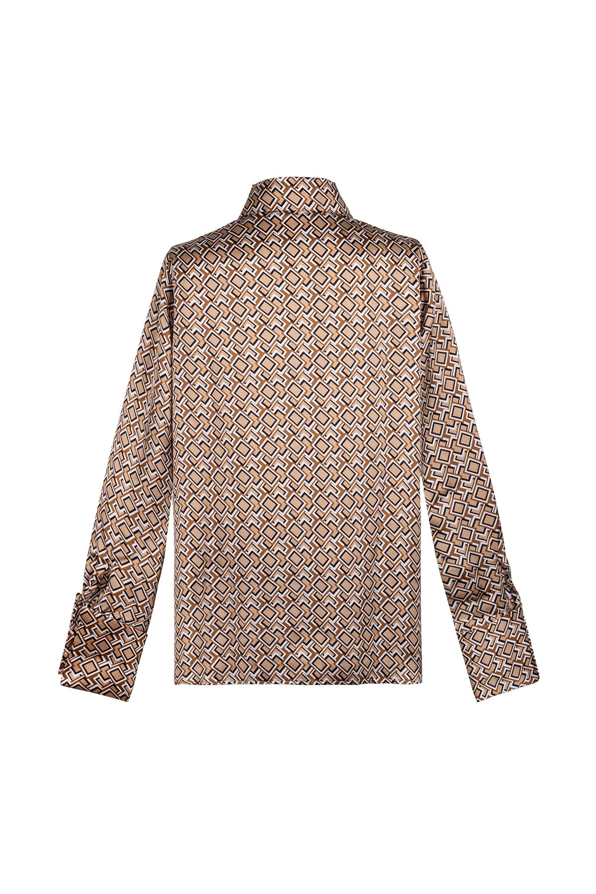 Göz alıcı geometrik desenleri ve zamansız bej tonu ile bu saf ipek gömlek, ritmik bir estetik ve dokunsal bir zarafet sunar. Hareket hâlindeyken ışıkla dans eden ipeksi yüzeyi, kendinizi hem güçlü hem de incelikli hissettiğiniz anların parçası olmaya adaydır.