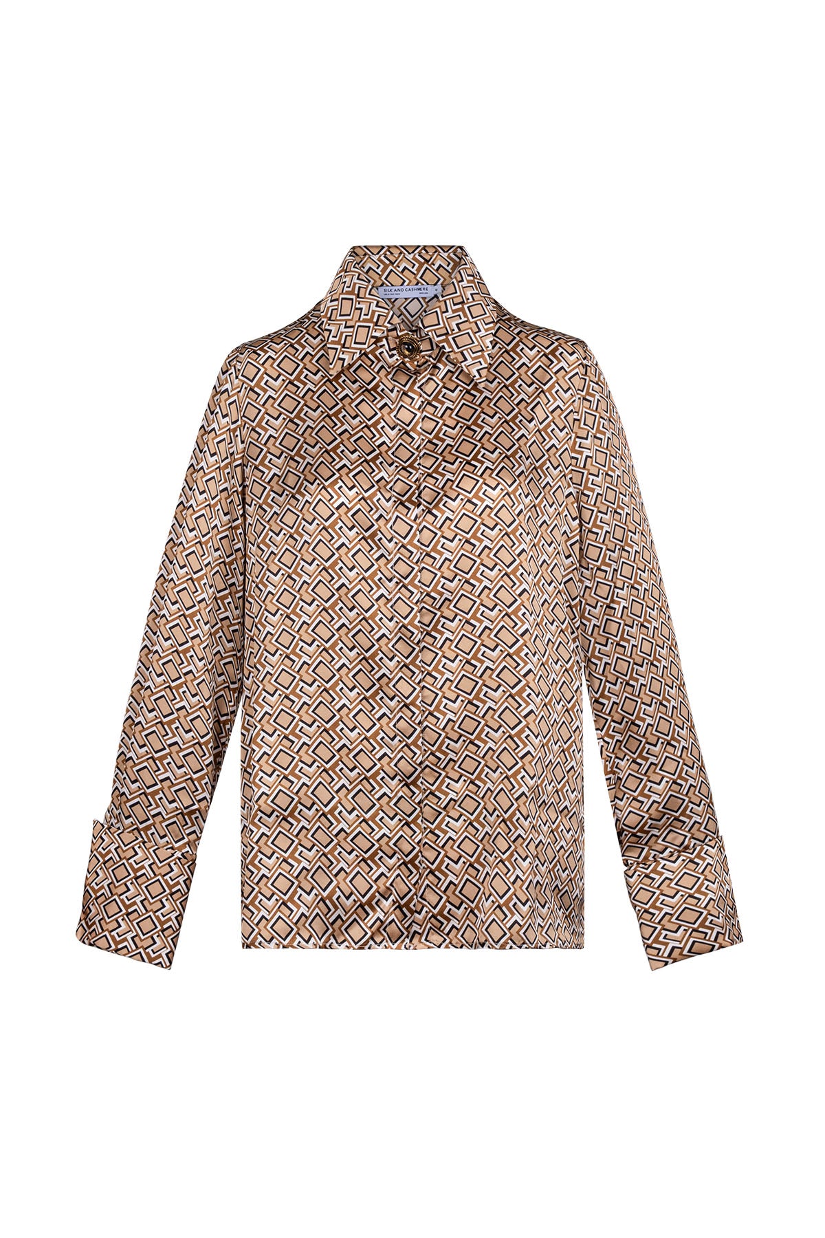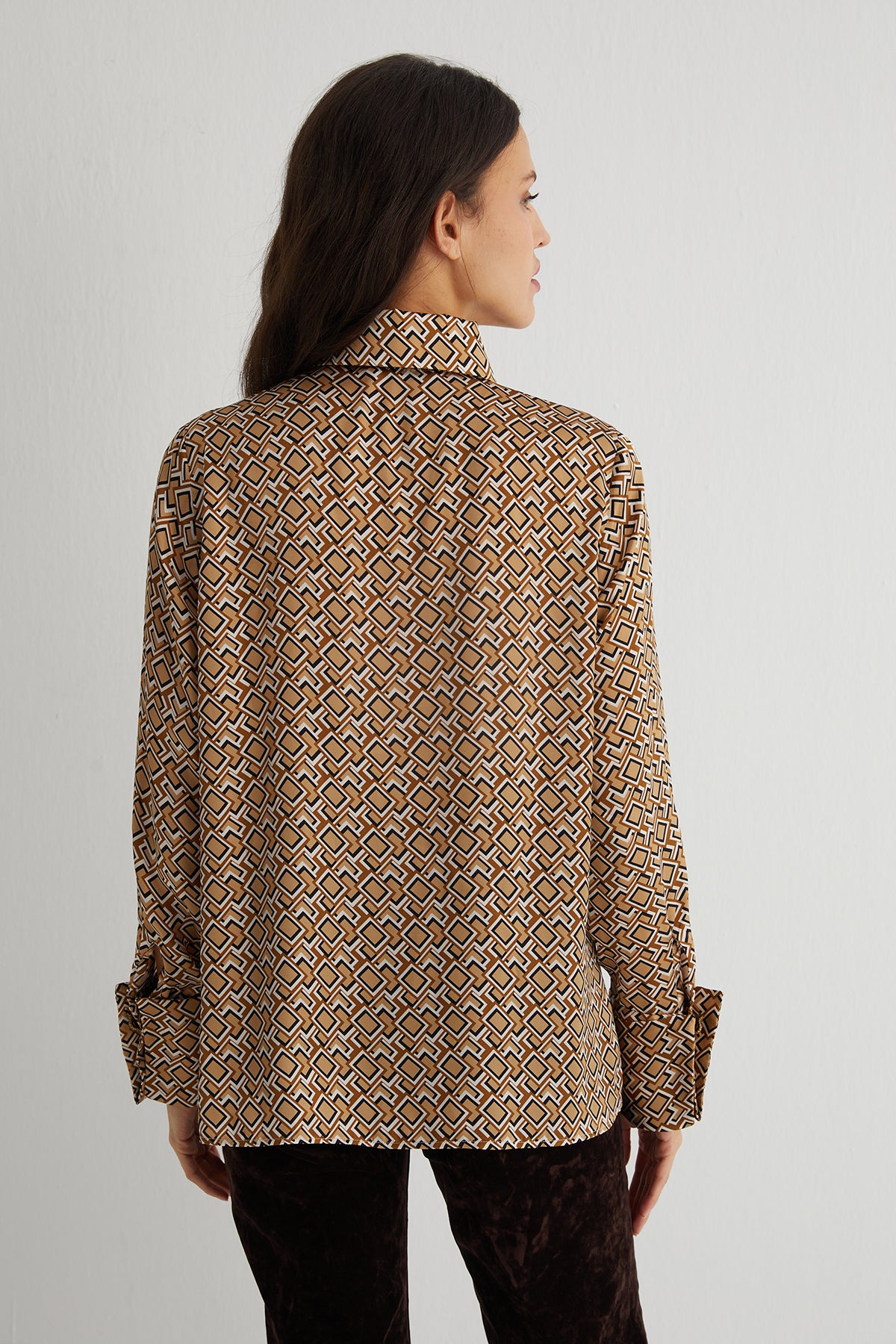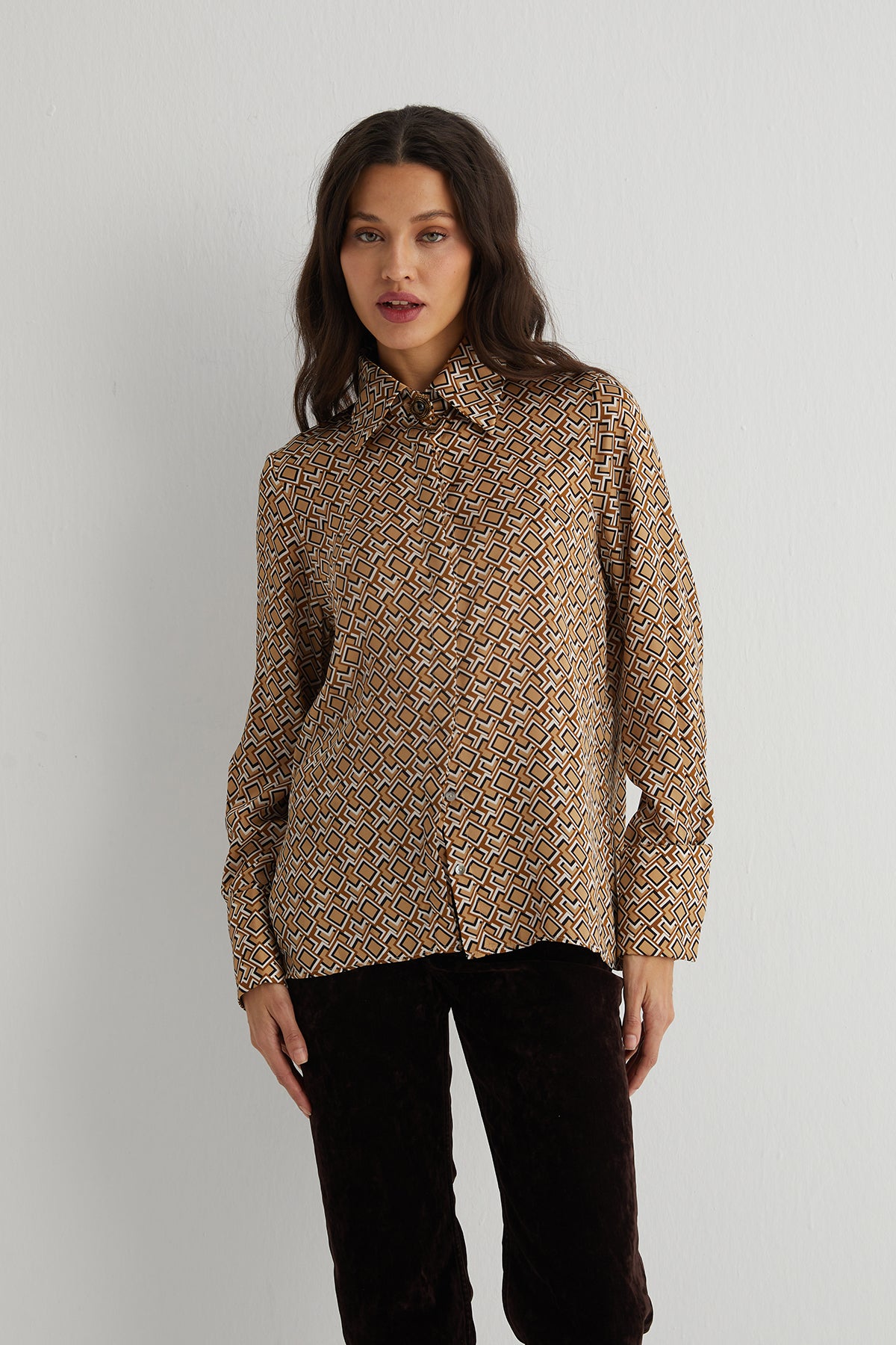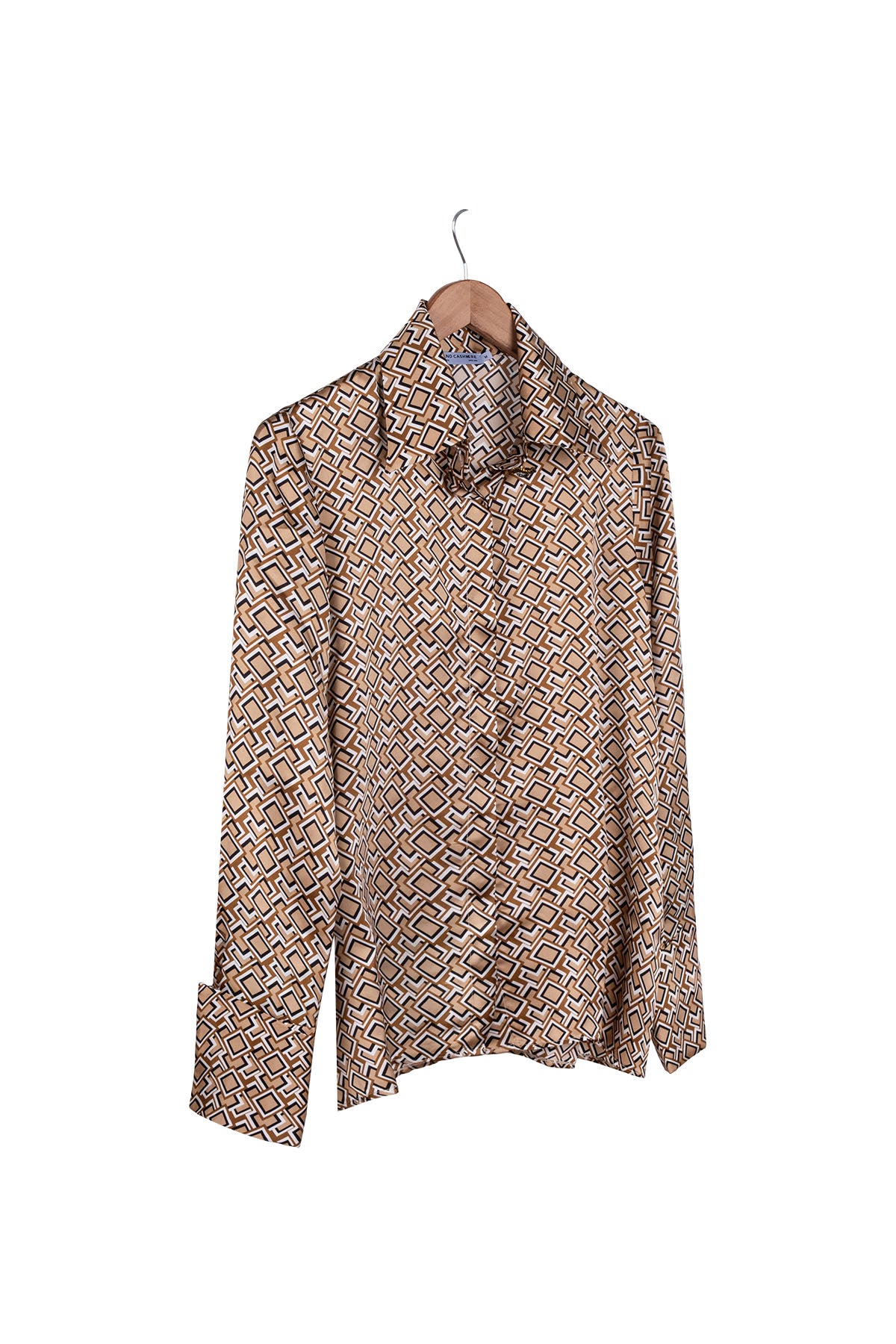 Göz alıcı geometrik desenleri ve zamansız bej tonu ile bu saf ipek gömlek, ritmik bir estetik ve dokunsal bir zarafet sunar. Hareket hâlindeyken ışıkla dans eden ipeksi yüzeyi, kendinizi hem güçlü hem de incelikli hissettiğiniz anların parçası olmaya adaydır.