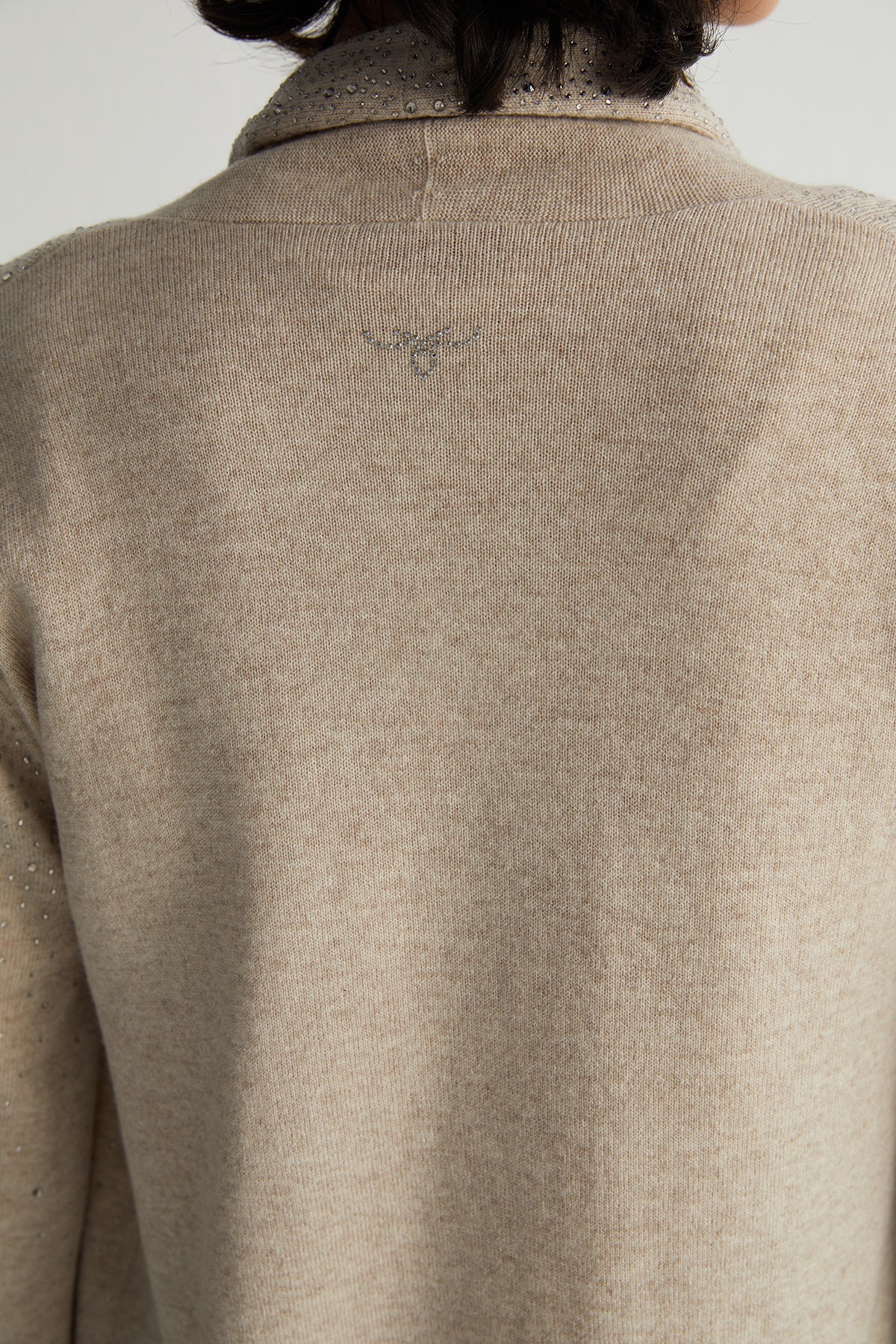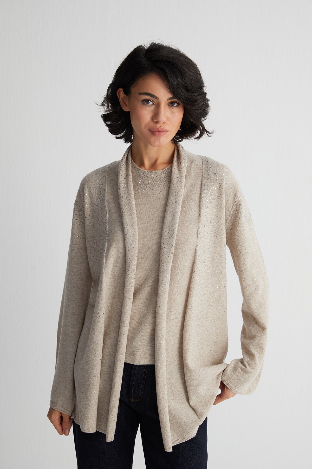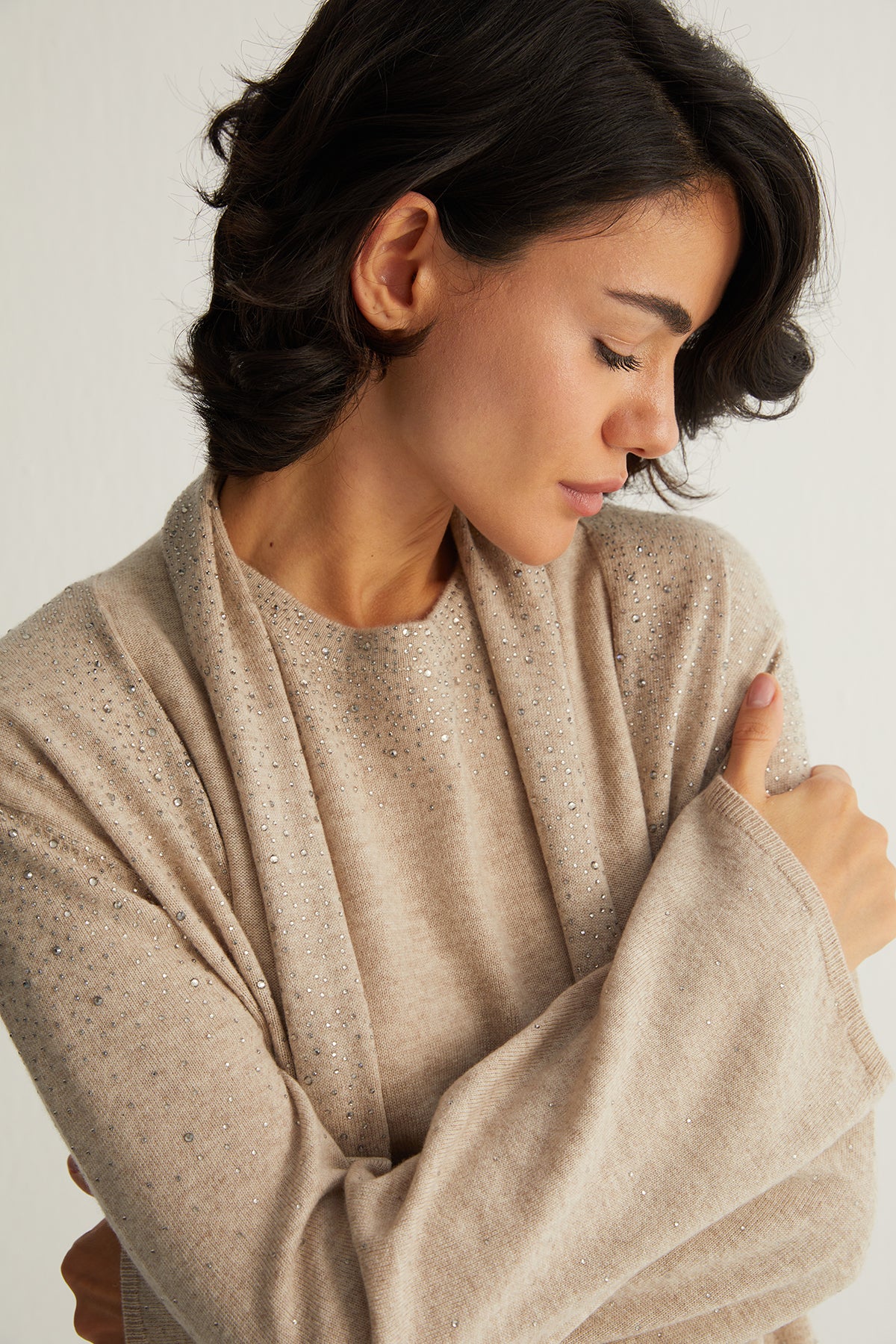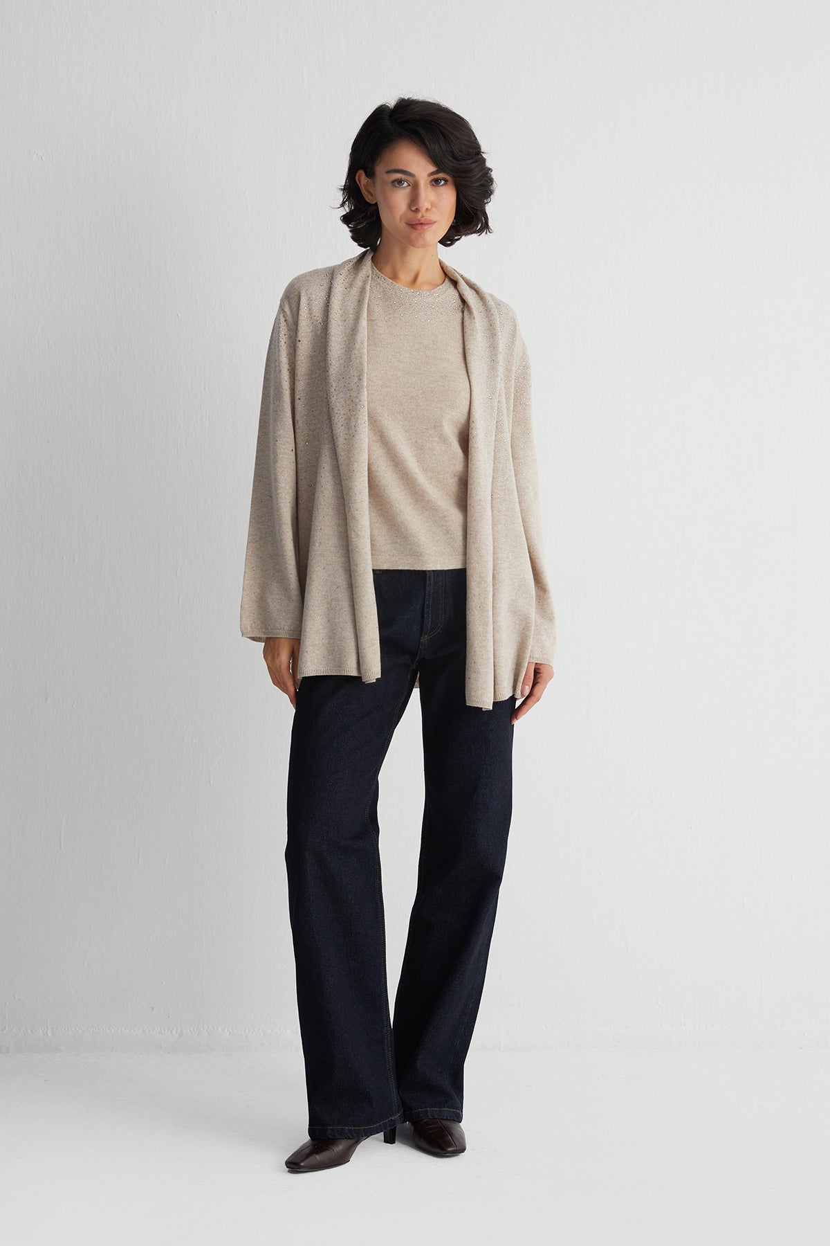 Taş detaylarının ışıltısıyla zarifçe bütünleşen bu bej şal yaka hırka, kaşmirin doğal yumuşaklığı ve yünün sıcaklığıyla vücudu narince sarar. Günün her saatine uyum sağlayan bu sade ama karakterli tasarım, dokunuşuyla ruhunuza da eşlik eder.