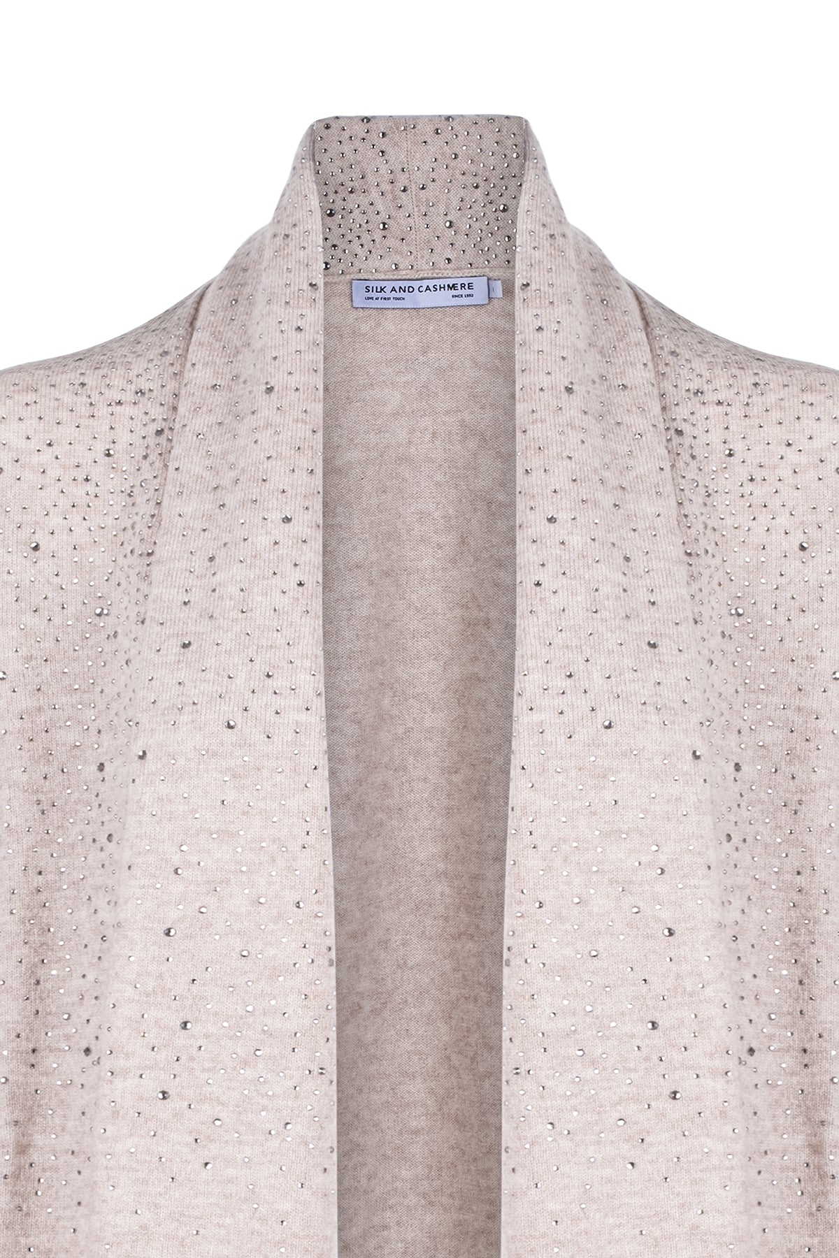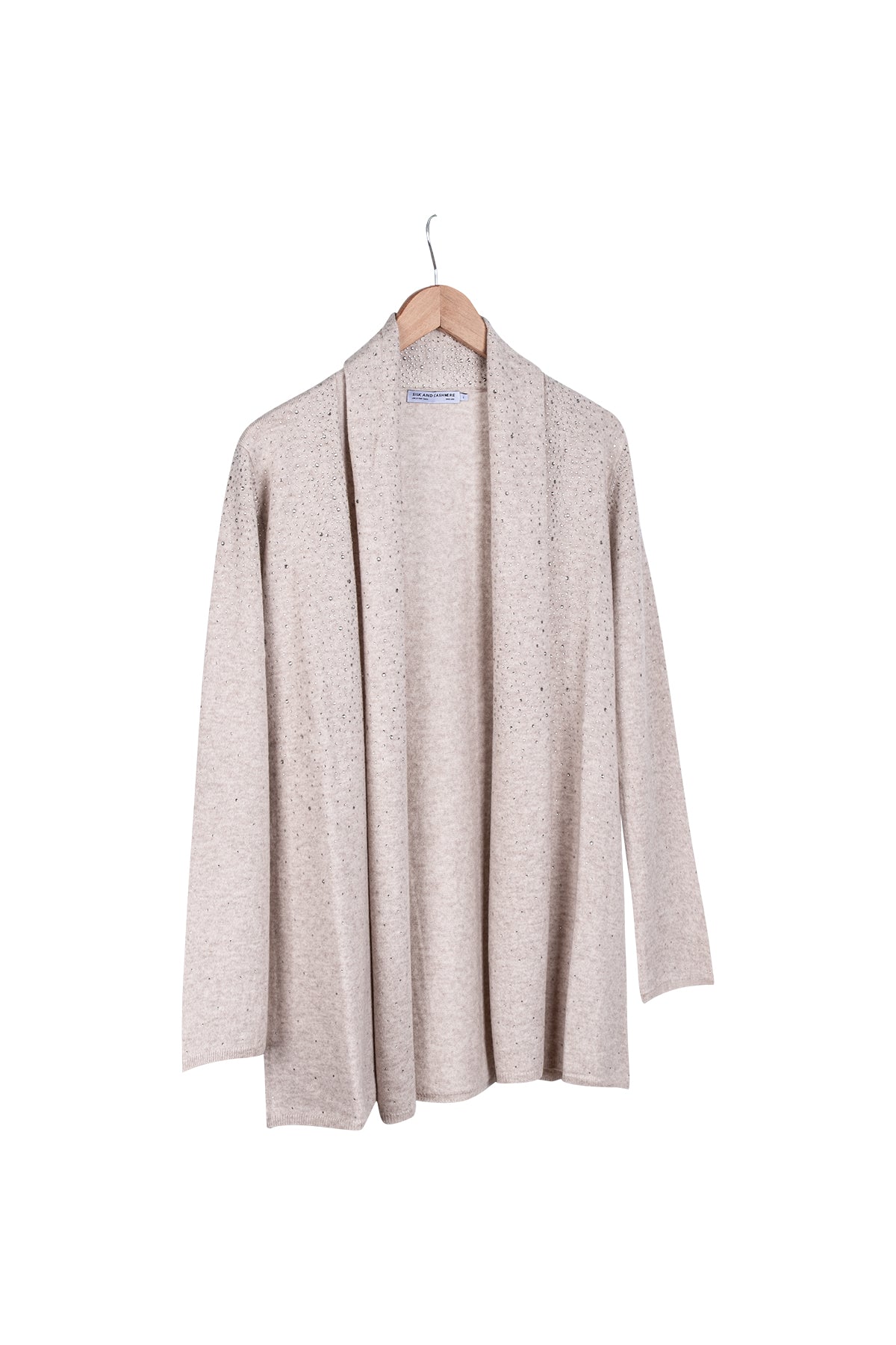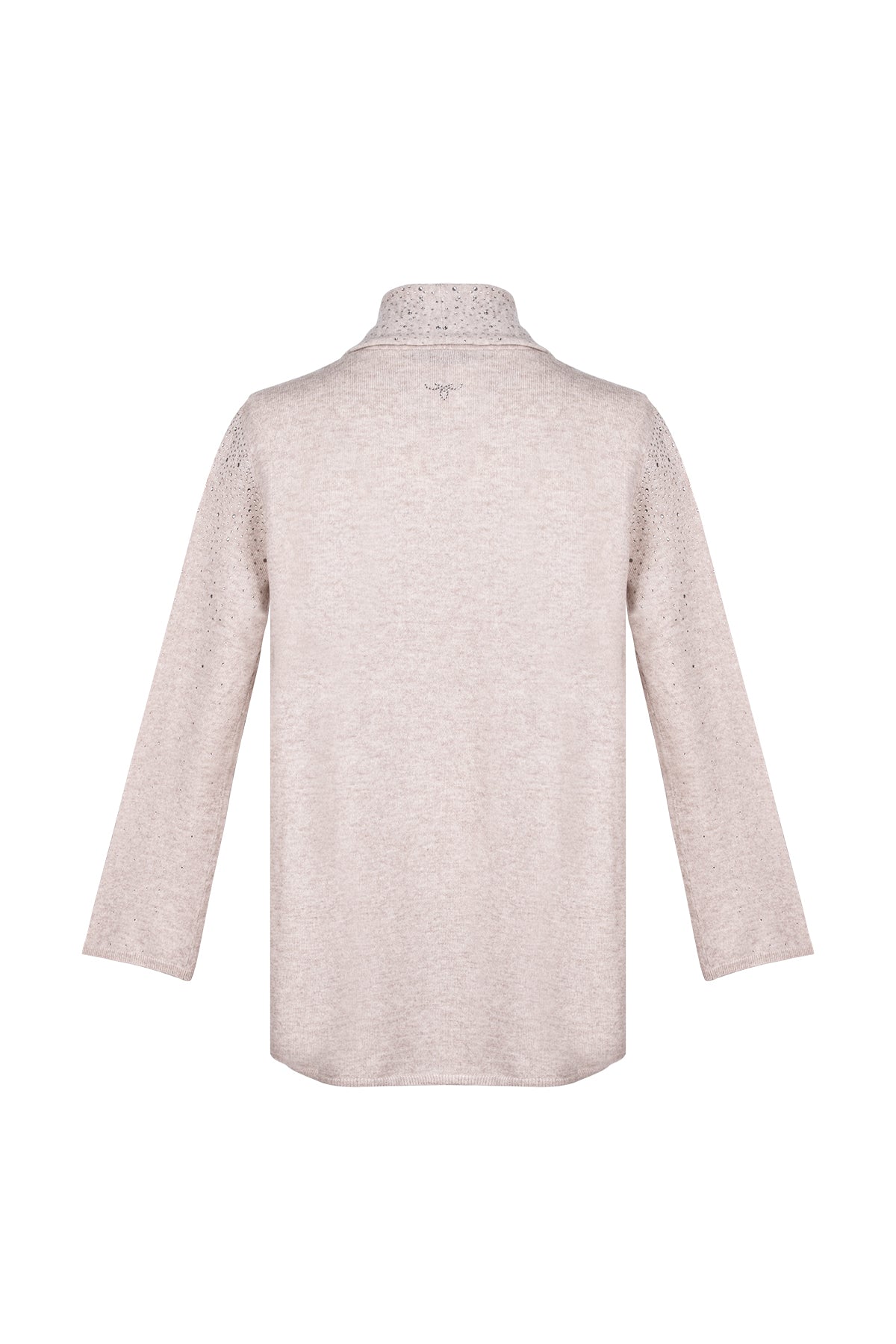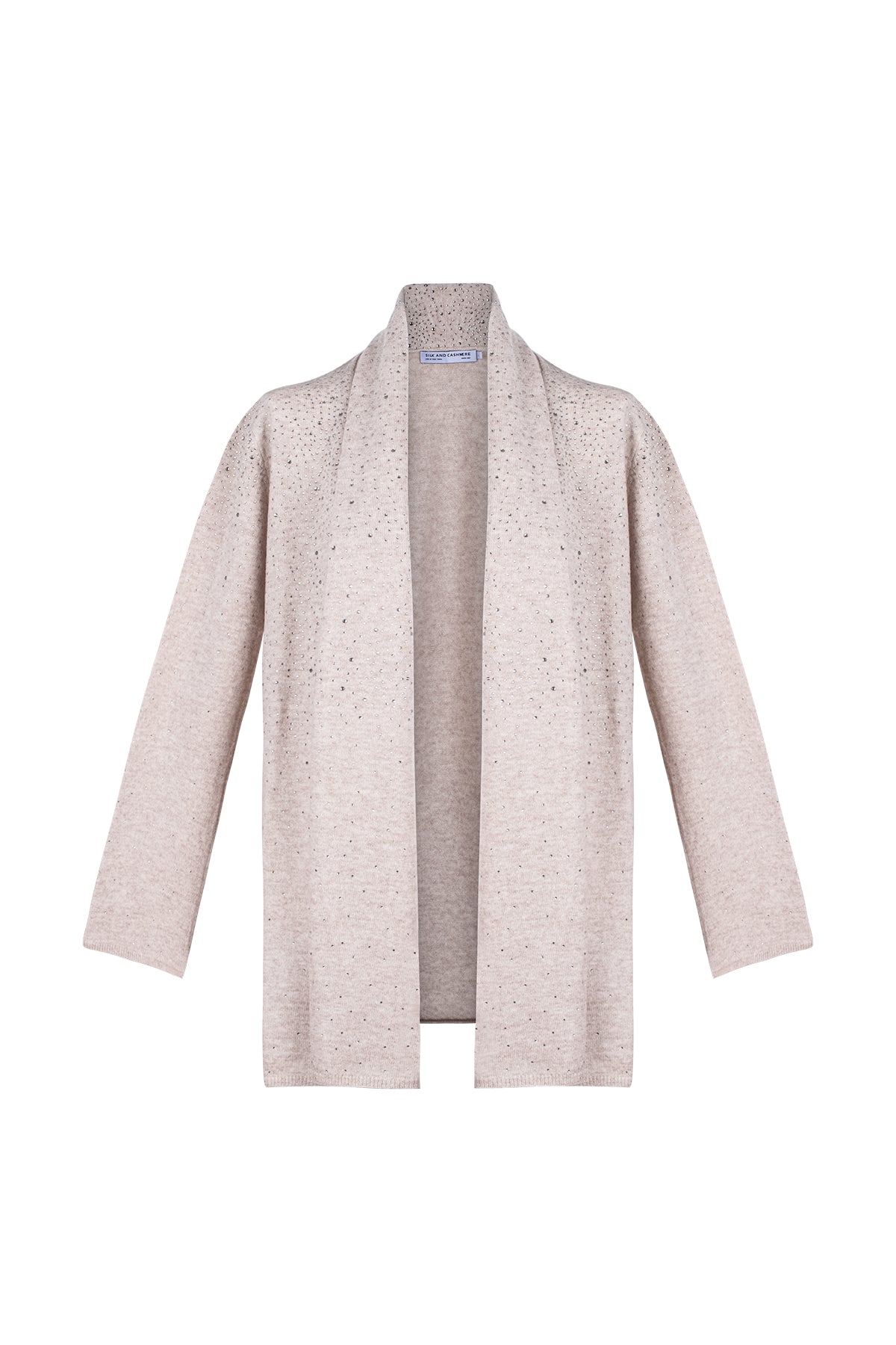 Taş detaylarının ışıltısıyla zarifçe bütünleşen bu bej şal yaka hırka, kaşmirin doğal yumuşaklığı ve yünün sıcaklığıyla vücudu narince sarar. Günün her saatine uyum sağlayan bu sade ama karakterli tasarım, dokunuşuyla ruhunuza da eşlik eder.