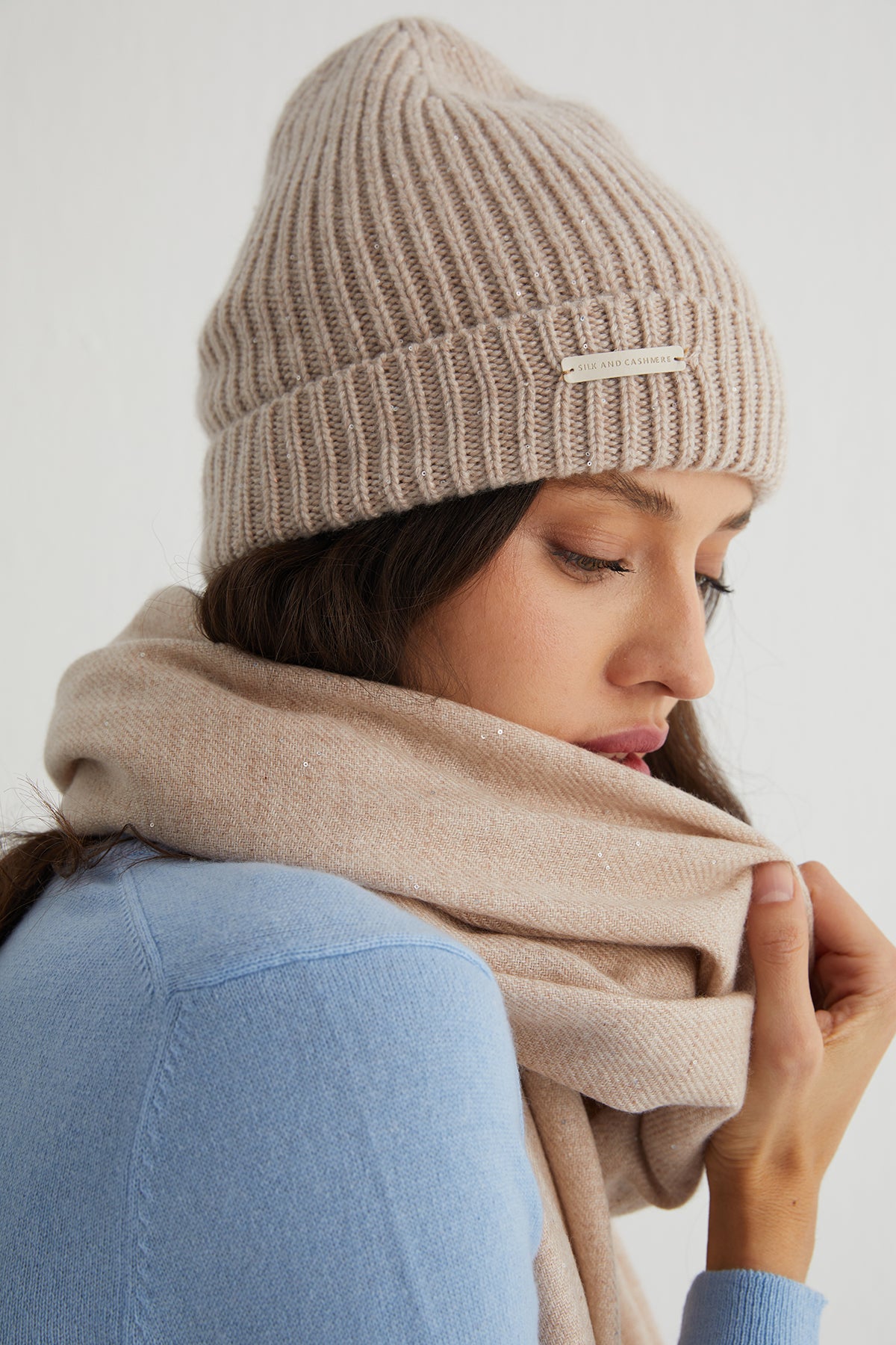 Paris serisinin bir parçası olan bu bere, yalın çizgiler ile zarif dokunuşları bir araya getiriyor. İnce pullarla bezenmiş yapısı, ışıltıyı abartıdan uzak bir incelikle taşırken, saf kaşmirin doğal sıcaklığı ve yumuşaklığı ile gün boyu konfor sunar. Fonksiyonelliği estetikle buluşturan bu parça, kış mevsiminin güvenilir eşlikçilerinden biri olmaya aday.