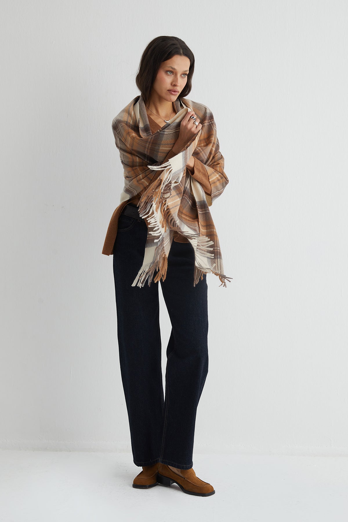 Bej Rose Saf Kaşmir Kareli Şal 70x200 cm