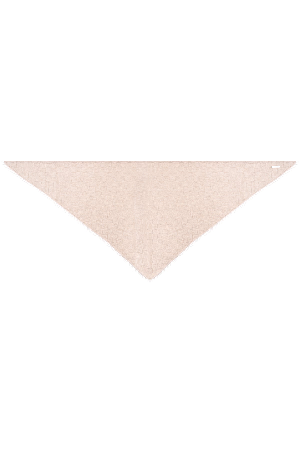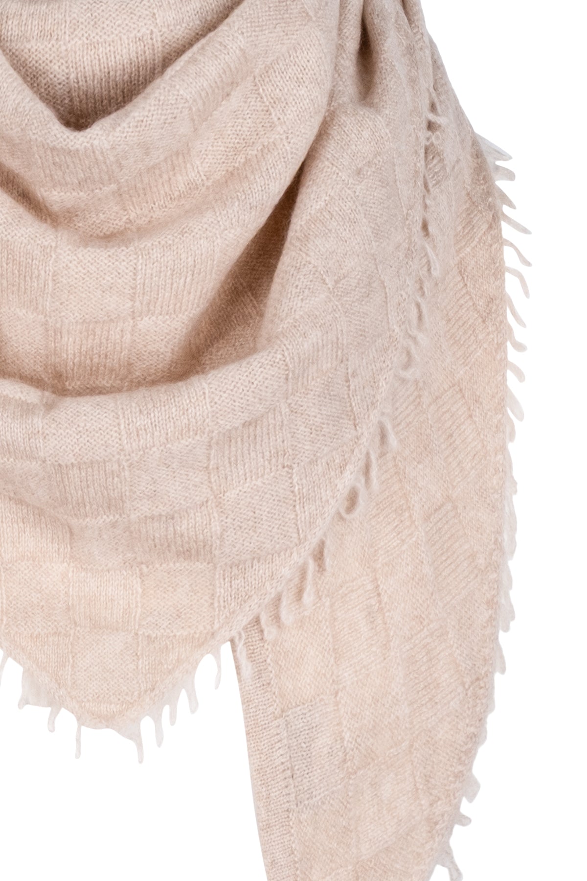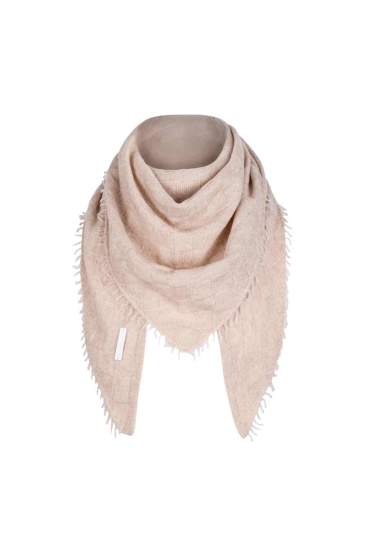 Bu üçgen şal, saf kaşmirin doğal yumuşaklığıyla dokunsal bir deneyim sunarken, yüzeyindeki hafif dokulu kare deseniyle sadeliğe derinlik katıyor. Saçaklı kenarları ve akışkan formu sayesinde zahmetsiz bir zarafetle kombinlerinize eşlik eder.