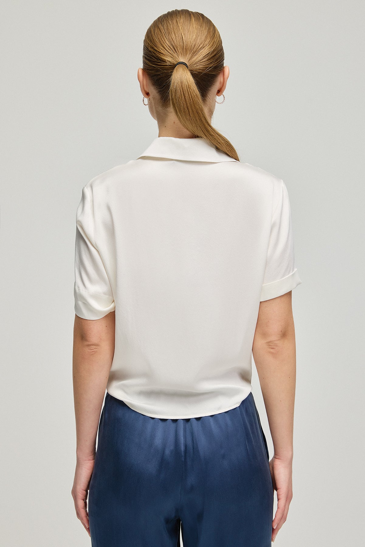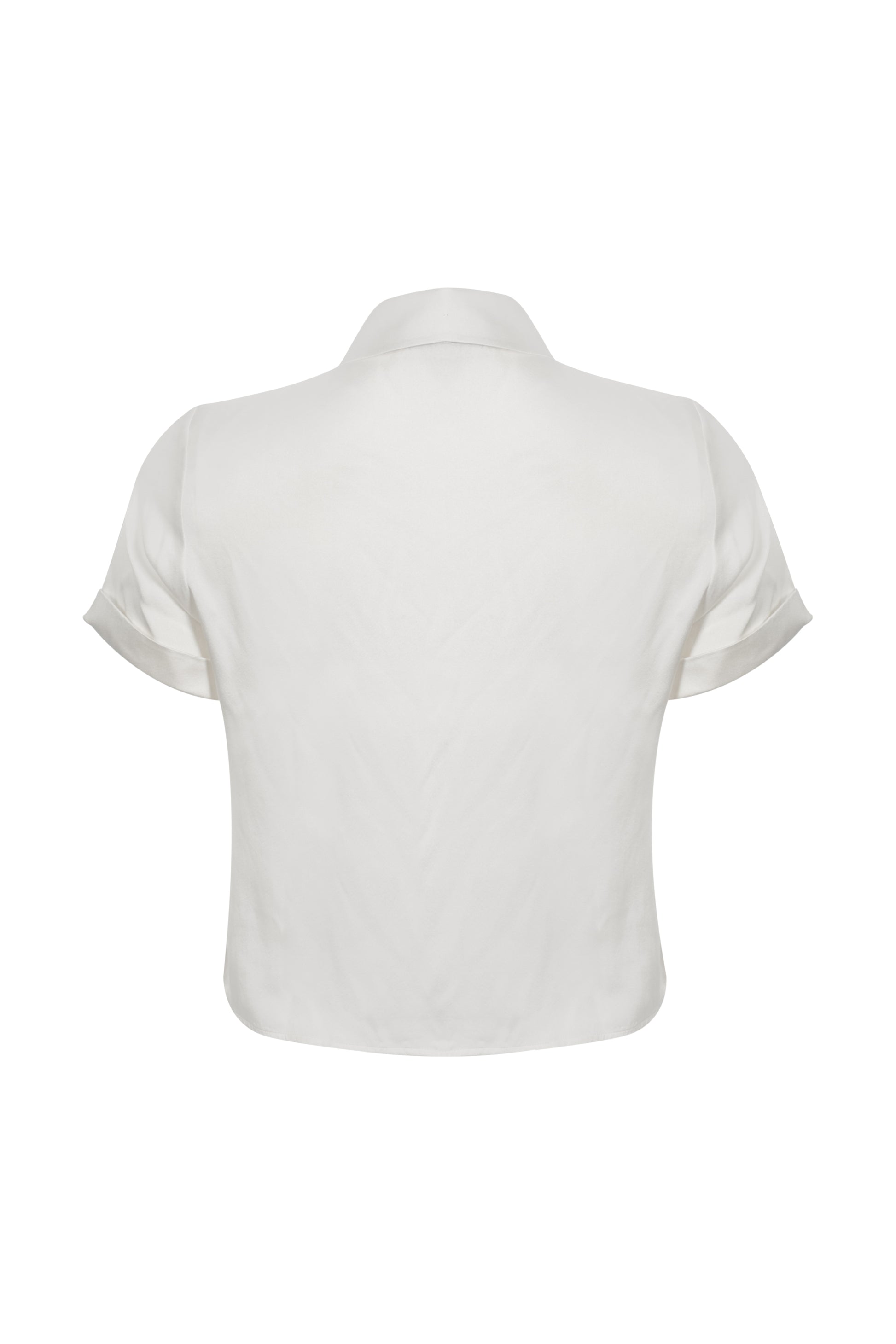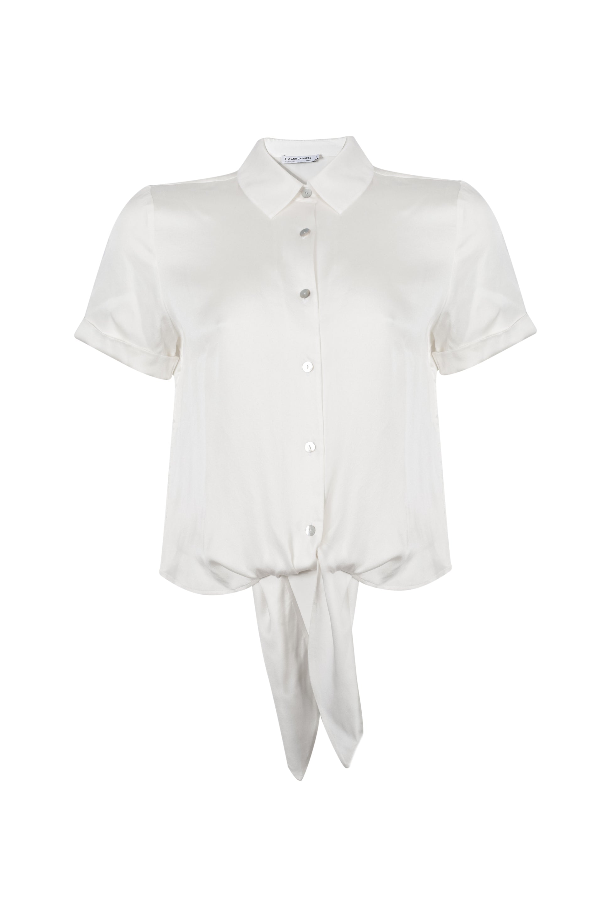Beyaz Audrey Saf İpek Kısa Kollu Önden Bağlamalı Gömlek