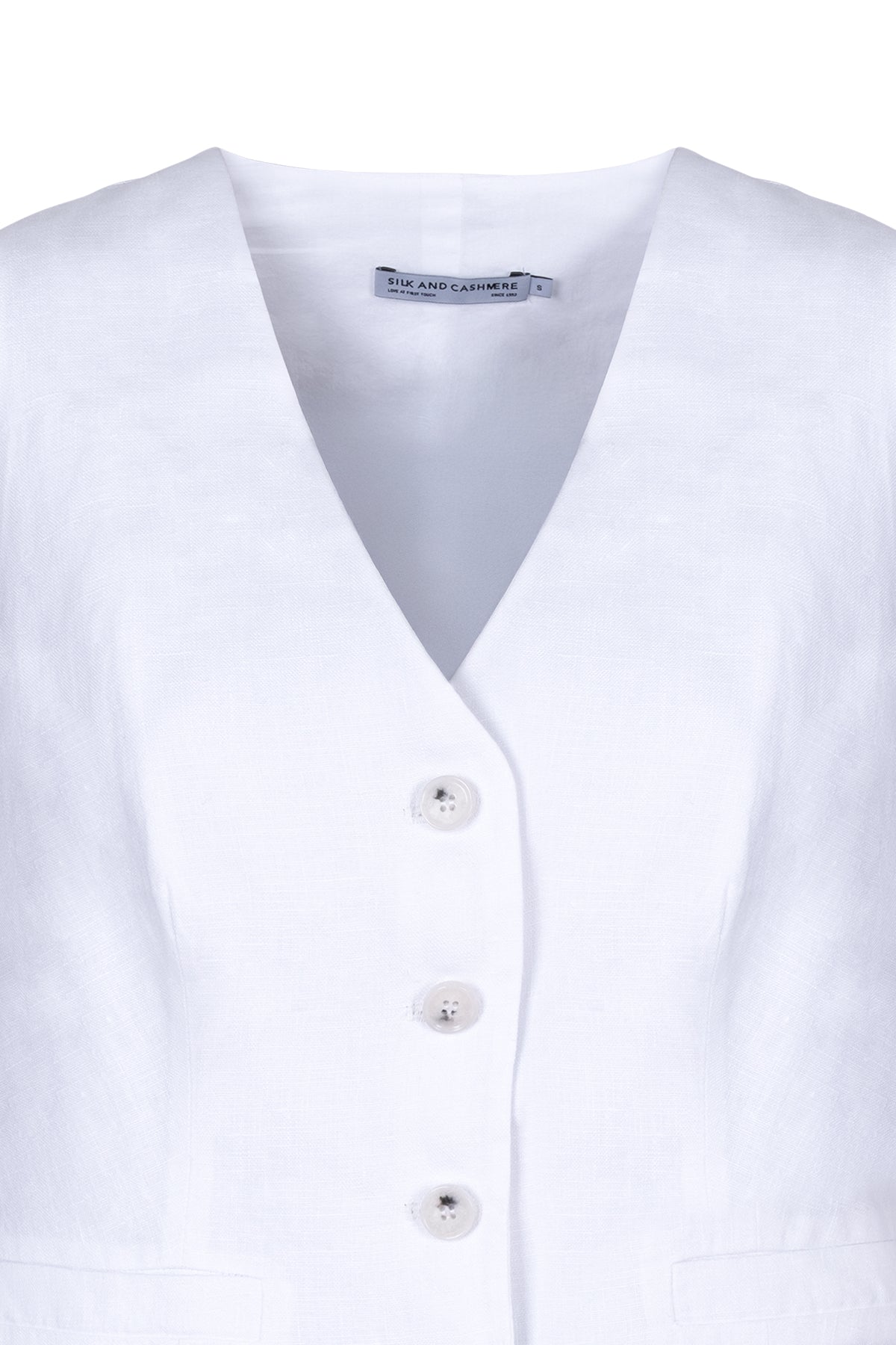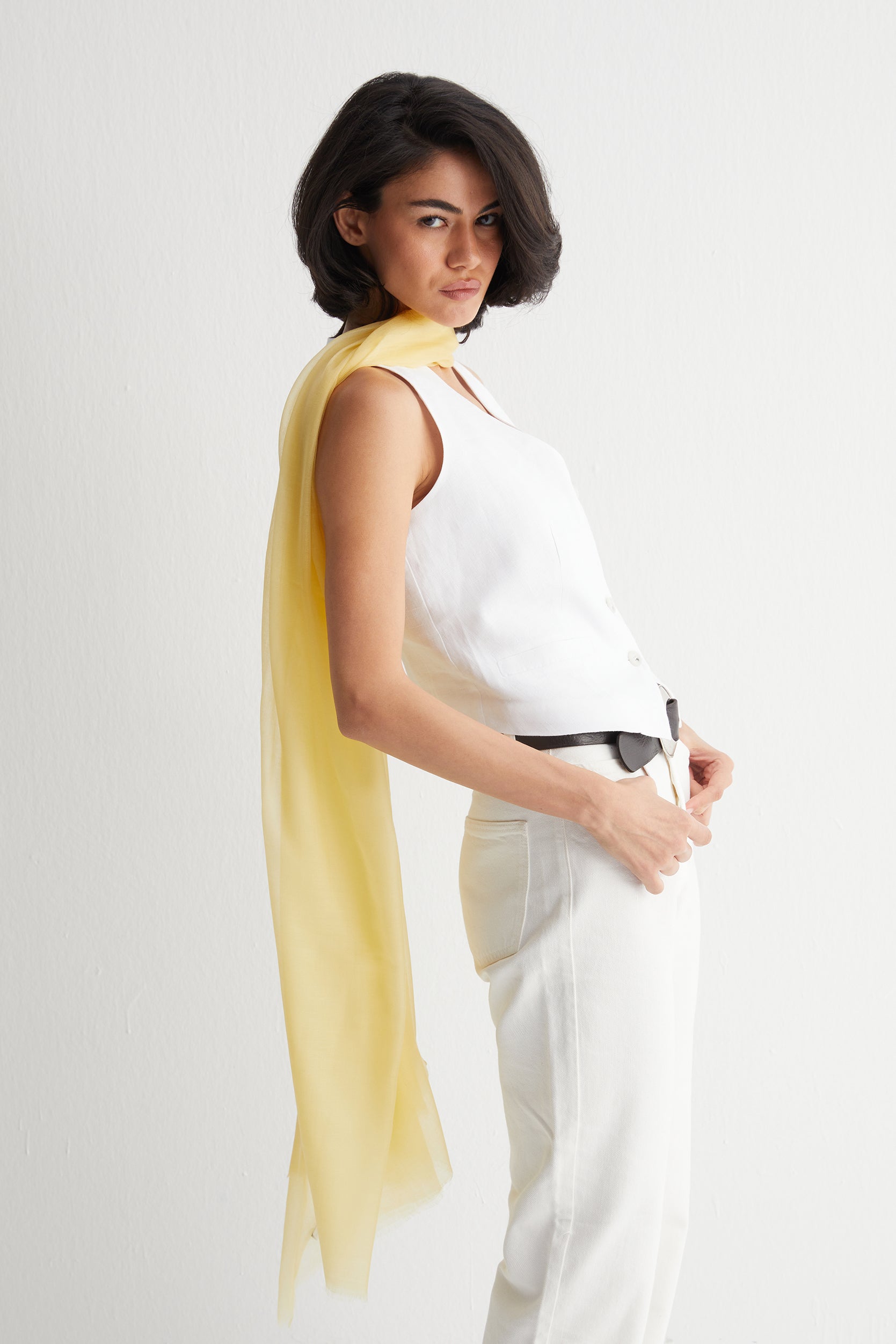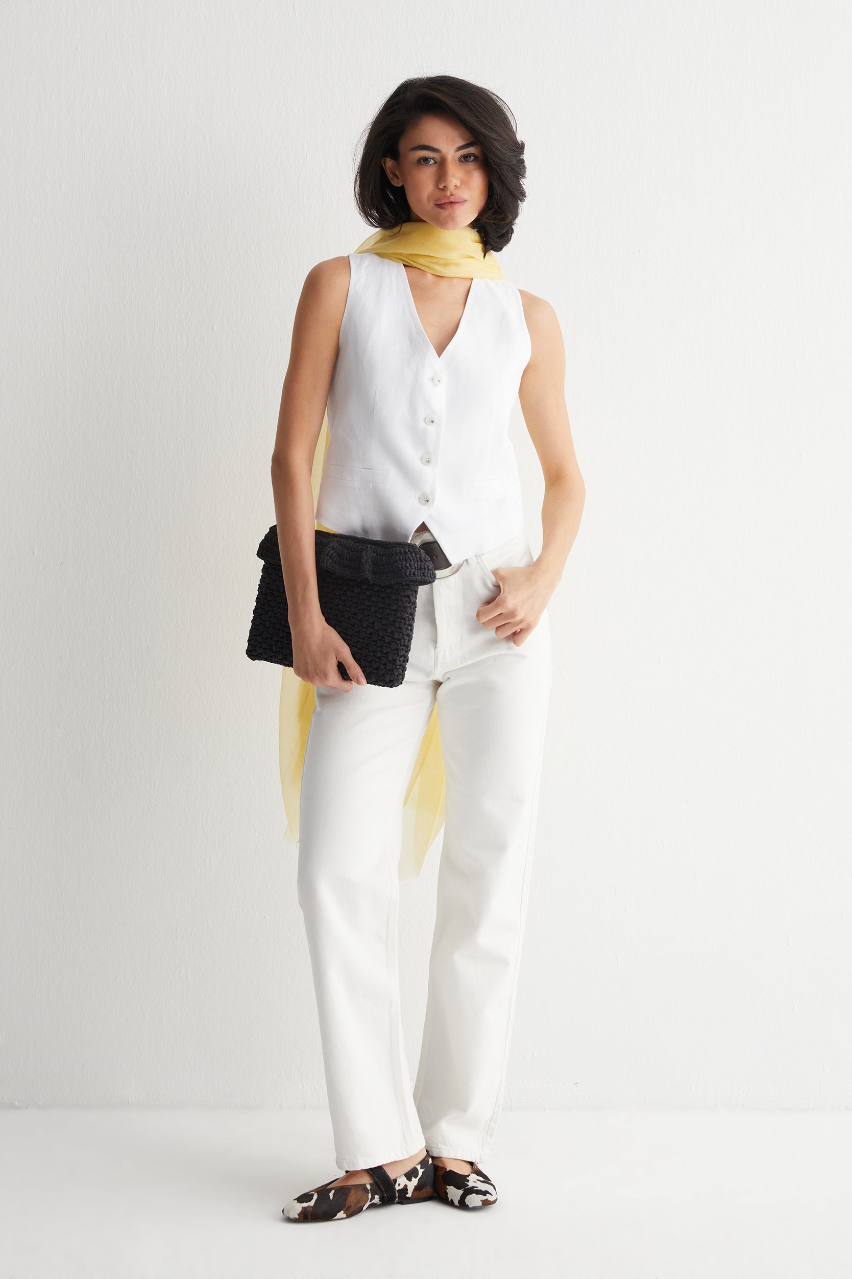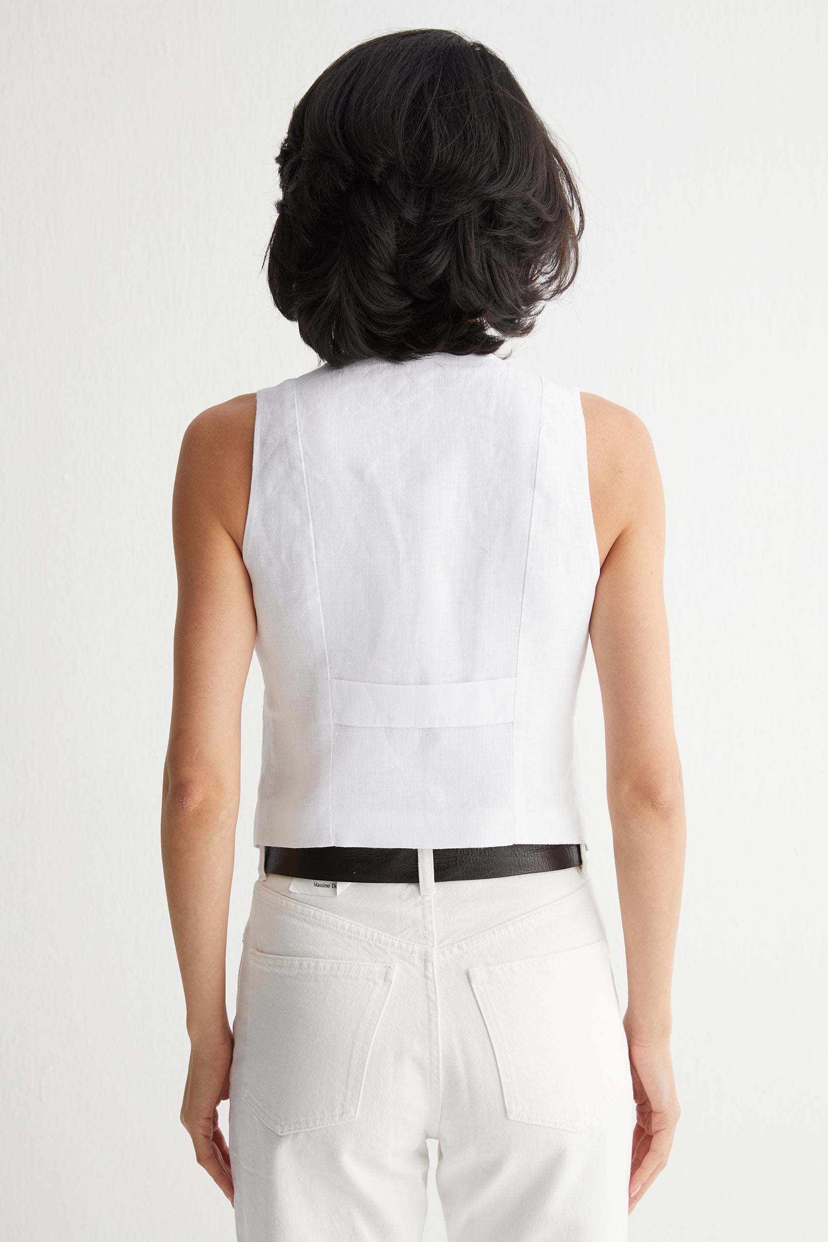 Klasik terzilikten ilham alarak yeniden yorumlanan bu beyaz keten yelek, yalınlığıyla öne çıkan güçlü bir parçadır. Hafif yapısı ve keskin hatları sayesinde katmanlı görünümlere doğal bir zarafet katar. Gardırobunuzda farklı stillerle kolayca uyum sağlayacak kadar esnek bir tamamlayıcıdır.