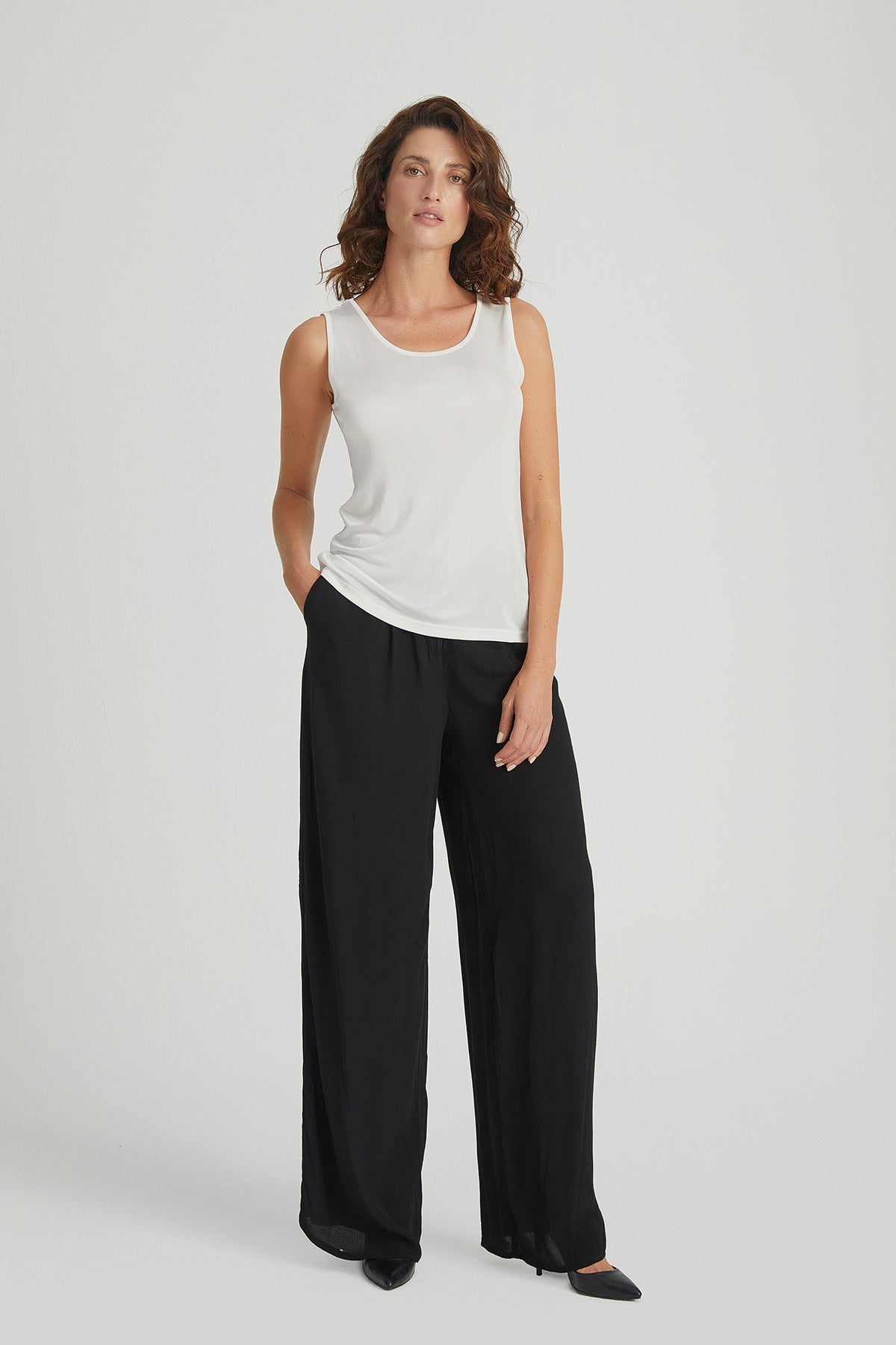 Zarafeti ve konforu bir arada sunan bu beyaz Marina İpekli Tişört, yaz günlerinin vazgeçilmezi olacak. %70 viskoz ve %30 ipek karışımından üretilmiş olan bu tişört, hafifliği ve yumuşak dokusu ile teninizi okşar. Klasik yuvarlak yaka ve kolsuz tasarımı, sıcak yaz günlerinde serinlik ve rahatlık sağlar.