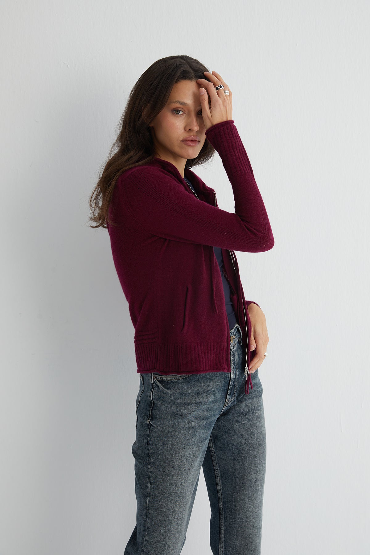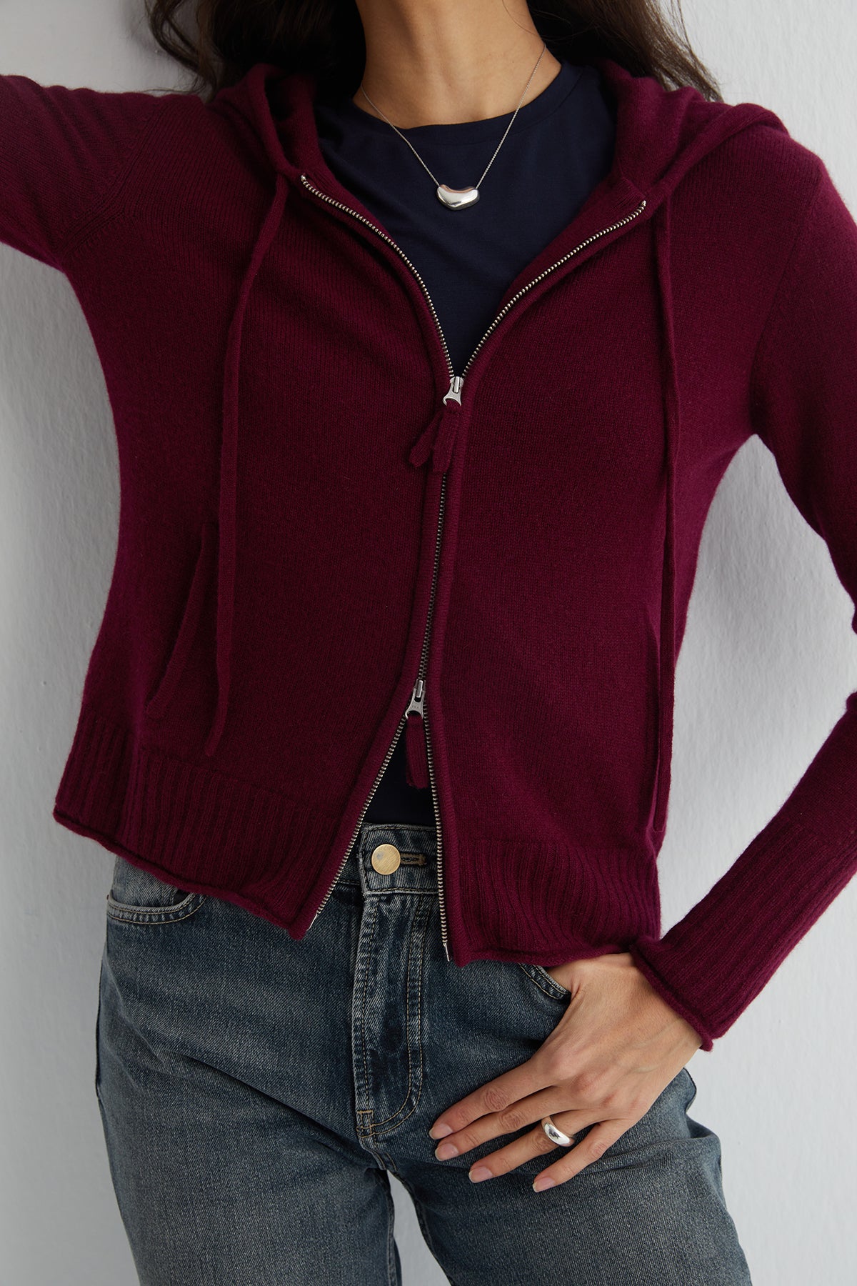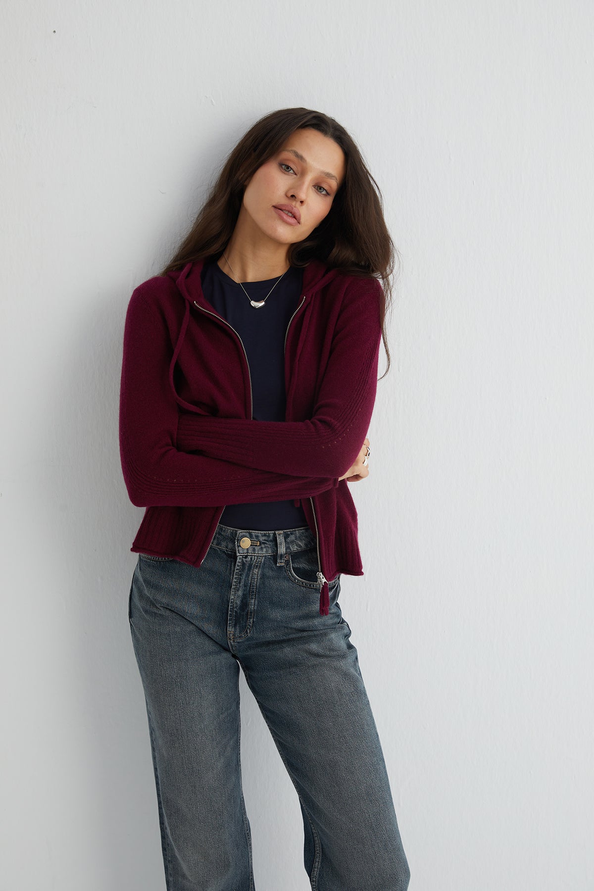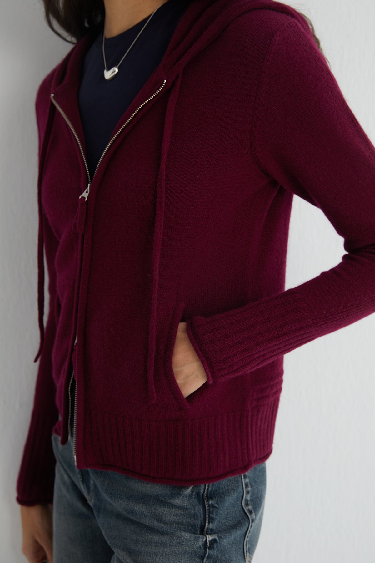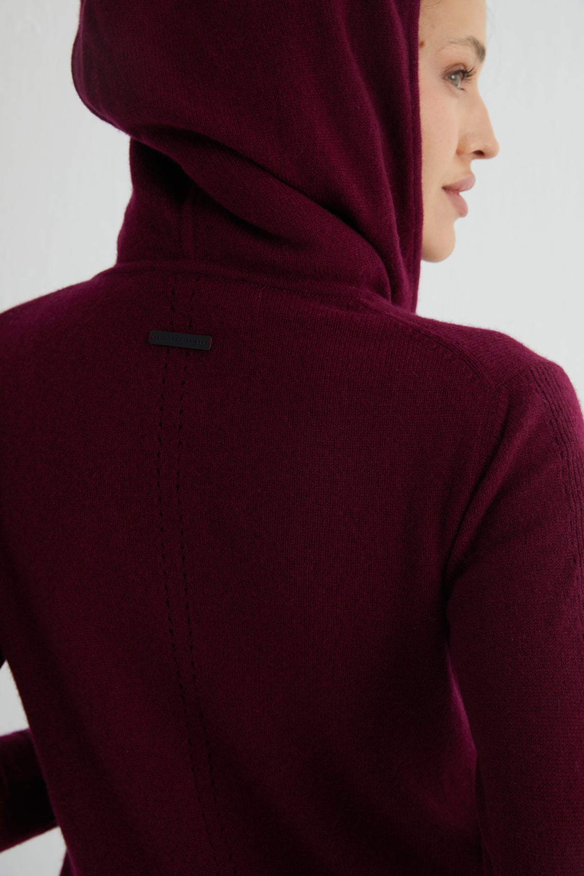 Bordo Isabella Saf Kaşmir Kapüşonlu Hırka