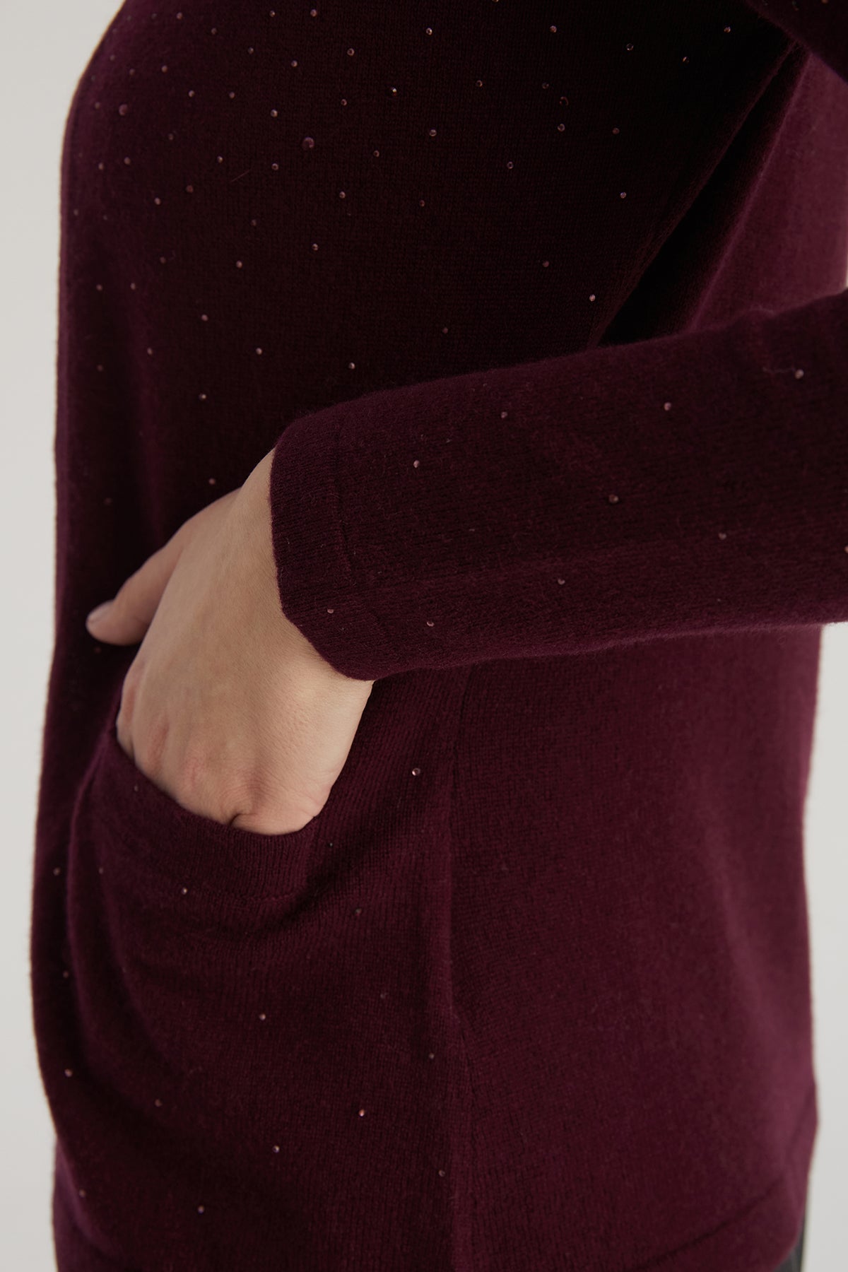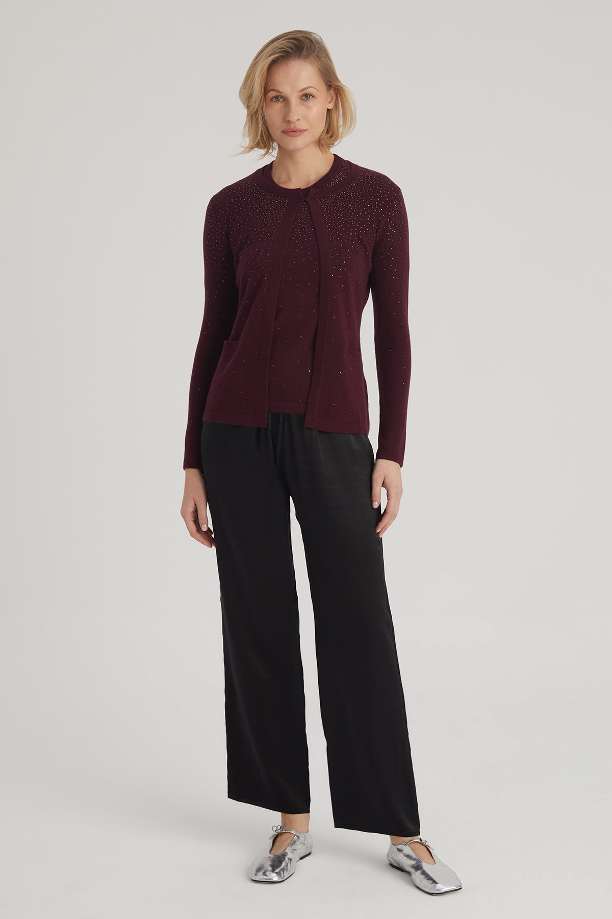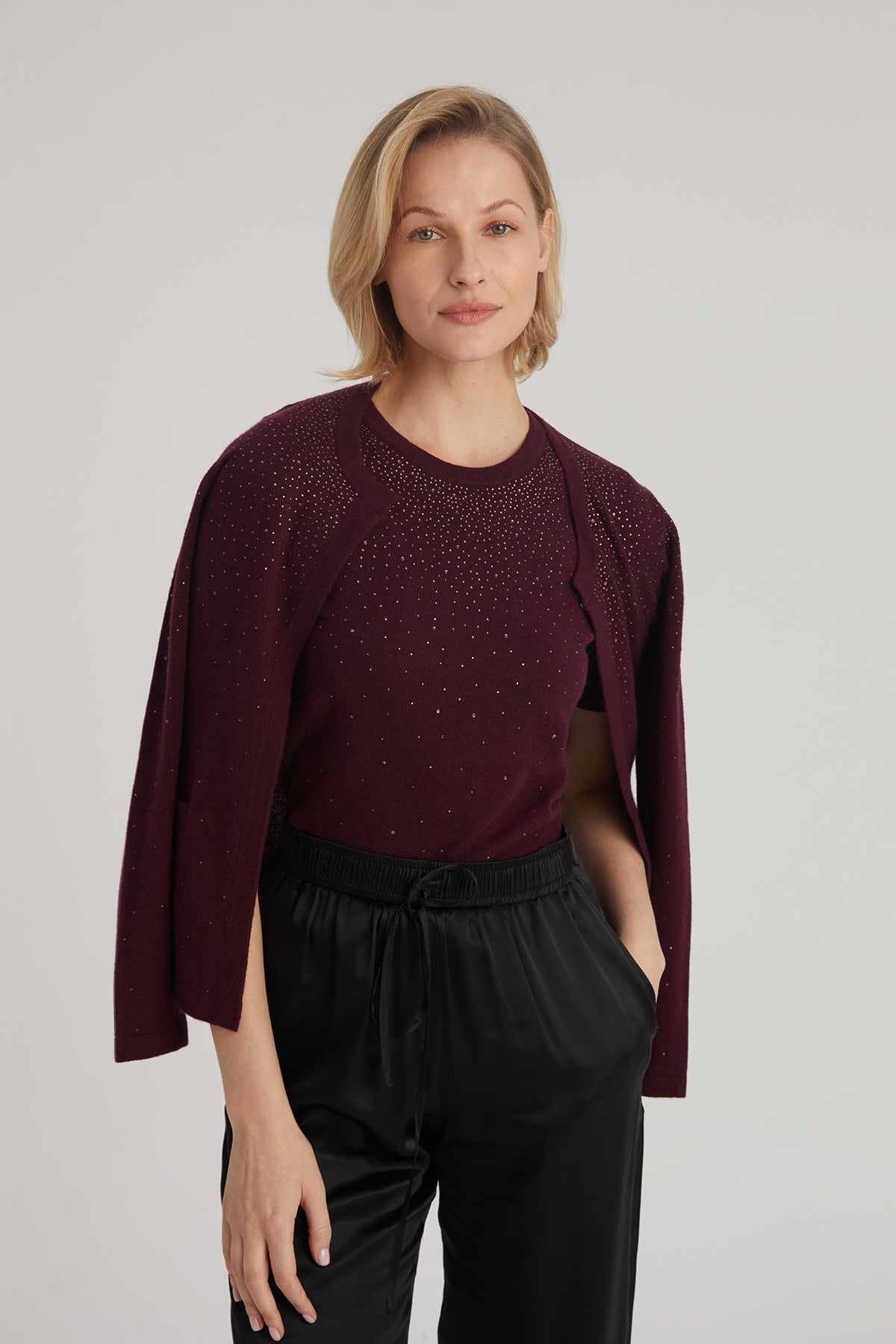 Bordo rengin zarif tonuyla birleşen bu yün kaşmir hırka, taş işlemeli detaylarıyla modern bir görünüm sunar. Hafif ve yumuşak yapısıyla her mevsimde rahatlık sağlayan bu hırka, açık ön tasarımı ve cepleriyle işlevselliği ön planda tutar. Günlük stilinize incelikli bir dokunuş katar.