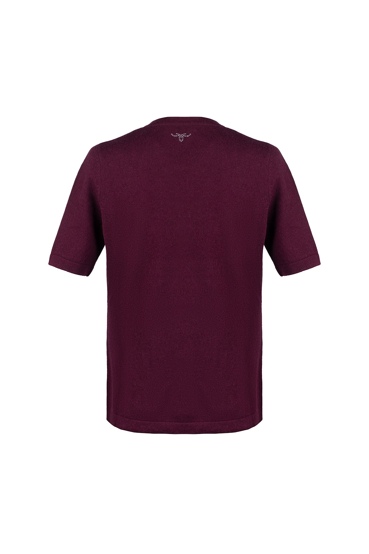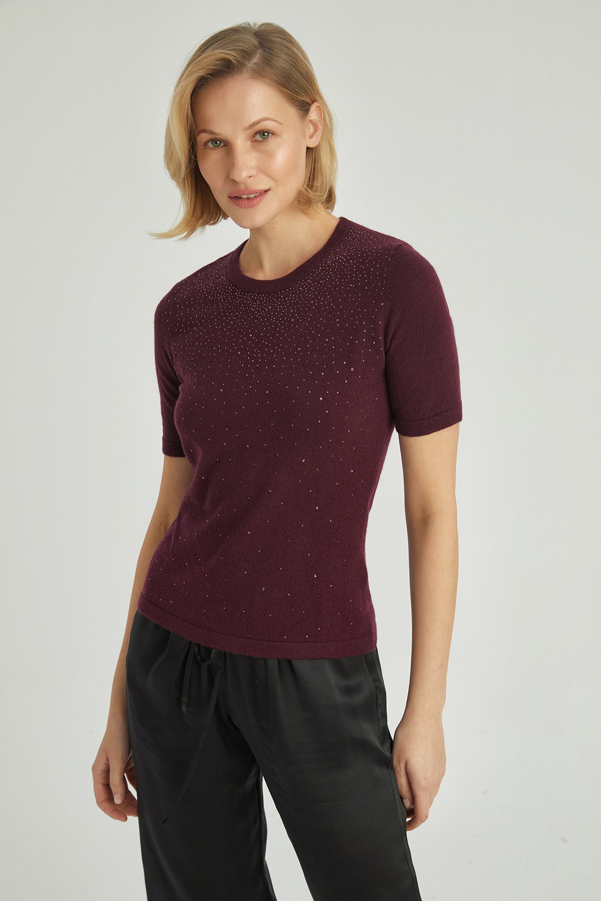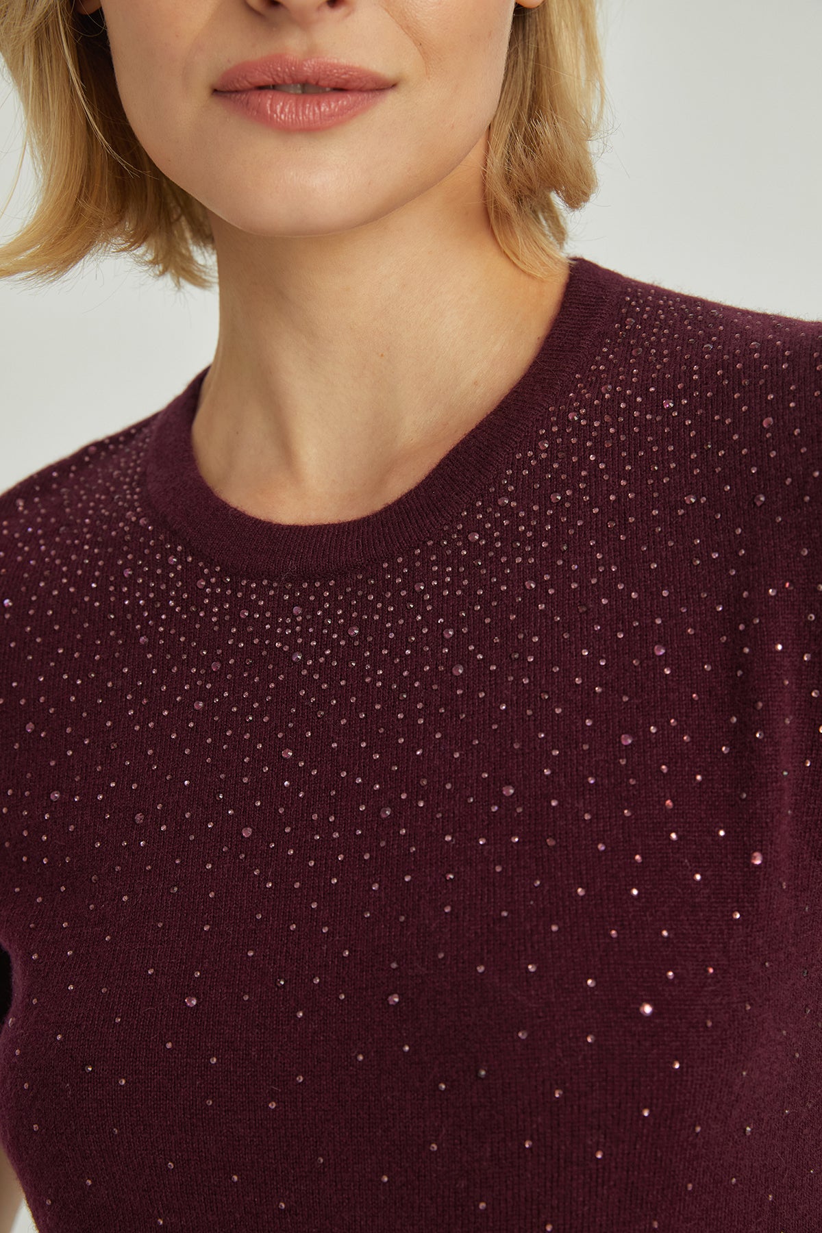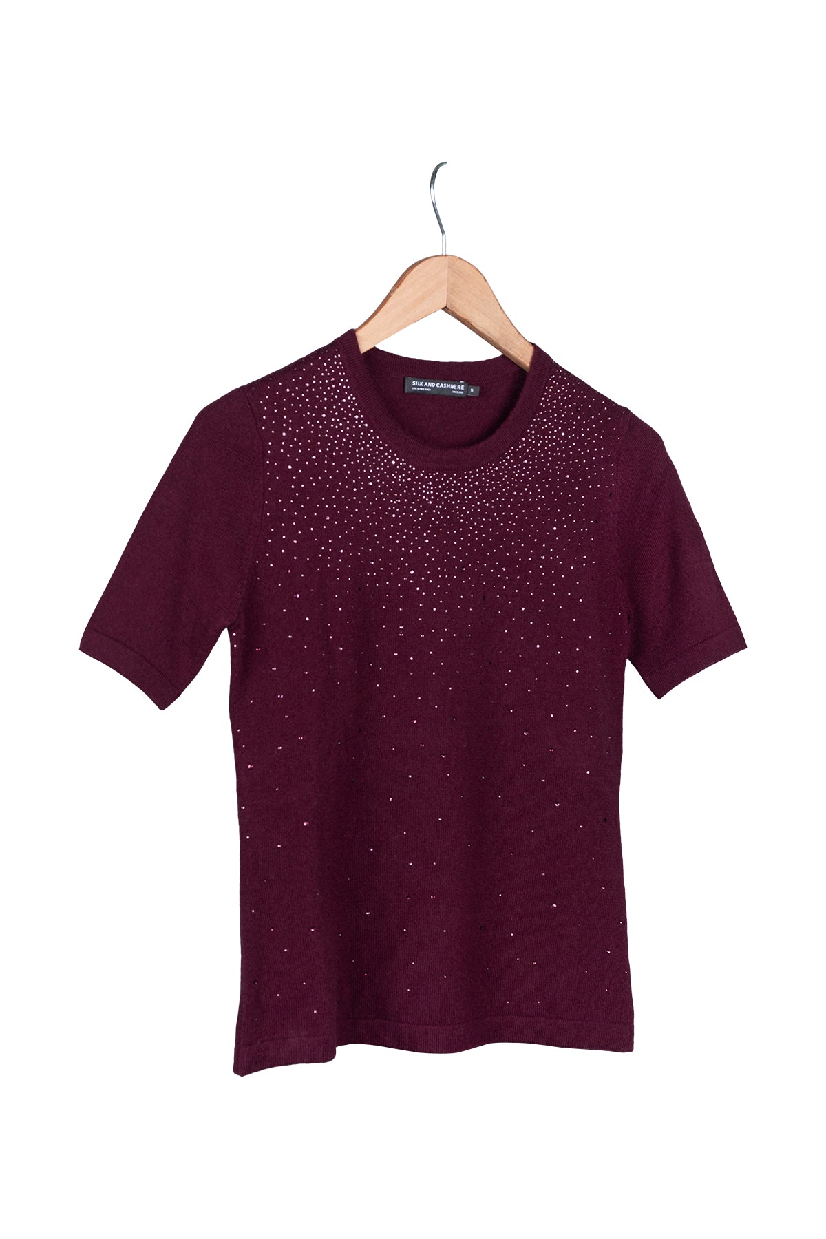 Bordo Merill Yün Kaşmir Yuvarlak Yaka Taşlı Kısa Kollu Triko