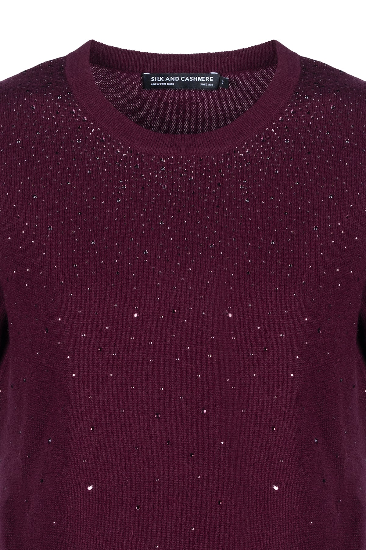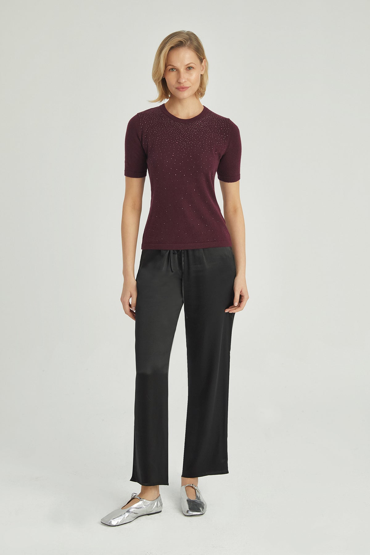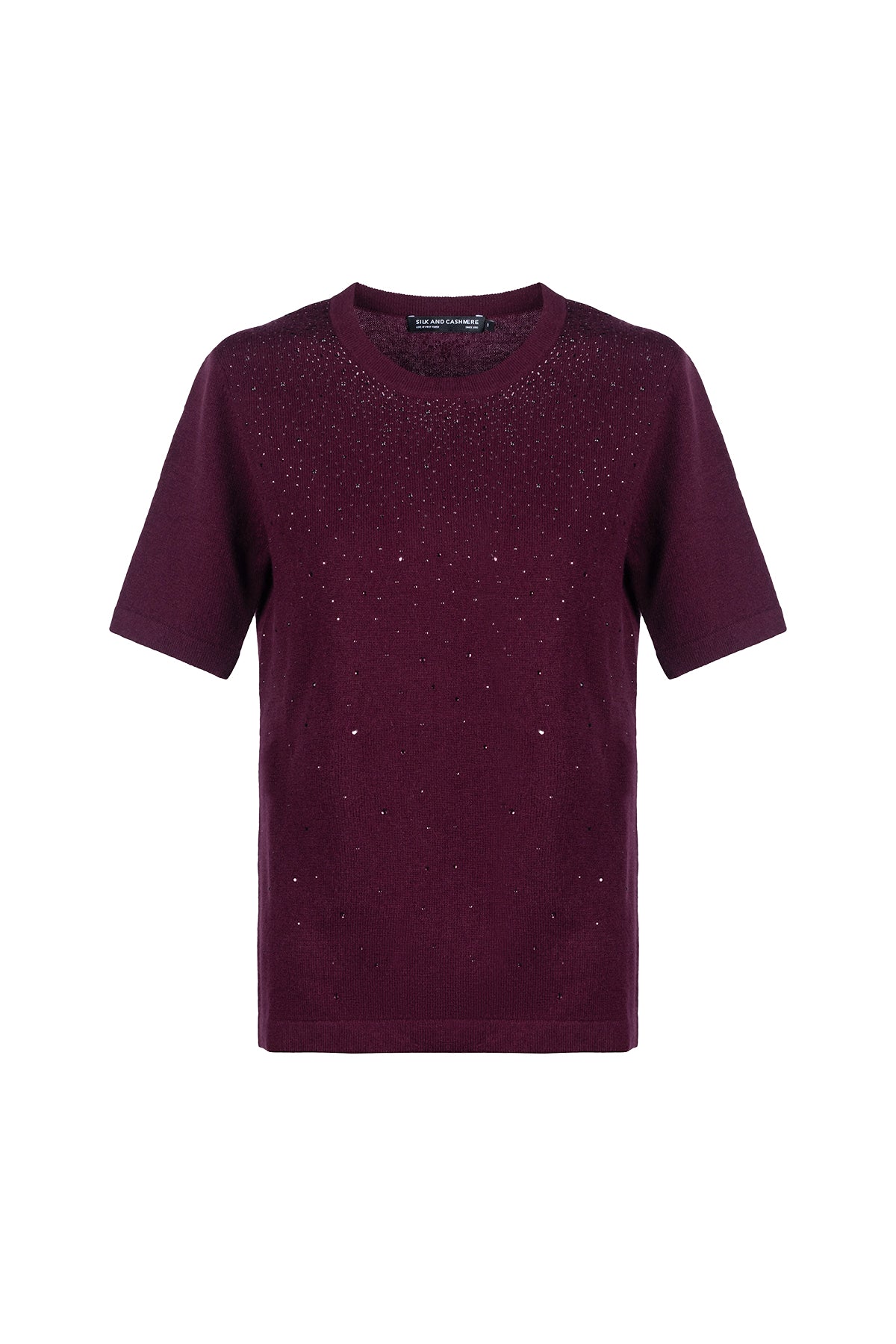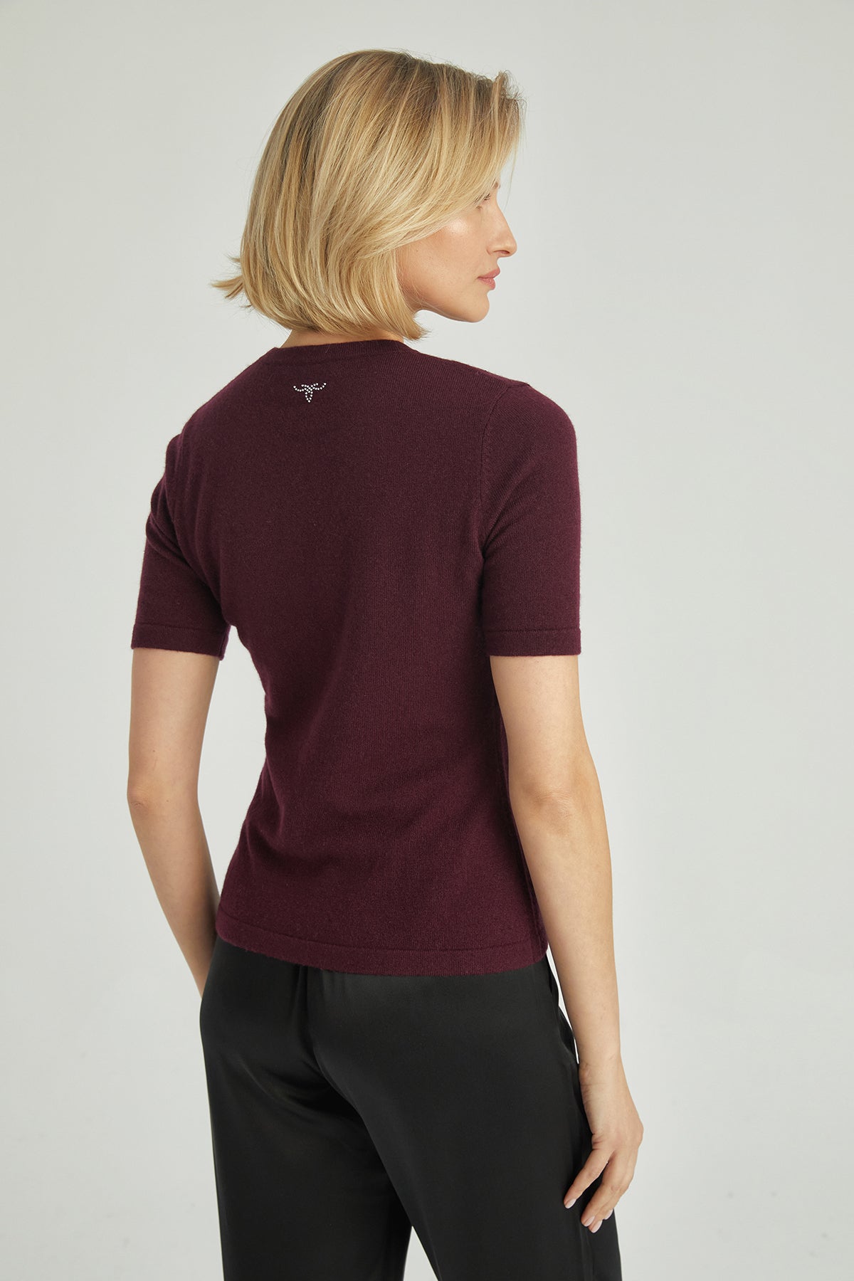 Bordo Merill Yün Kaşmir Yuvarlak Yaka Taşlı Kısa Kollu Triko