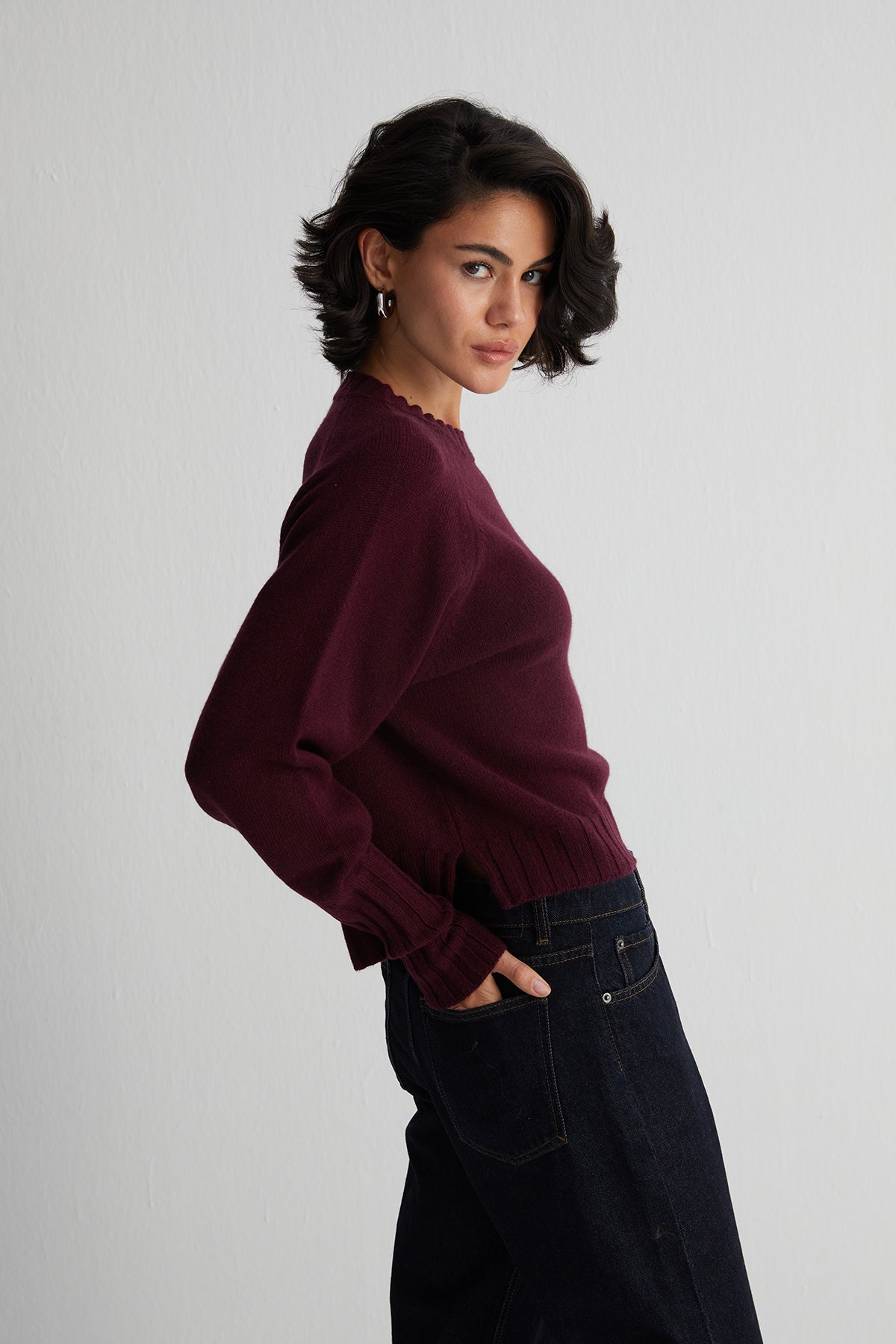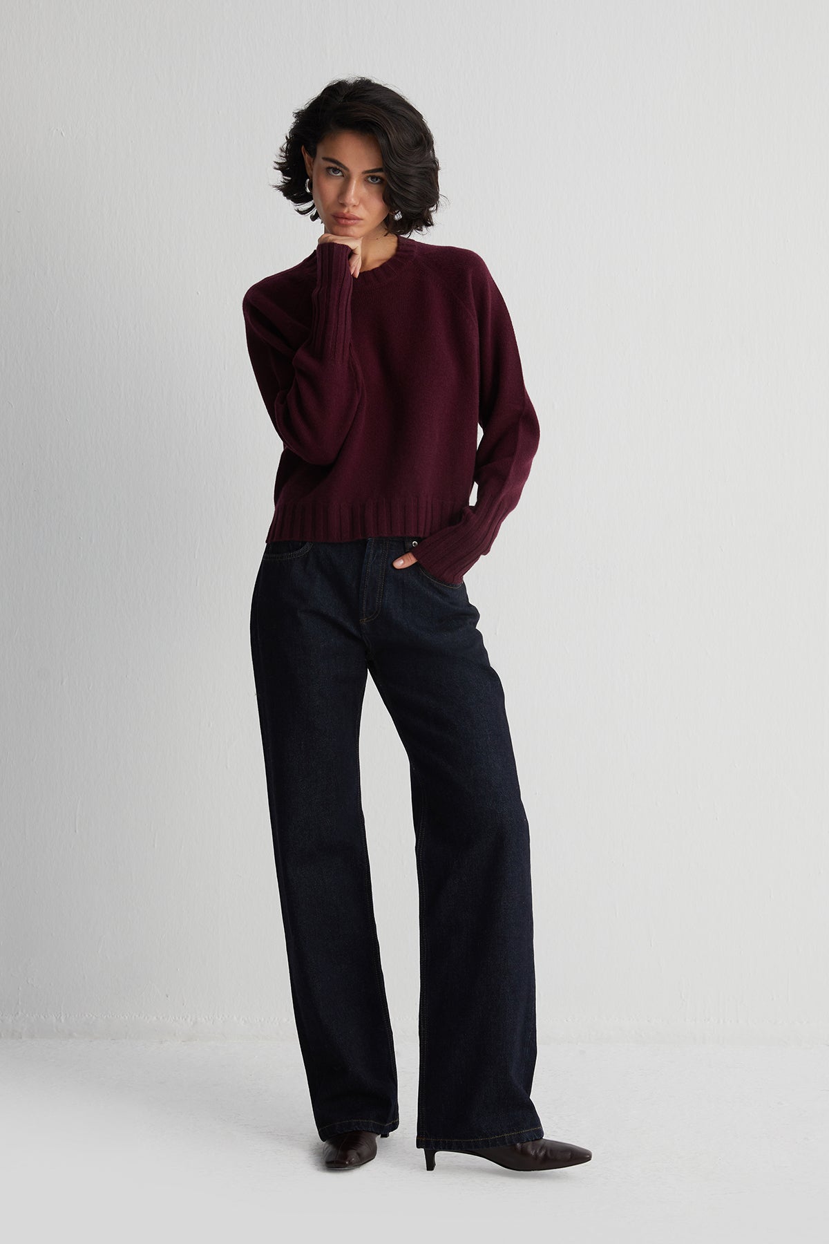 Bordo Vanessa Saf Kaşmir Yuvarlak Yaka Crop Kazak