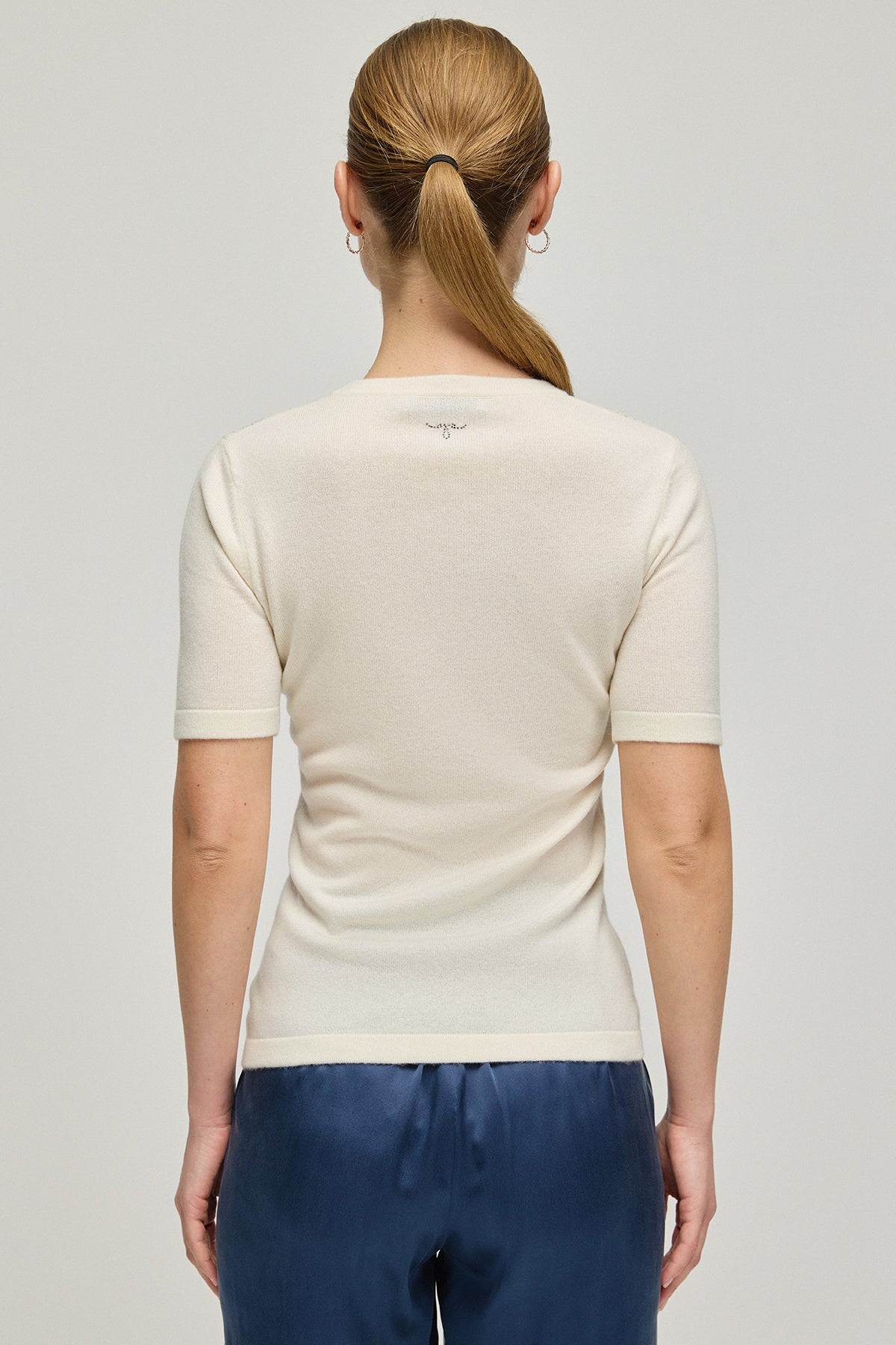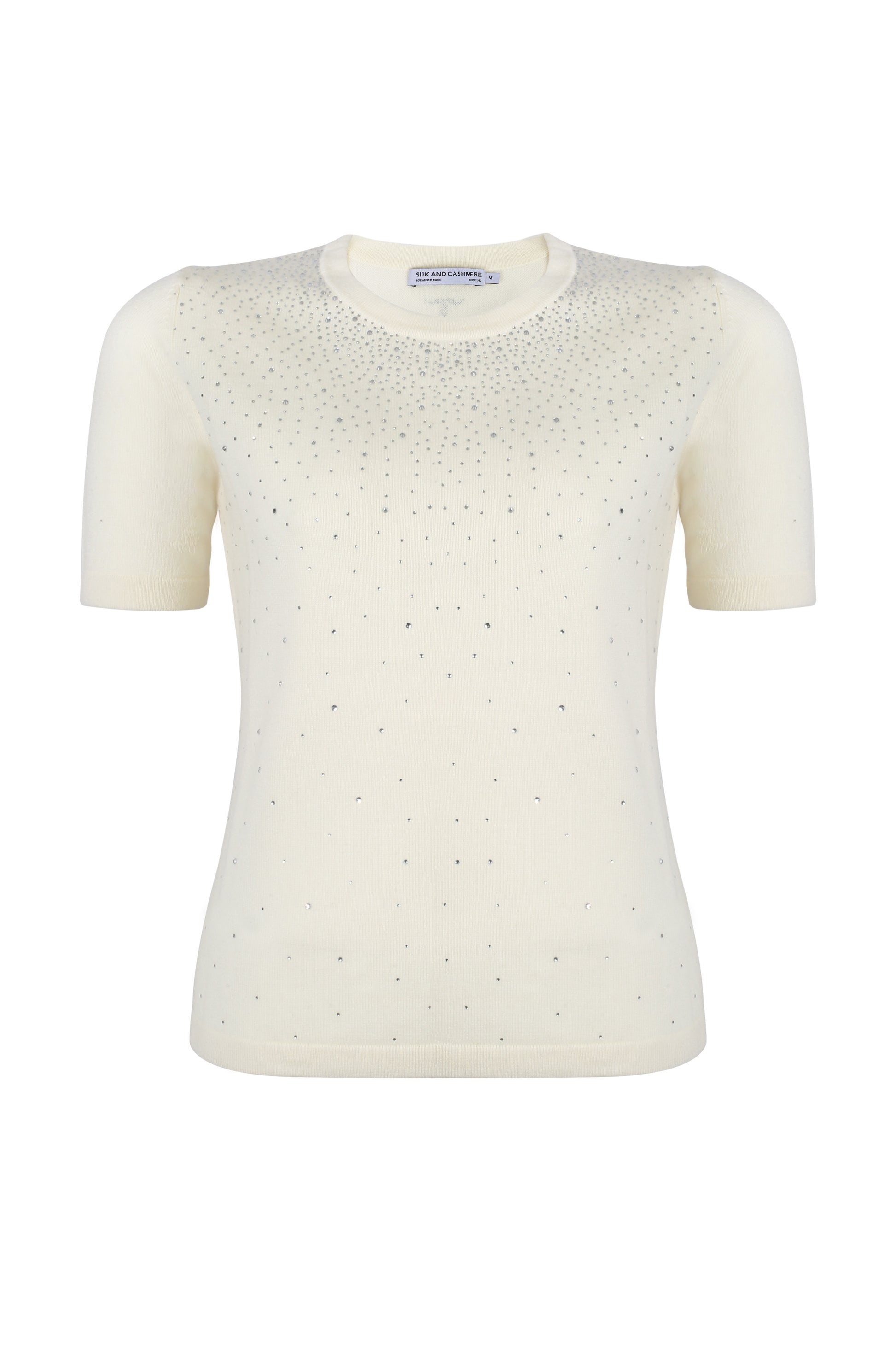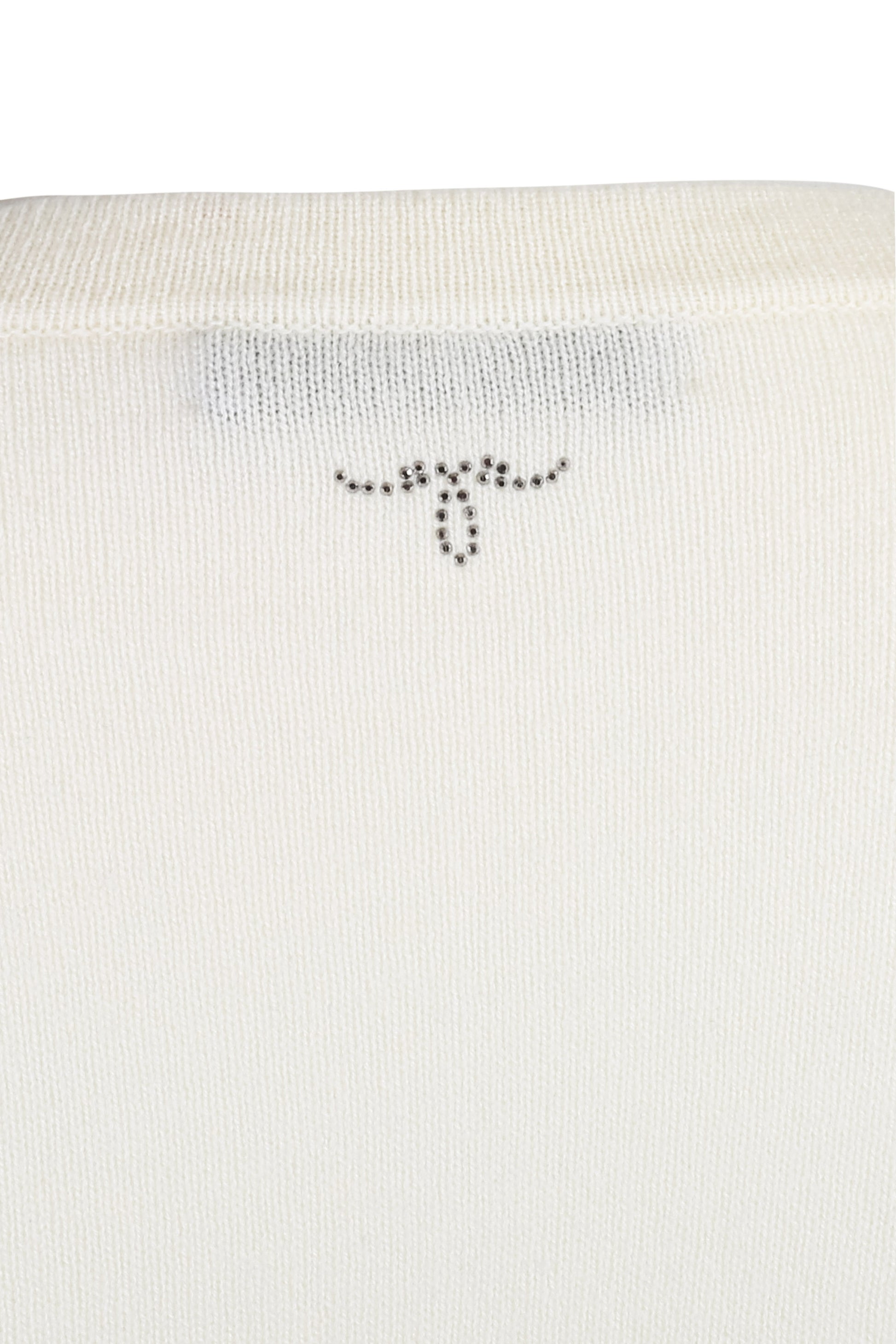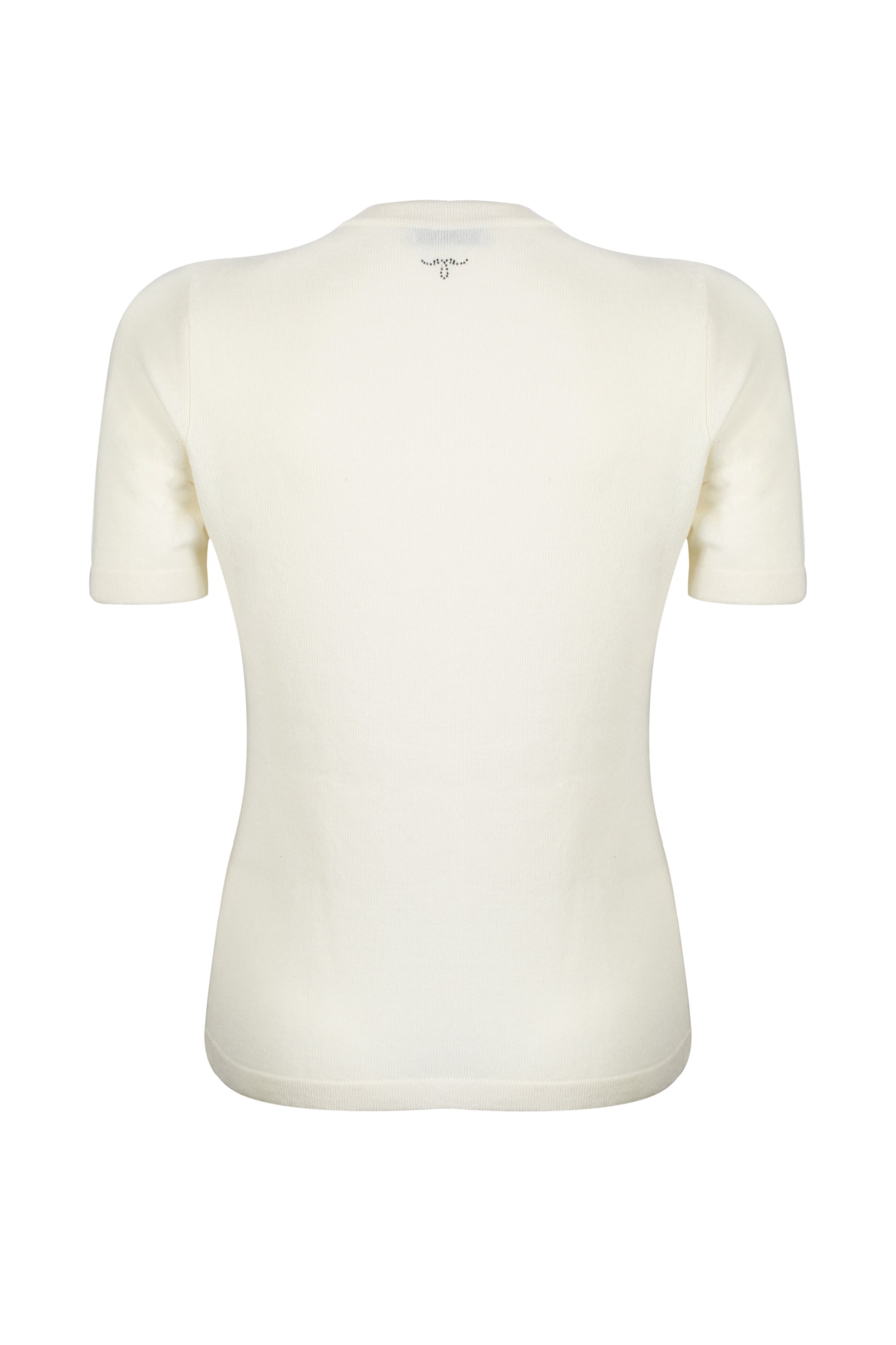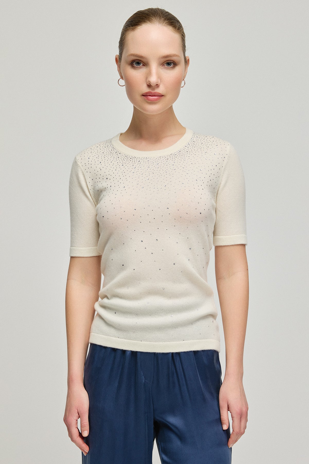 Ekru Kaşmir Yün Merril Yuvarlak Yaka Taş Süs Detaylı Kısa Kollu Triko