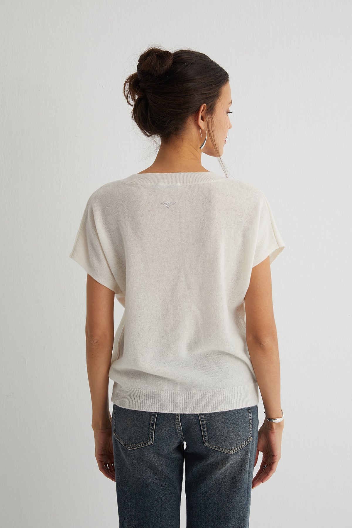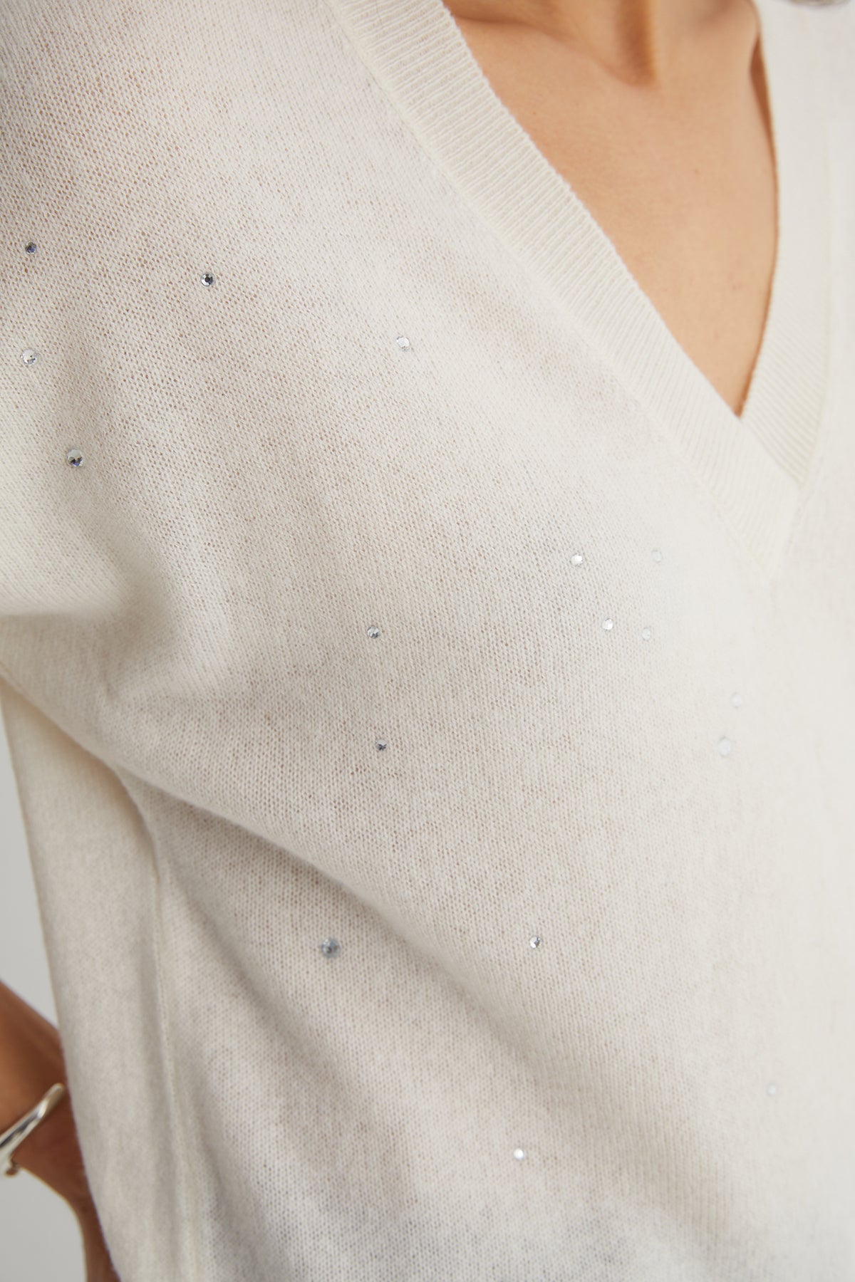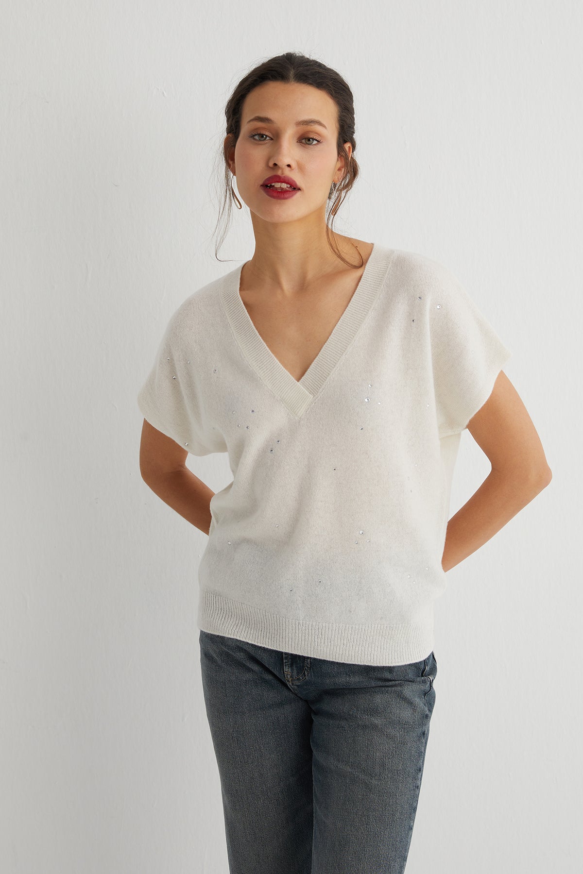 Saf kaşmirin doğallığını, ışığı zarifçe yansıtan kristal taşlarla buluşturan bu özel triko, gardırobunuza sade ama etkileyici bir dokunuş katmak için tasarlandı. V yaka formu ve yumuşacık dokusu sayesinde hem konfor hem de özenli bir duruş sunar.