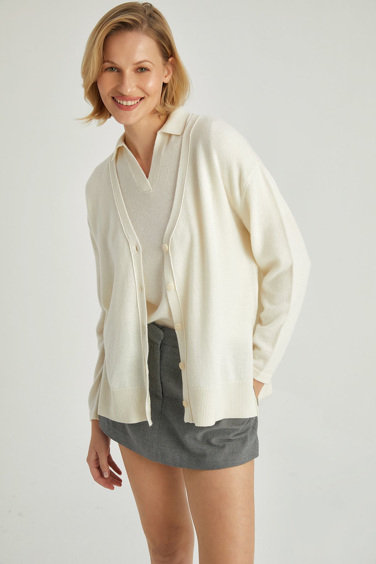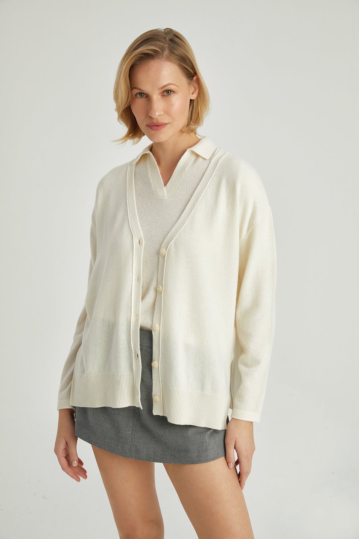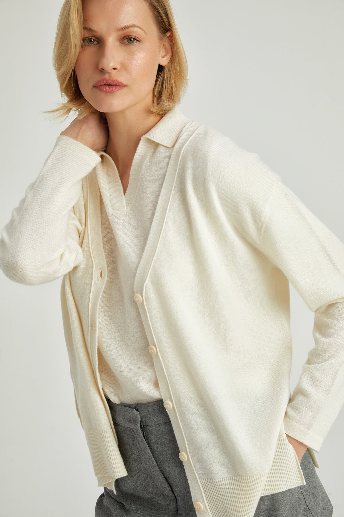 Ekru Lilly Saf Kaşmir V Yaka Hırka