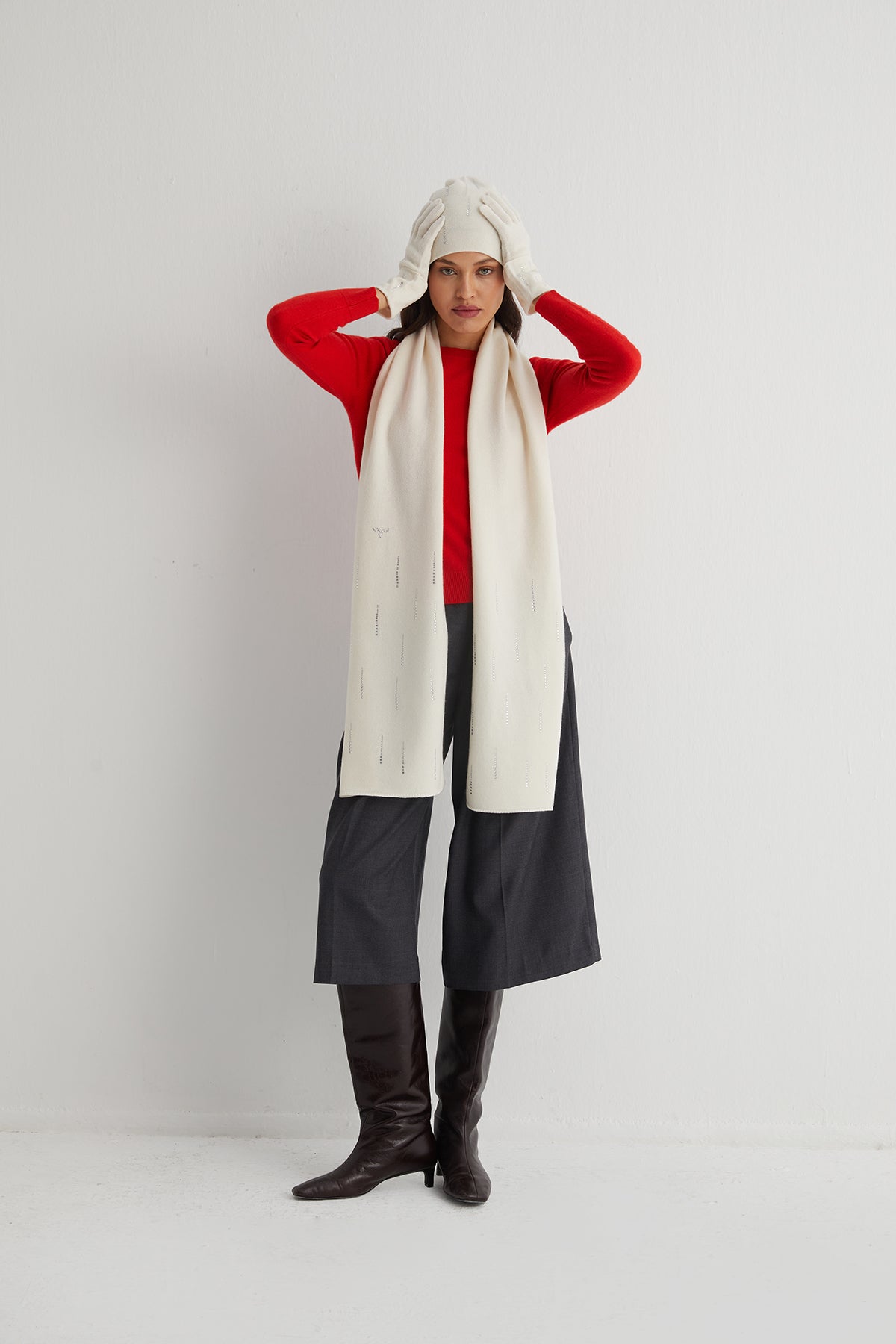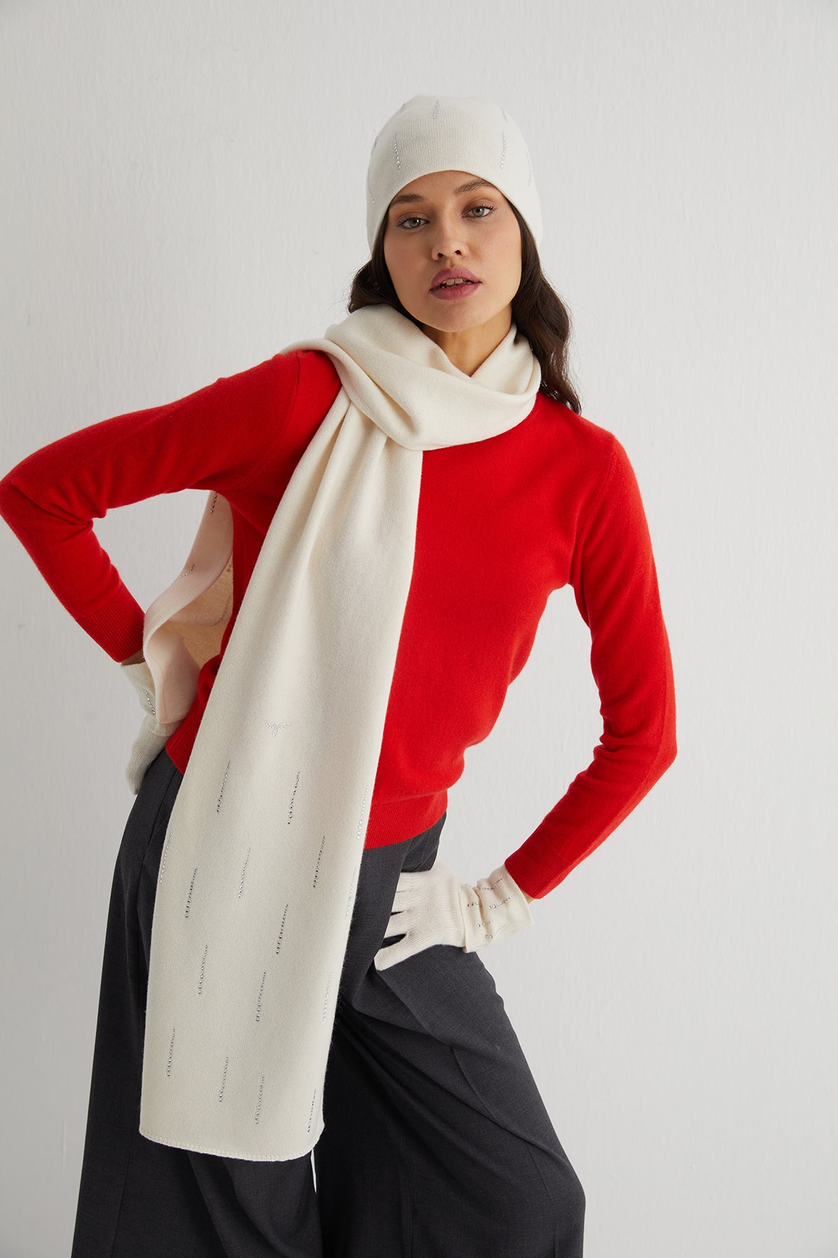 Lucia Taşlı Atkı, yalın ve zamansız bir formu göz alıcı detaylarla buluşturuyor. Doğal yün ve kaşmir karışımı sayesinde sizi saran sıcaklık hissi, taş süslemelerle zarif bir görselliğe dönüşüyor. Ekru tonun huzur veren etkisiyle, stilinize ışıltılı bir sadelik katar. Soğuk günlerde yalnızca bir aksesuar değil, aynı zamanda yumuşacık bir eşlikçi arıyorsanız, Lucia tam size göre.