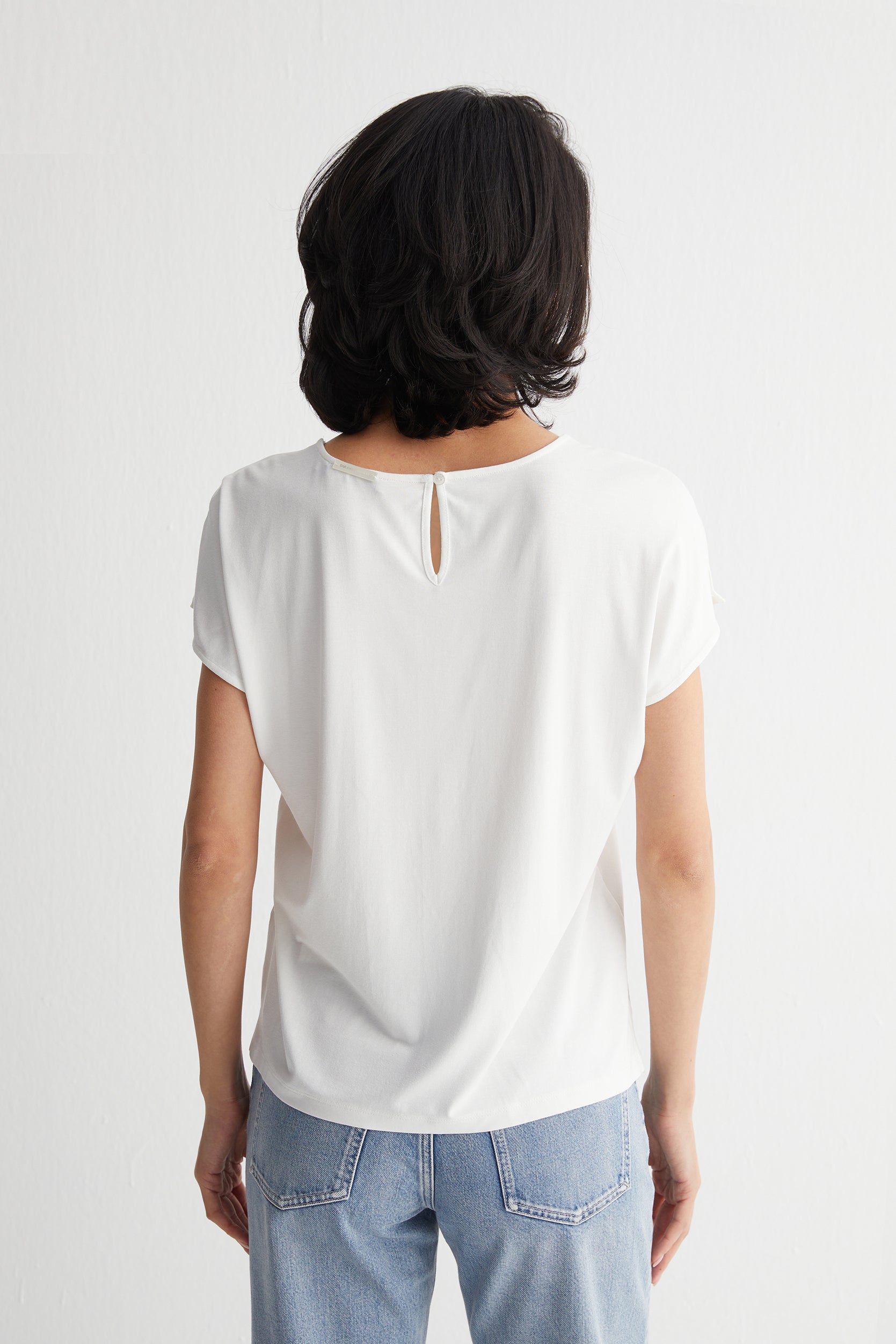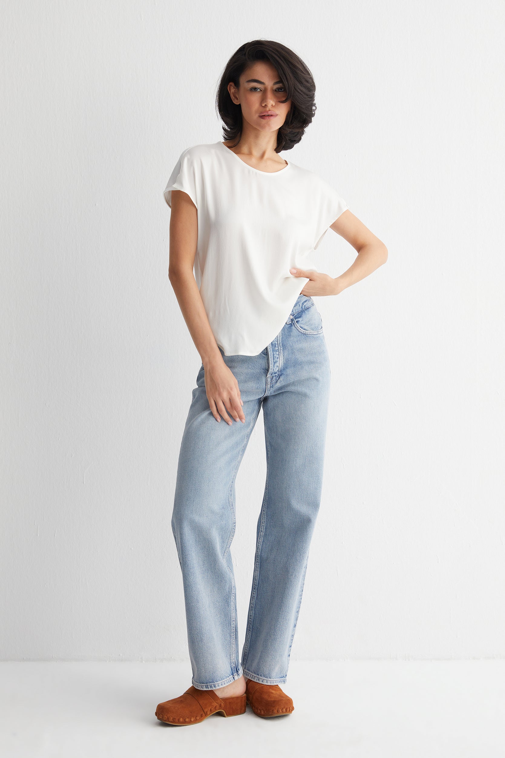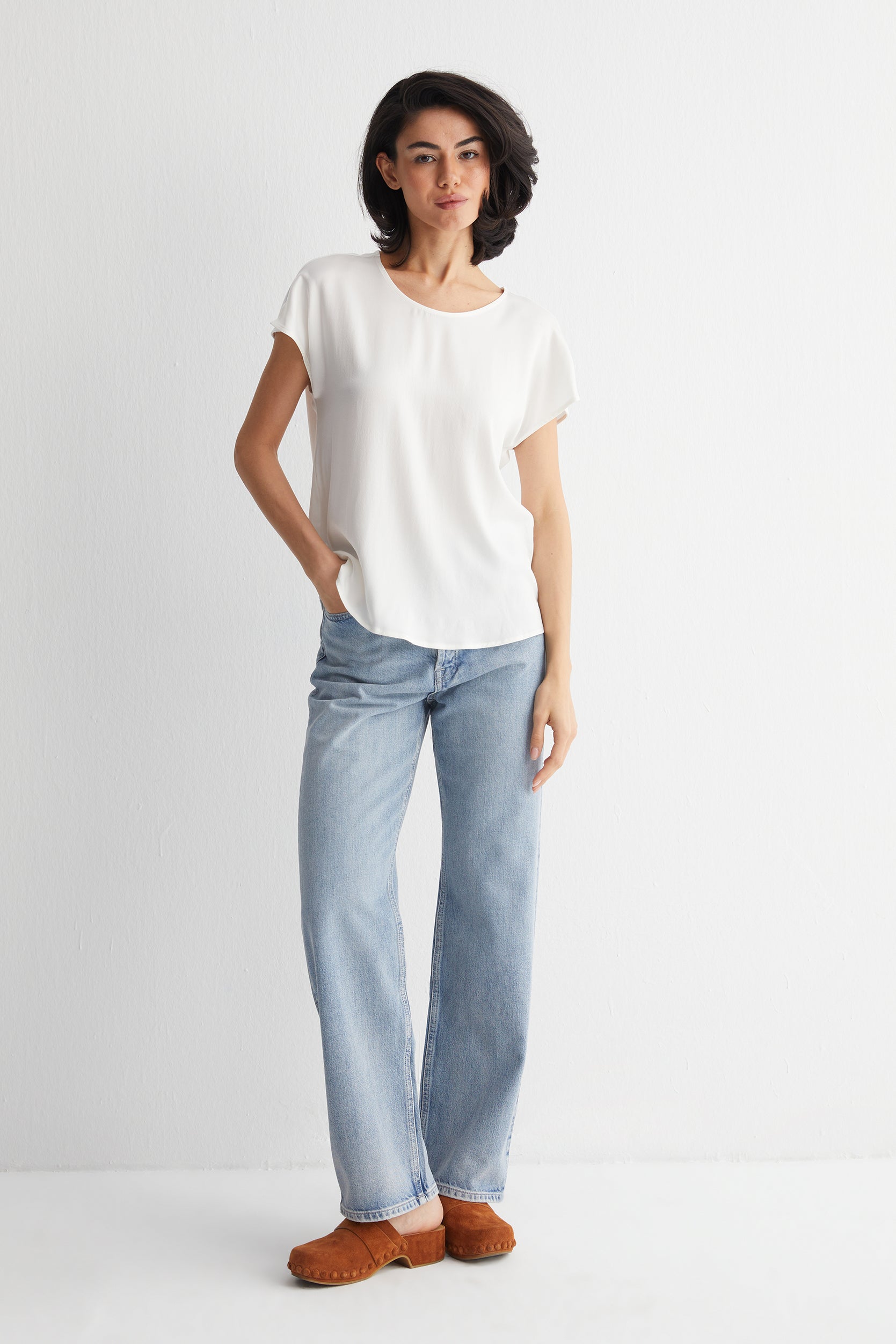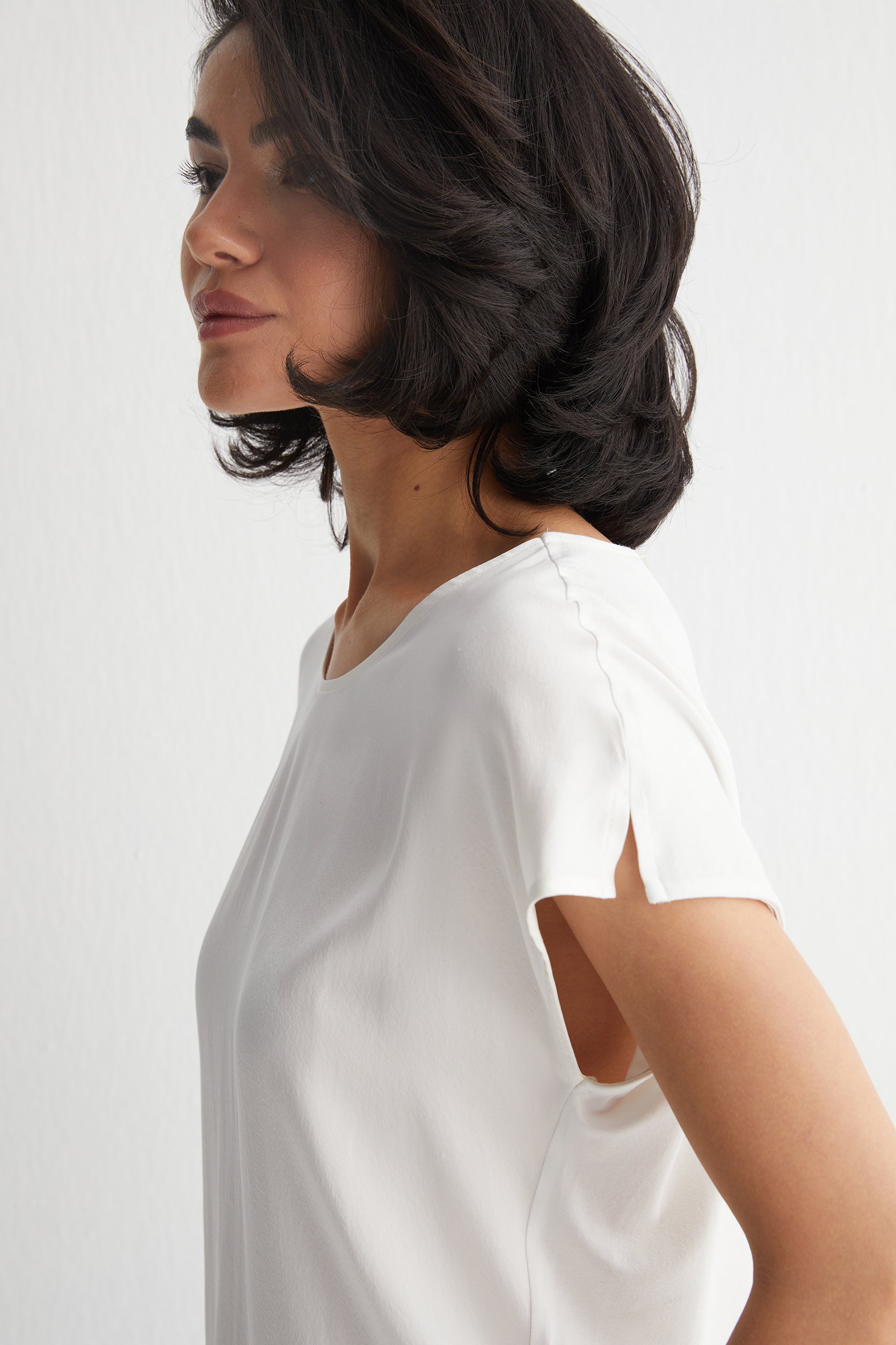Ekru Monica İpekli Bluz, %95 ipek karışımı ile yumuşak bir dokunuş sunarken, viskoz elastan karışımı sayesinde esneklik ve rahatlık sağlar. Zarif tasarımı ve sade şıklığıyla dikkat çeken bu bluz, her ortamda sofistike bir görünüm yaratmak isteyenler için ideal bir seçimdir.