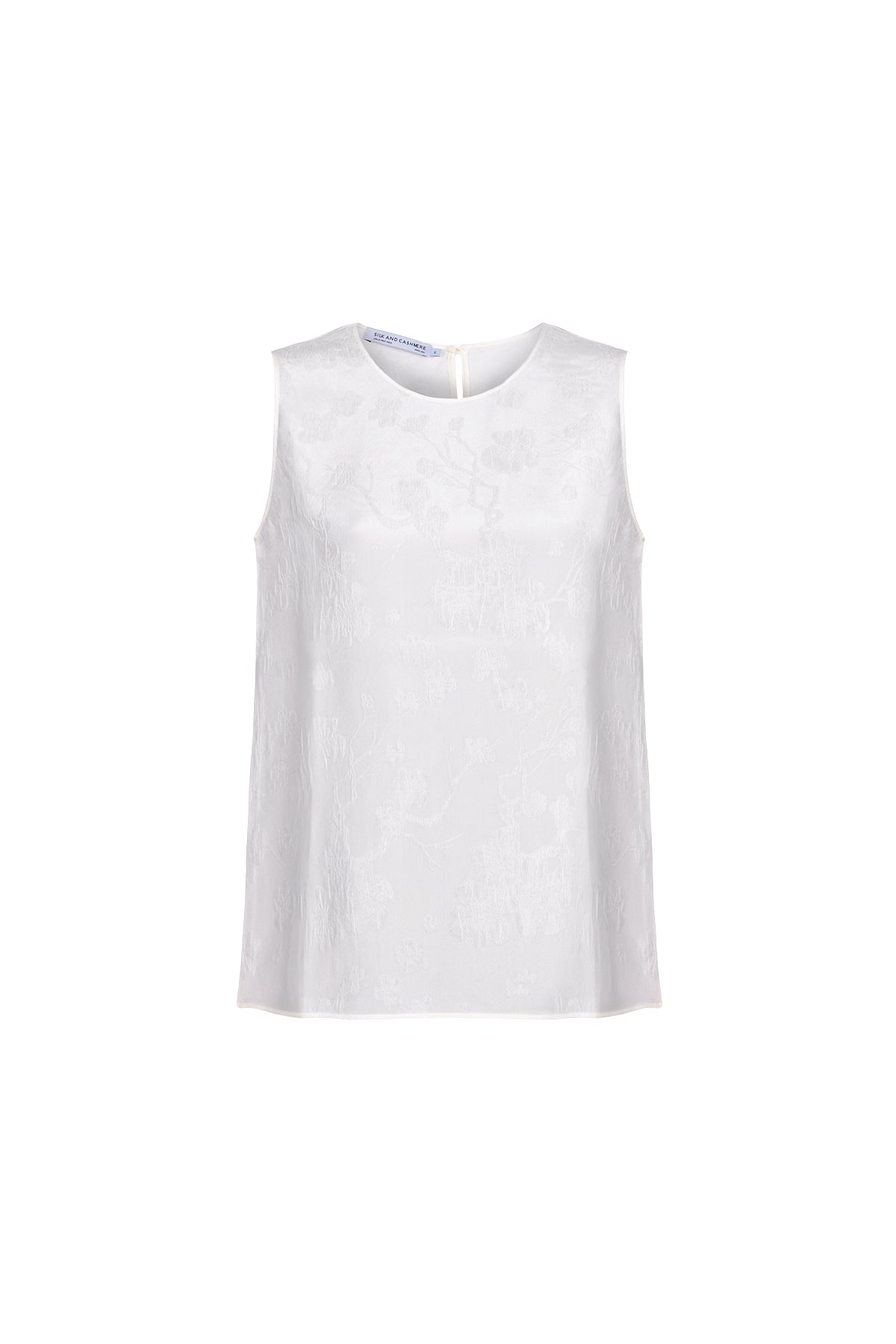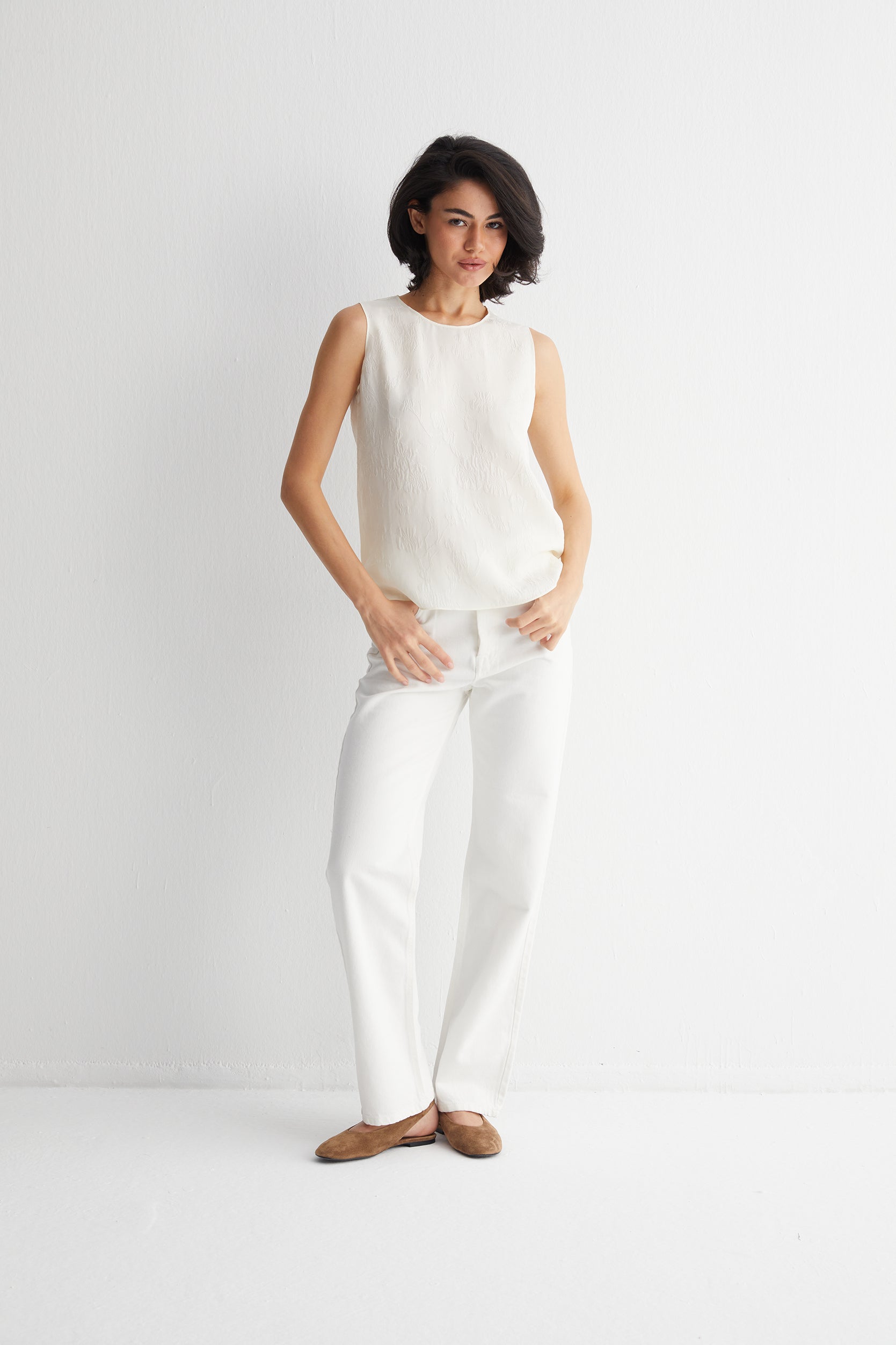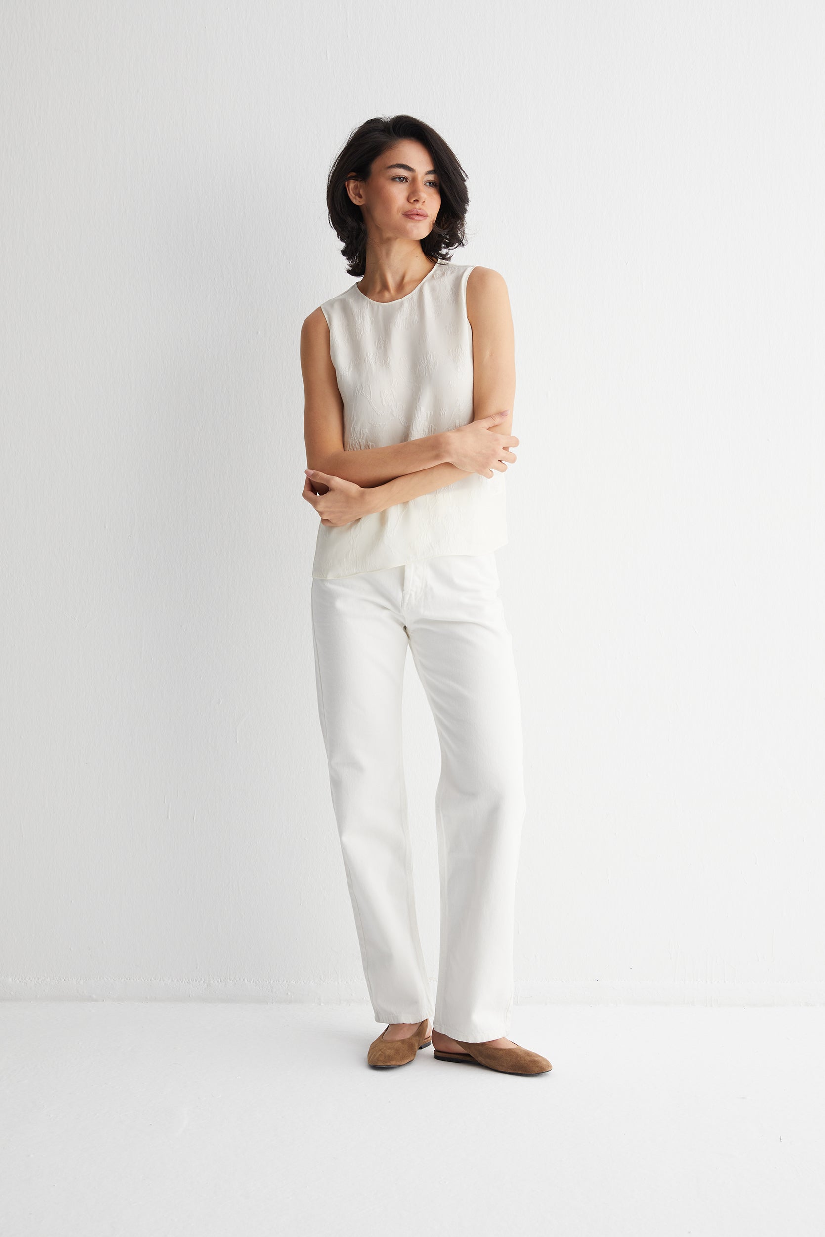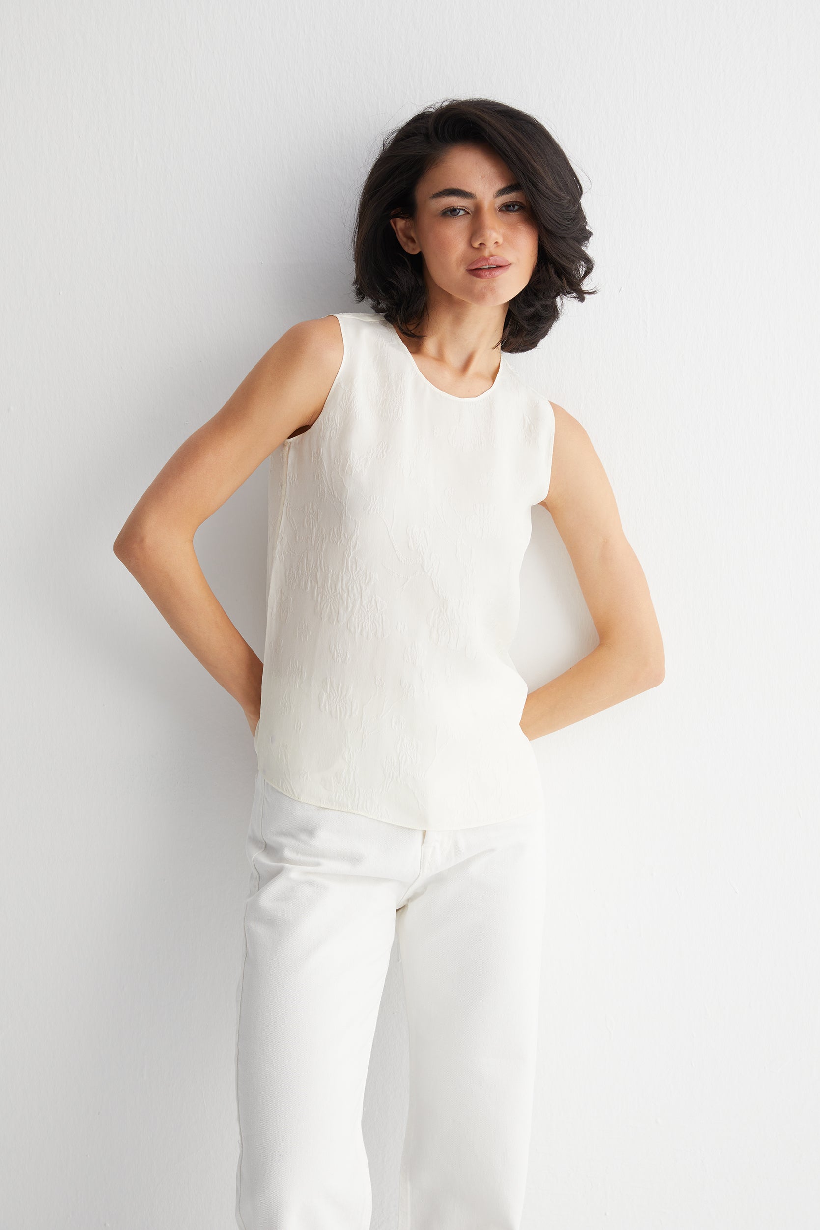 Ekru Toscana Saf İpek Yuvarlak Yaka Kolsuz Bluz