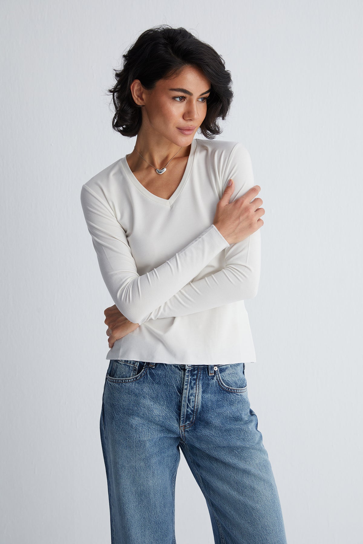 Doğadan ilham alan materyalleriyle öne çıkan bu ultralight V yaka üst, hafifliği ve yumuşak dokusuyla günün her anında konfor sunar. Ekru tonunun zamansız zarafetiyle sade ama etkileyici bir duruş yakalamak isteyenler için ideal bir tamamlayıcıdır.